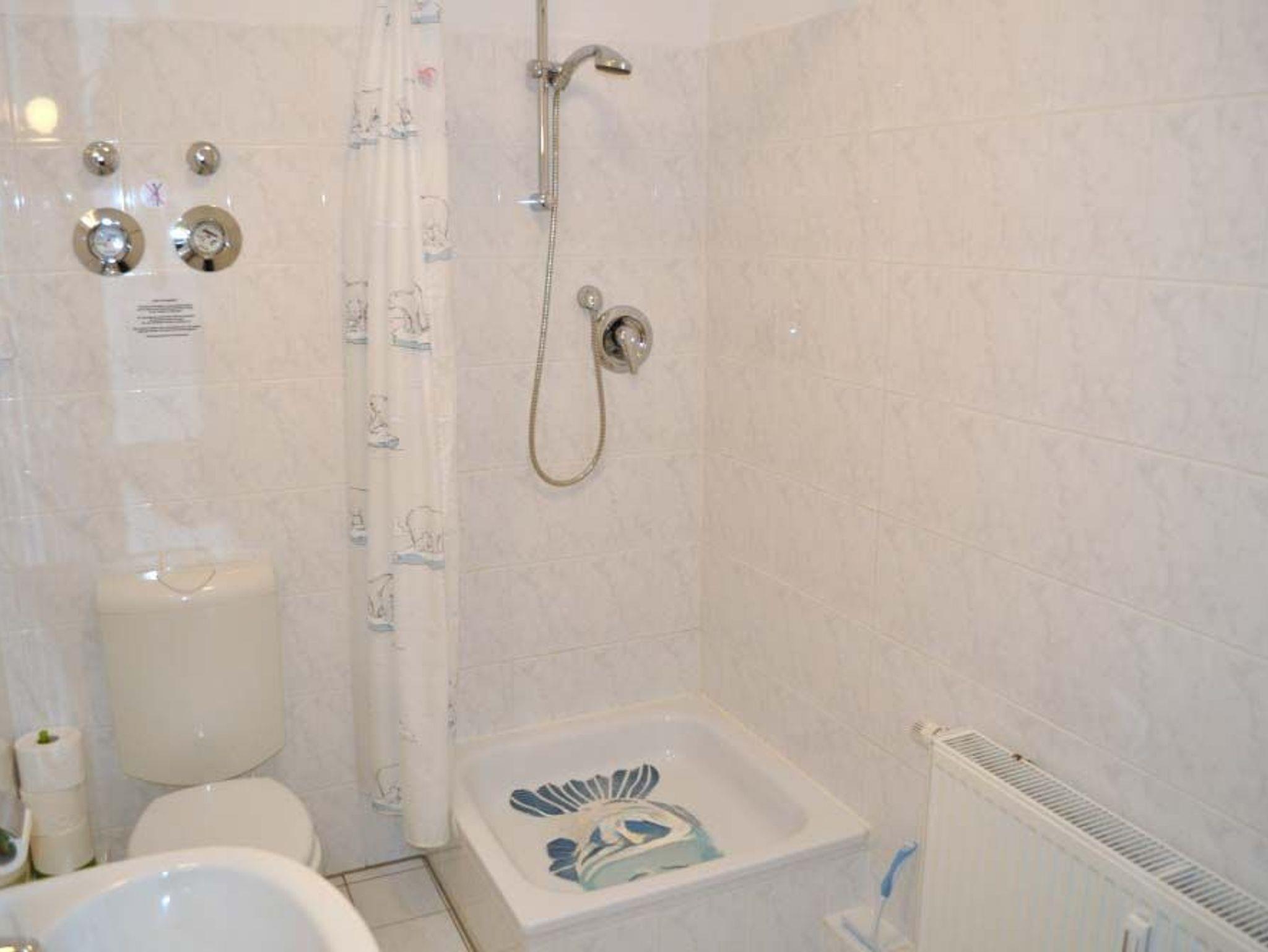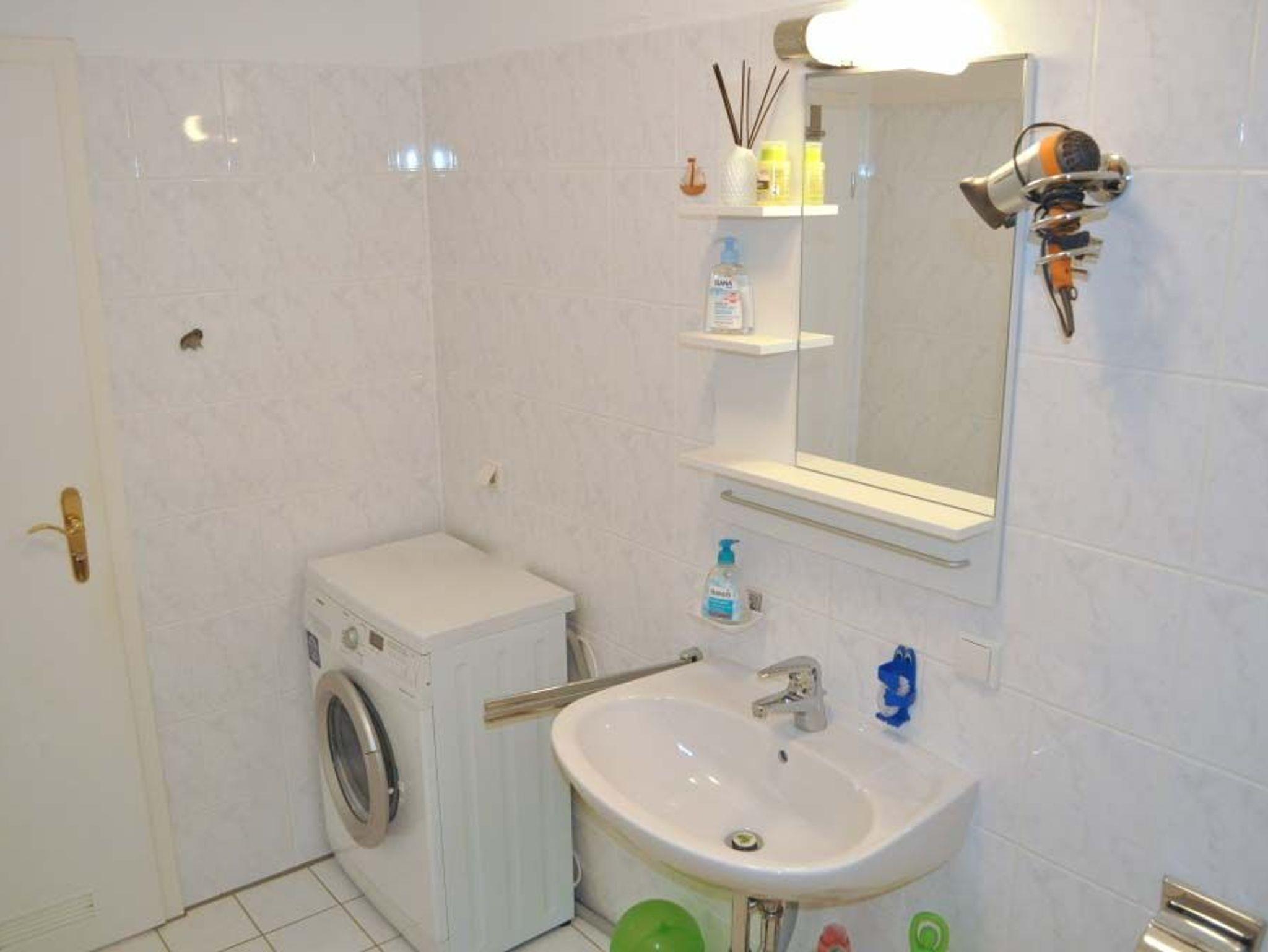 Bad 1: Dusche, Fön, Hocker, Spiegel, Waschbecken, Wäschewanne, Waschmaschine, WC