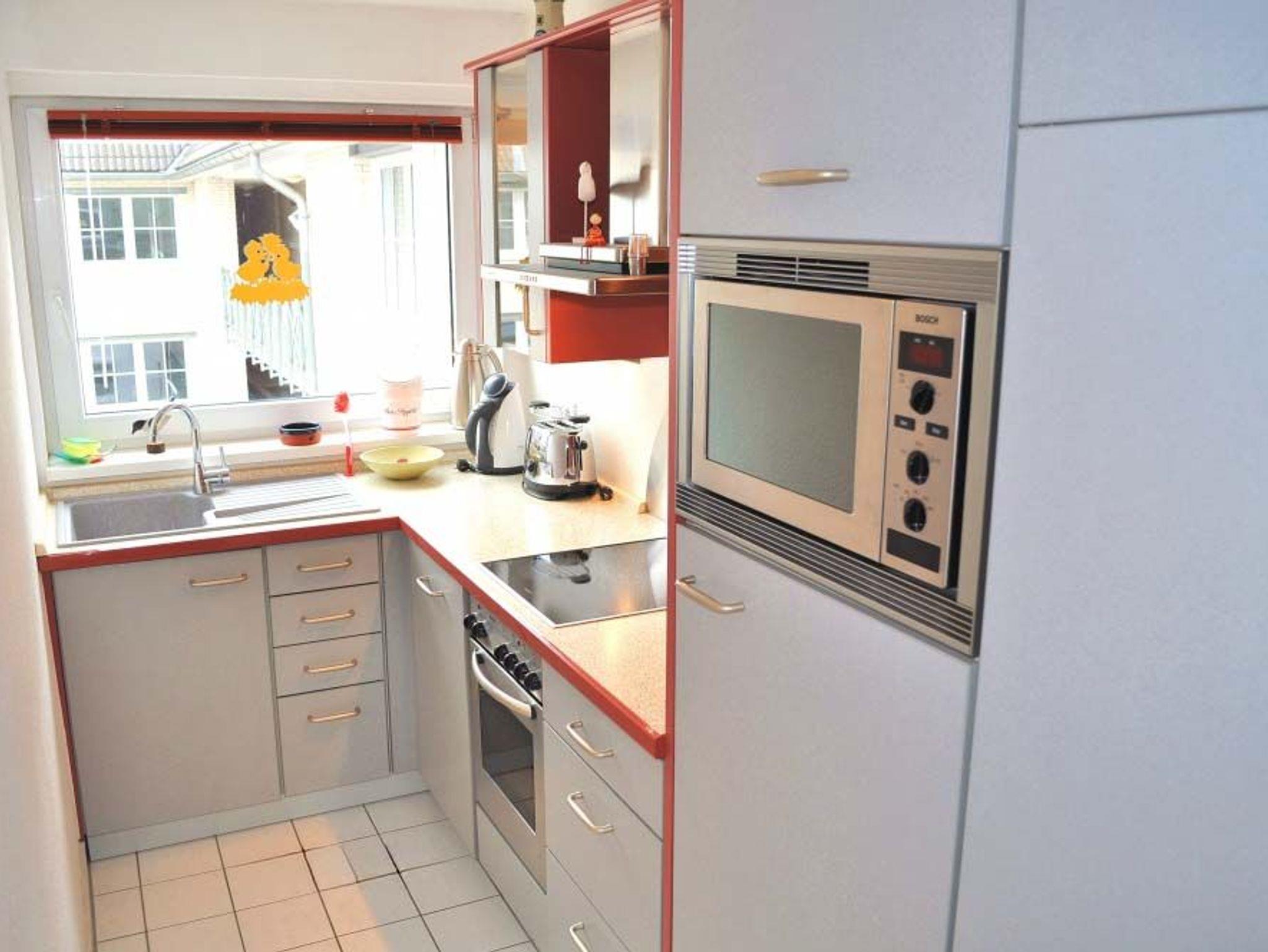 Küche: 4 Plattenherd mit Ceranfeld und Backofen, Dunstabzugshaube, E-Grill, Einbauküche, Geschirr, Handmixer, Kaffeemaschine, Kochtöpfe, Kühlschrank mit 3* Gefrierfach, Mikrowelle, Spülmaschine, Toaster, Wasserkocher
