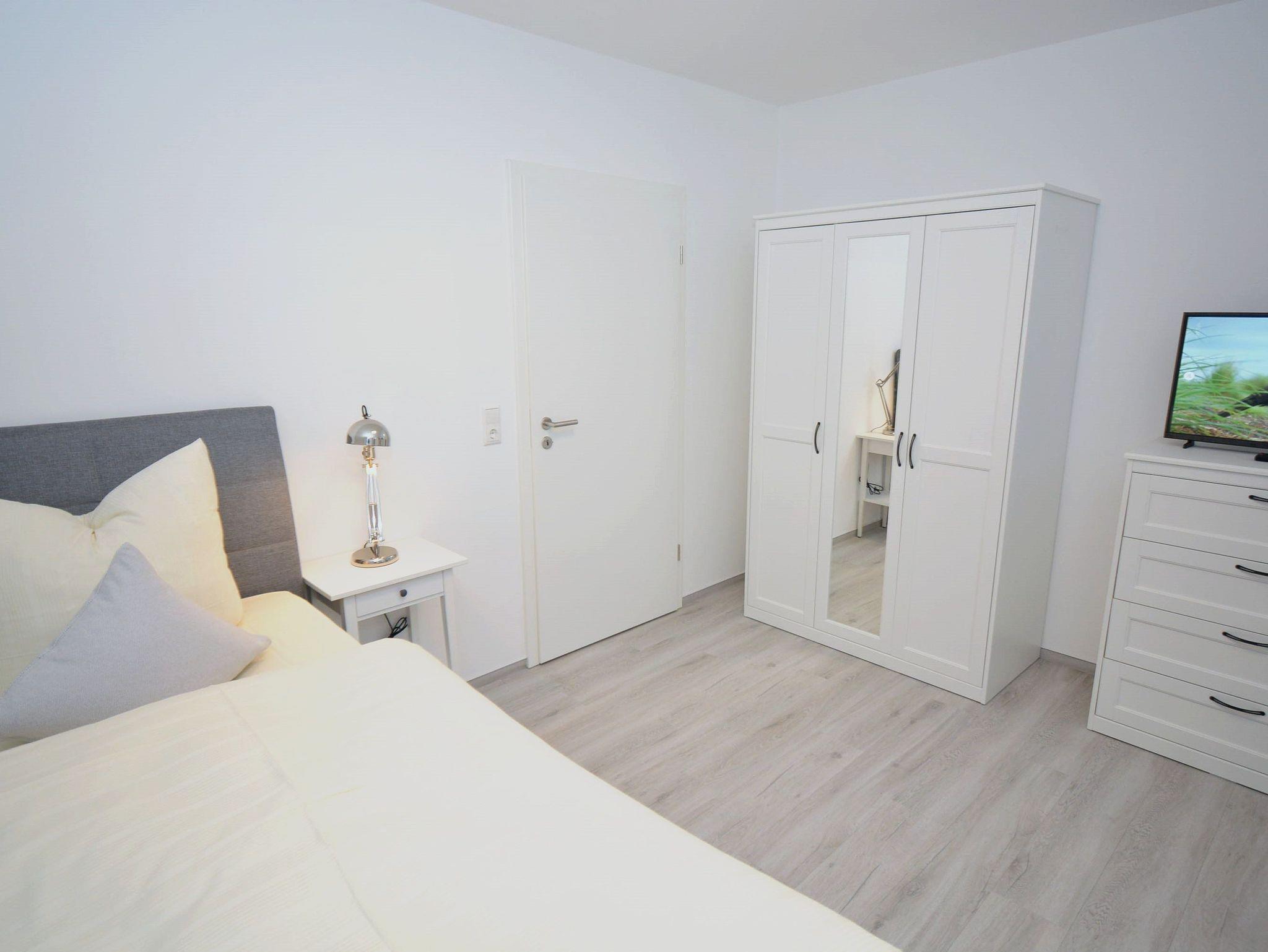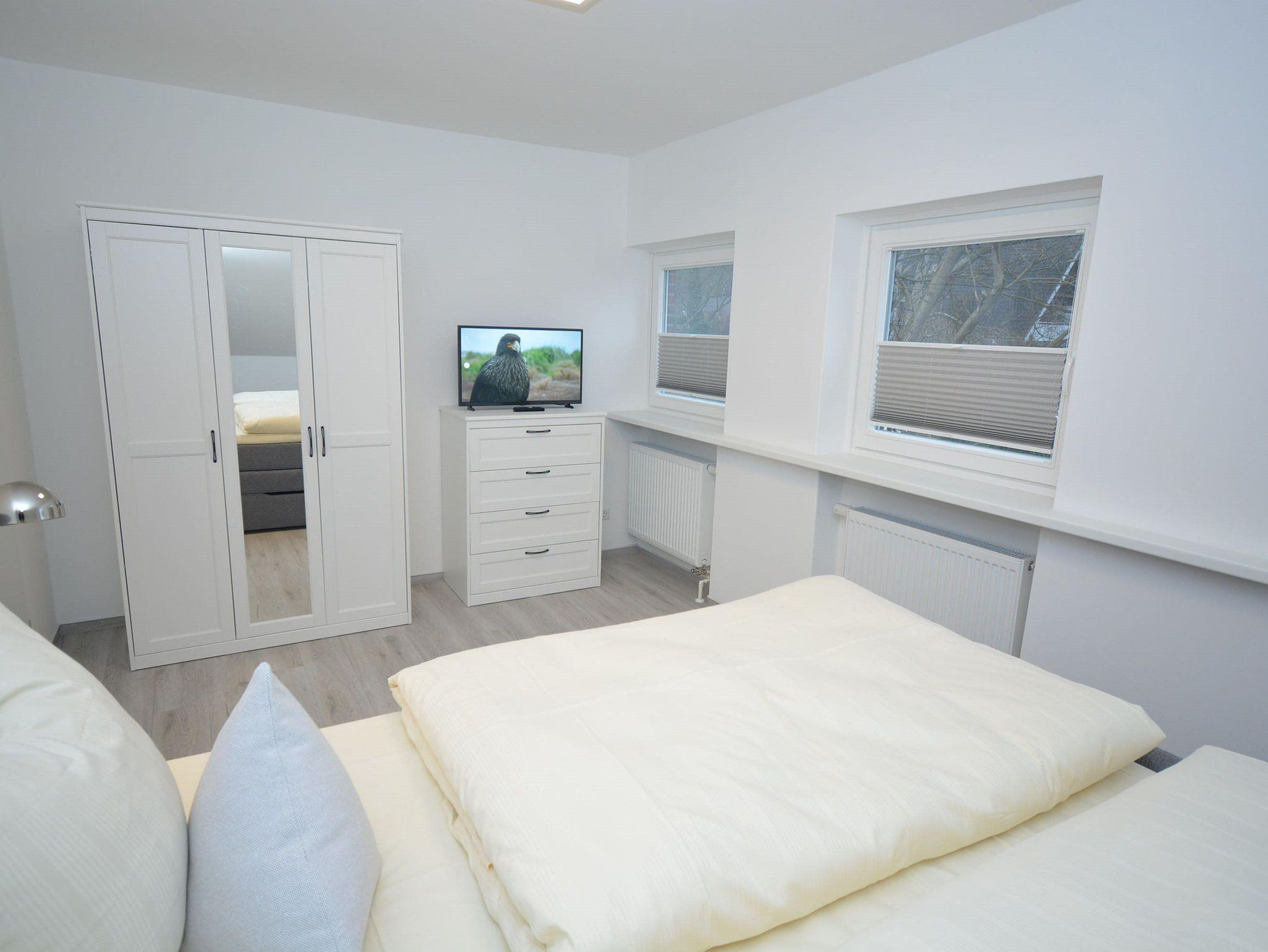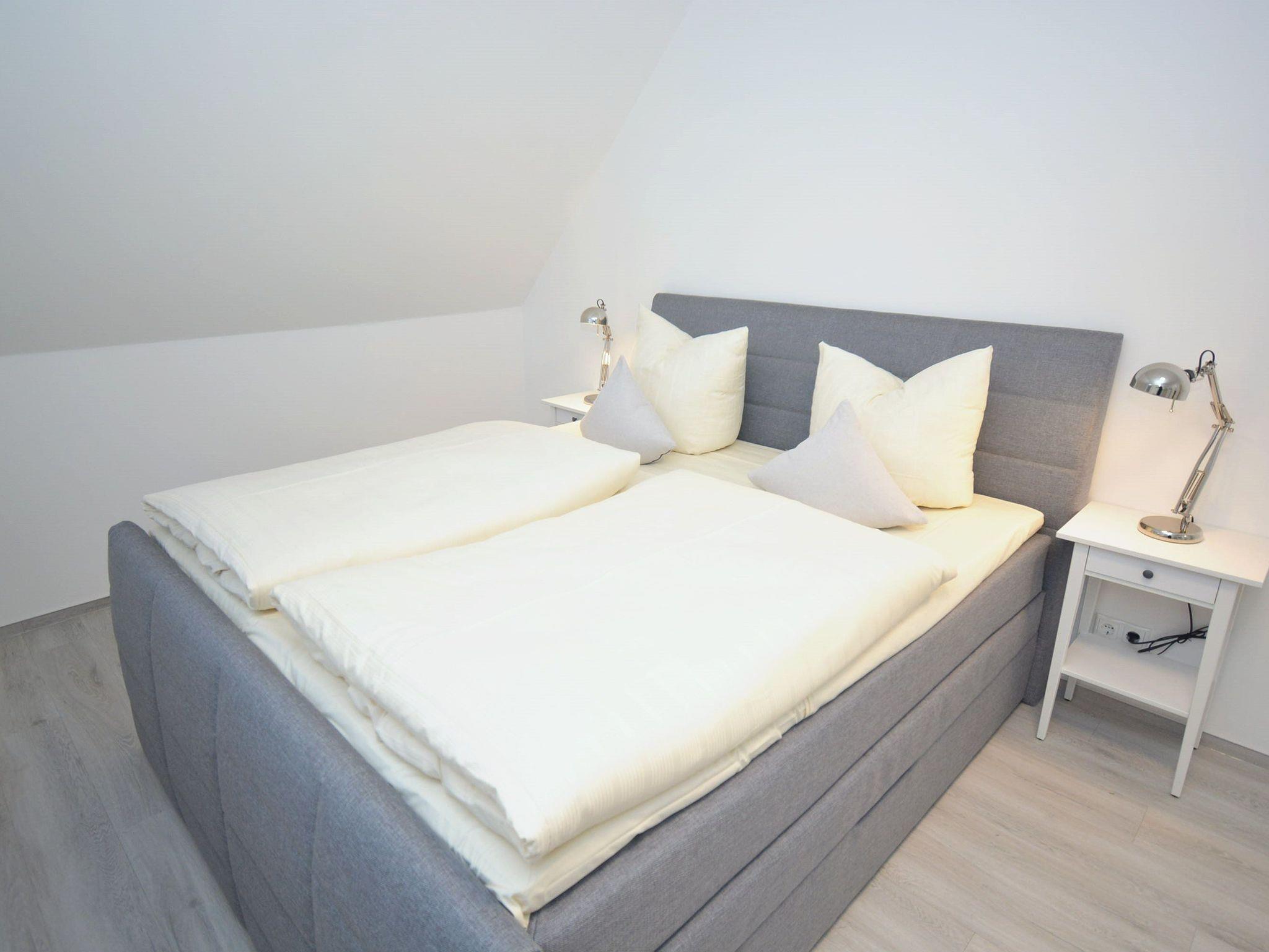 Schlafzimmer 1: Kleiderschrank, 1 Matratze, 2 Nachttische, 2 Nachttischlampen, Boxspringbett 2,00 x 1,80, Flachbildschirm, Kabel-TV, Kommode, Verdunklungsplissee