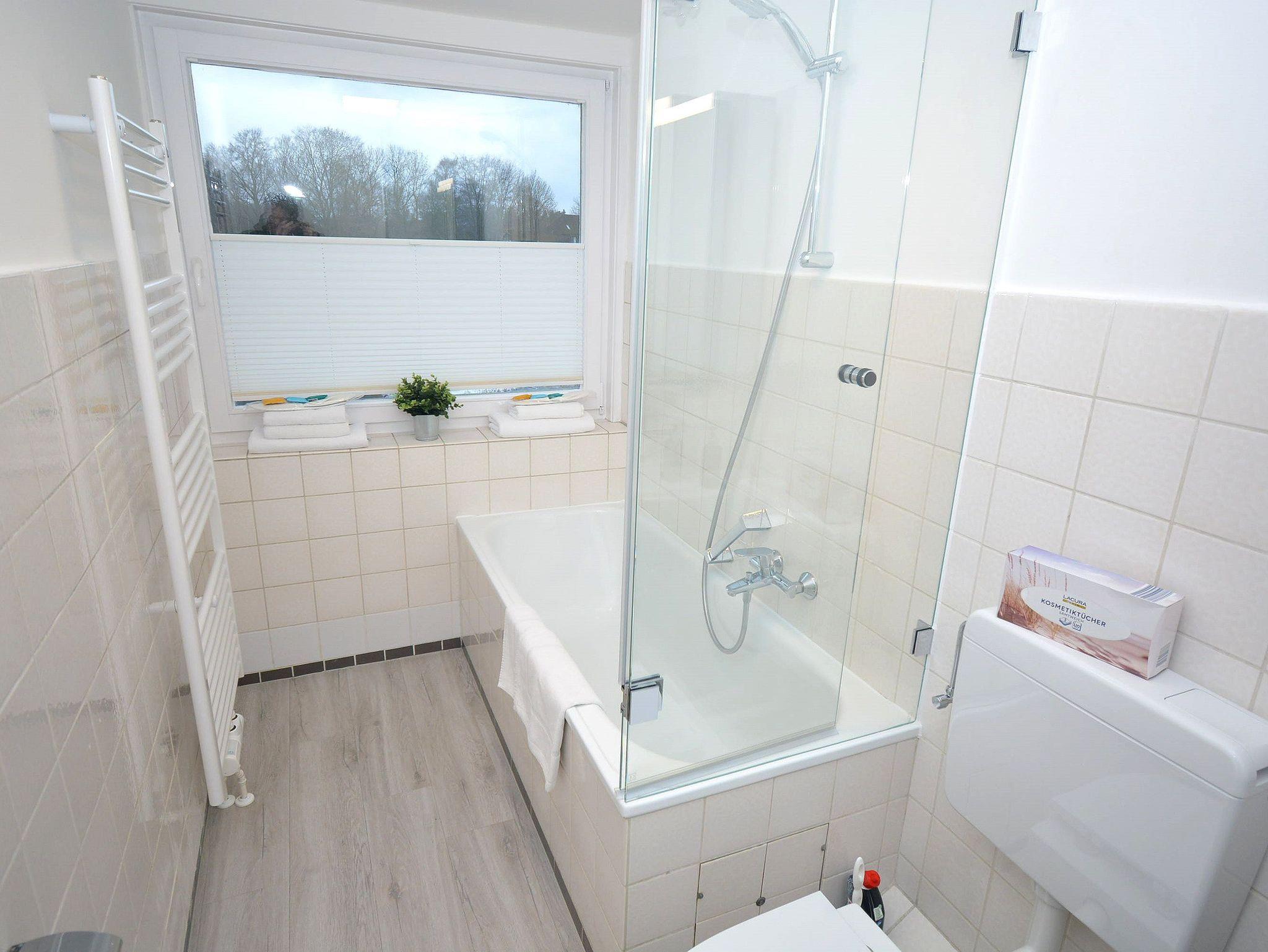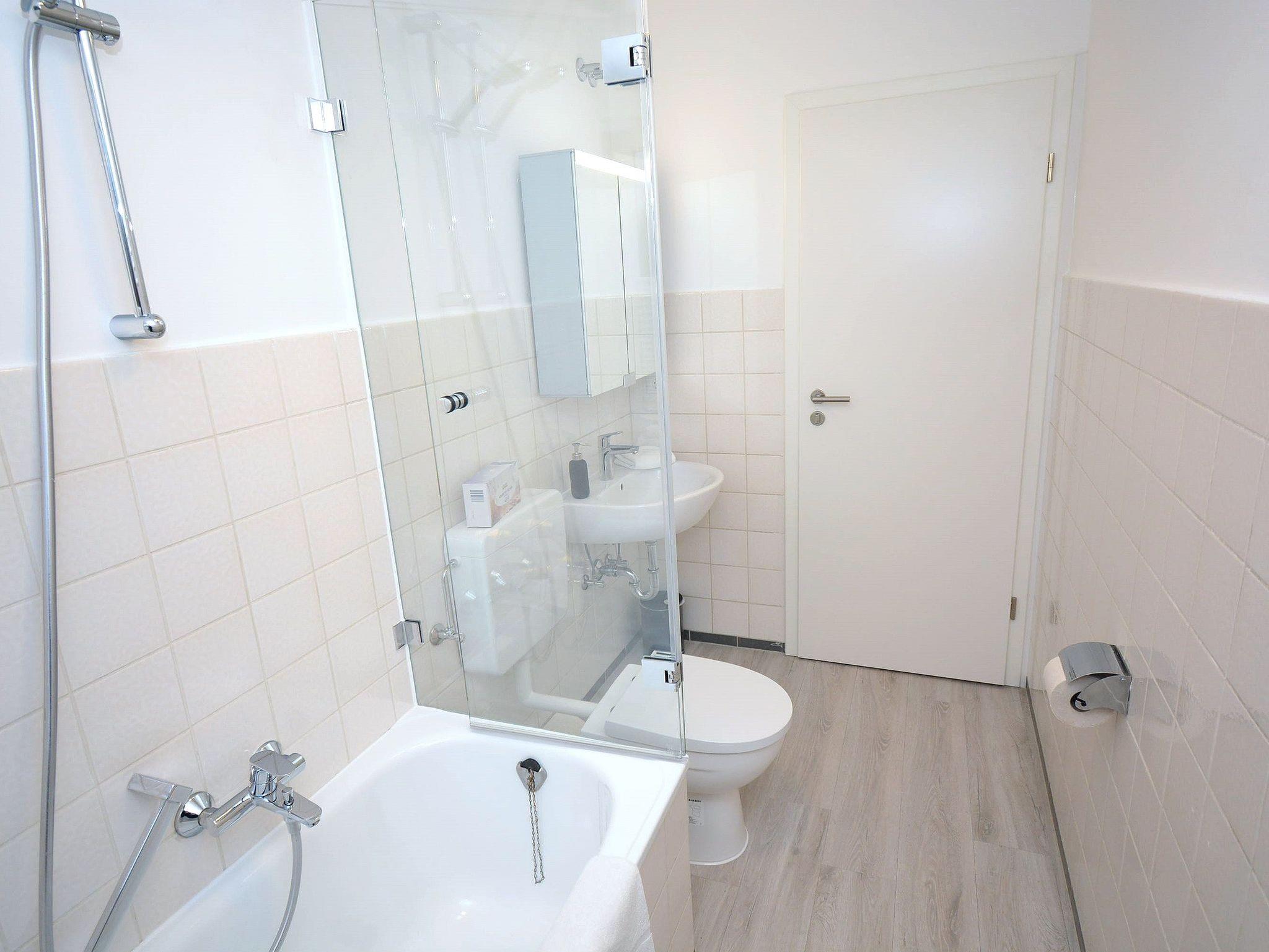 Bad 1: Badewanne, Fön, Duschwand, Spiegelschrank, Waschbecken, WC, 1 Sichtschutzplissee