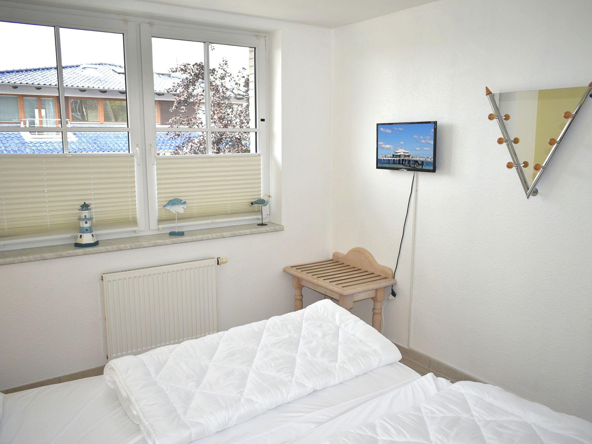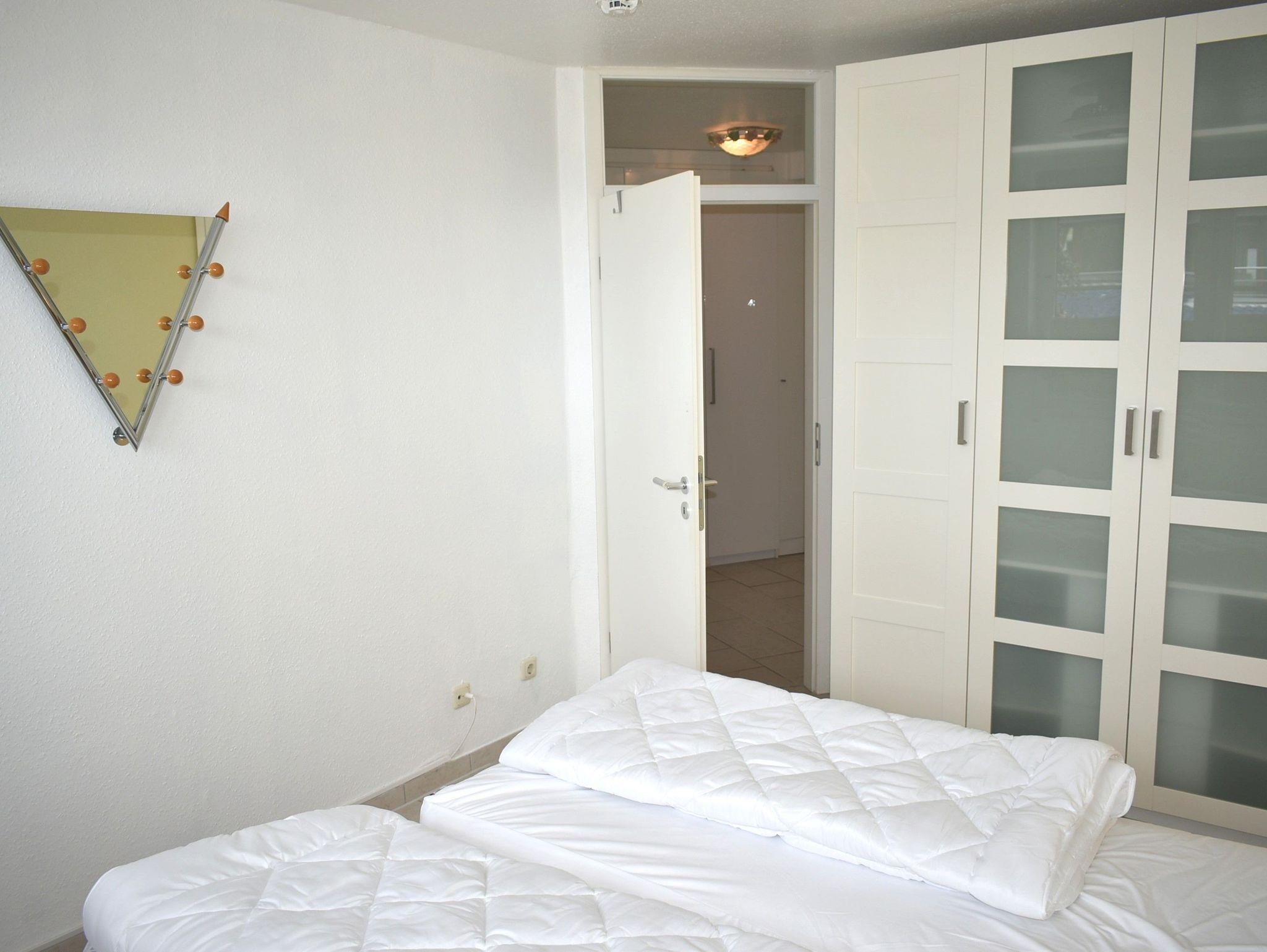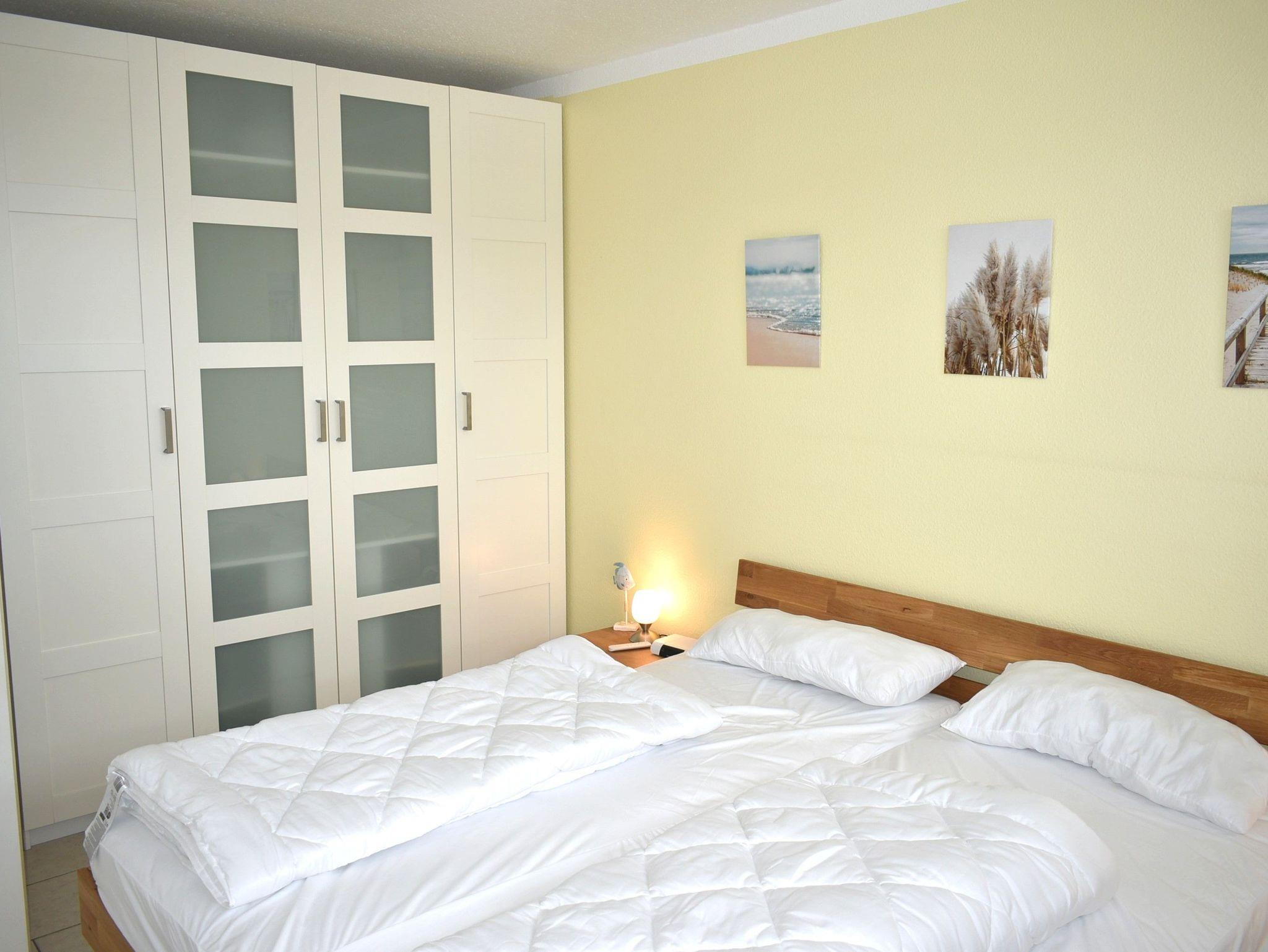 Schlafzimmer 1: Doppelbett 2,00 x 1,80m, 2 Matratzen, Kabel-TV, Flachbildschirm, Kofferablage, 2 Nachttische, Radiowecker, Schrank, Spiegel, Verdunklungsplissee, Deckenlampe mit Ventilator