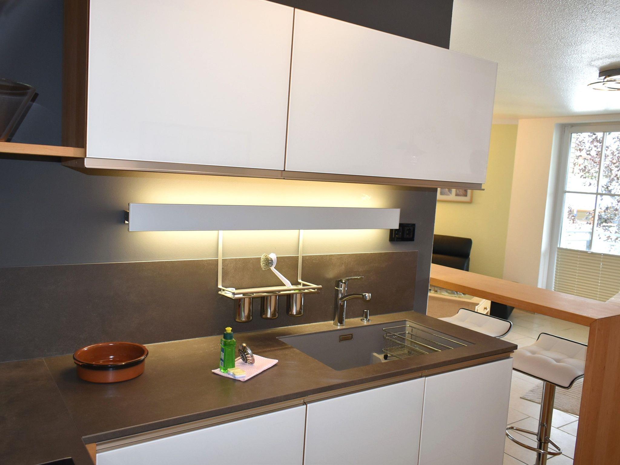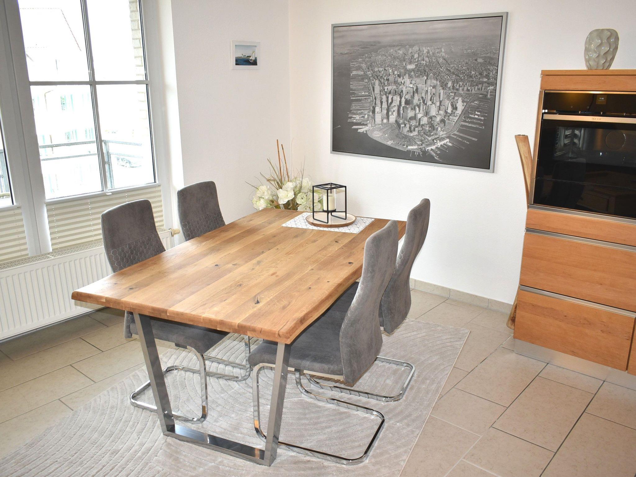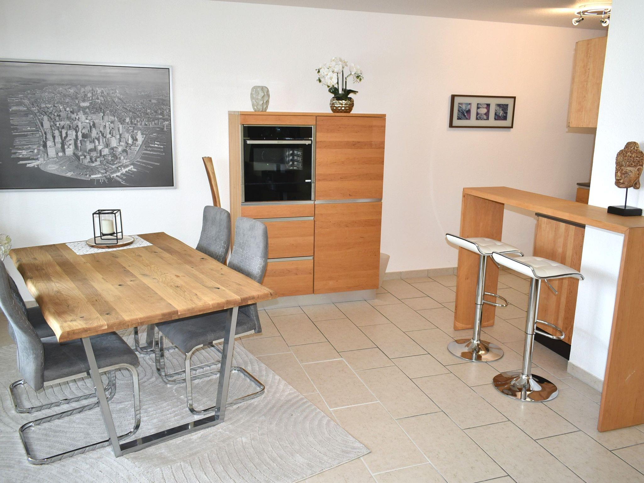 Wohnzimmer: 4 Plattenherd mit Ceranfeld, 4 Stühle, 2 Barhocker, Tresen, Anrichte, Couchtisch, Dunstabzugshaube, Esstisch, Flachbildschirm, Geschirr, Kabel-TV, Kaffeemaschine, Kochtöpfe, Küchenzeile, Kühlschrank mit 3* Gefrierfach, Ledereckschlafcouch, Mikrowelle, Regal, Spülmaschine, Stehlampe, Stereoanlage mit CD-Player, Toaster, Wasserkocher, Verdunklungsplissee