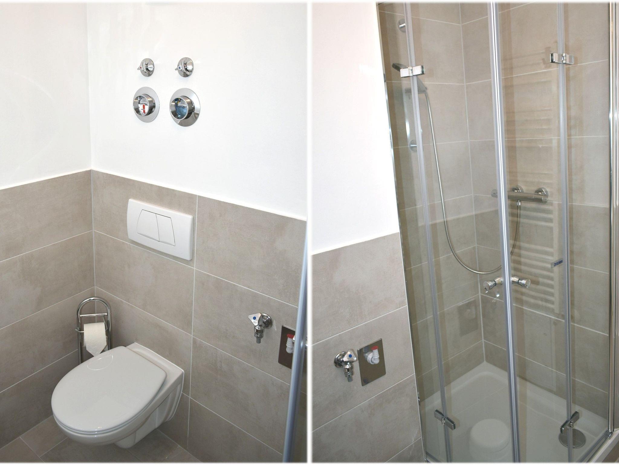 Bad 1: Dusche, Duschkabine, Waschtisch mit Unterschrank, WC, Spiegel