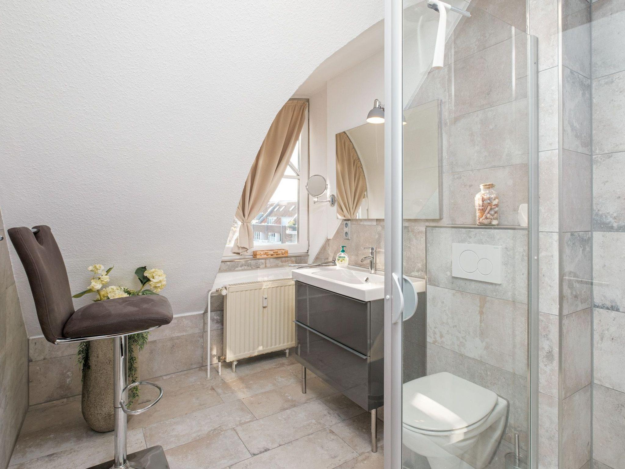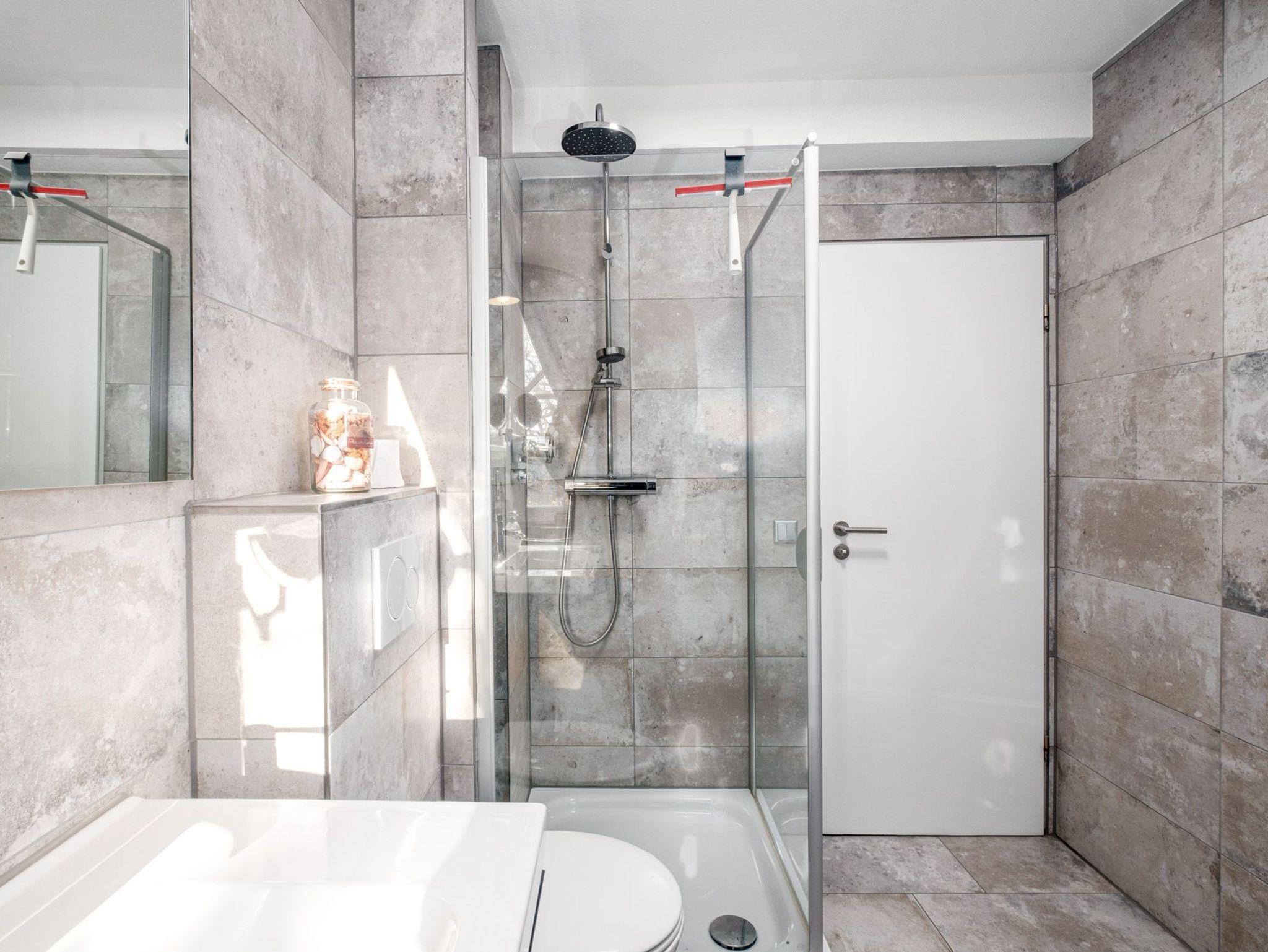 Das moderne Badezimmer verfügt über eine Dusche, WC und einen Fön.