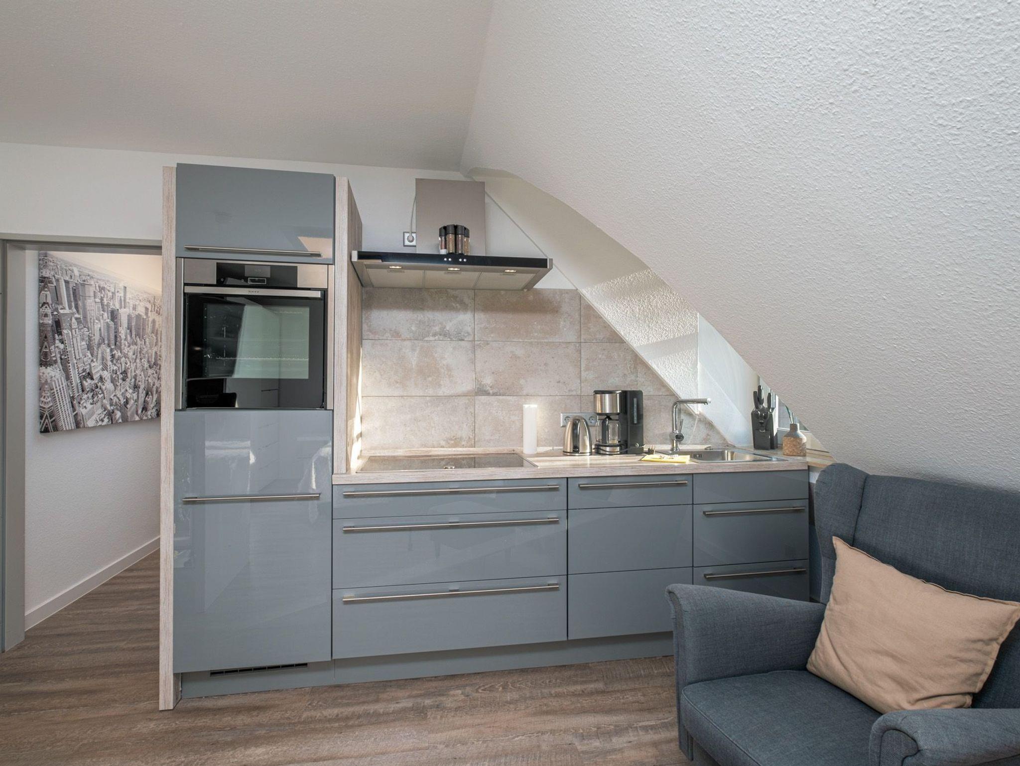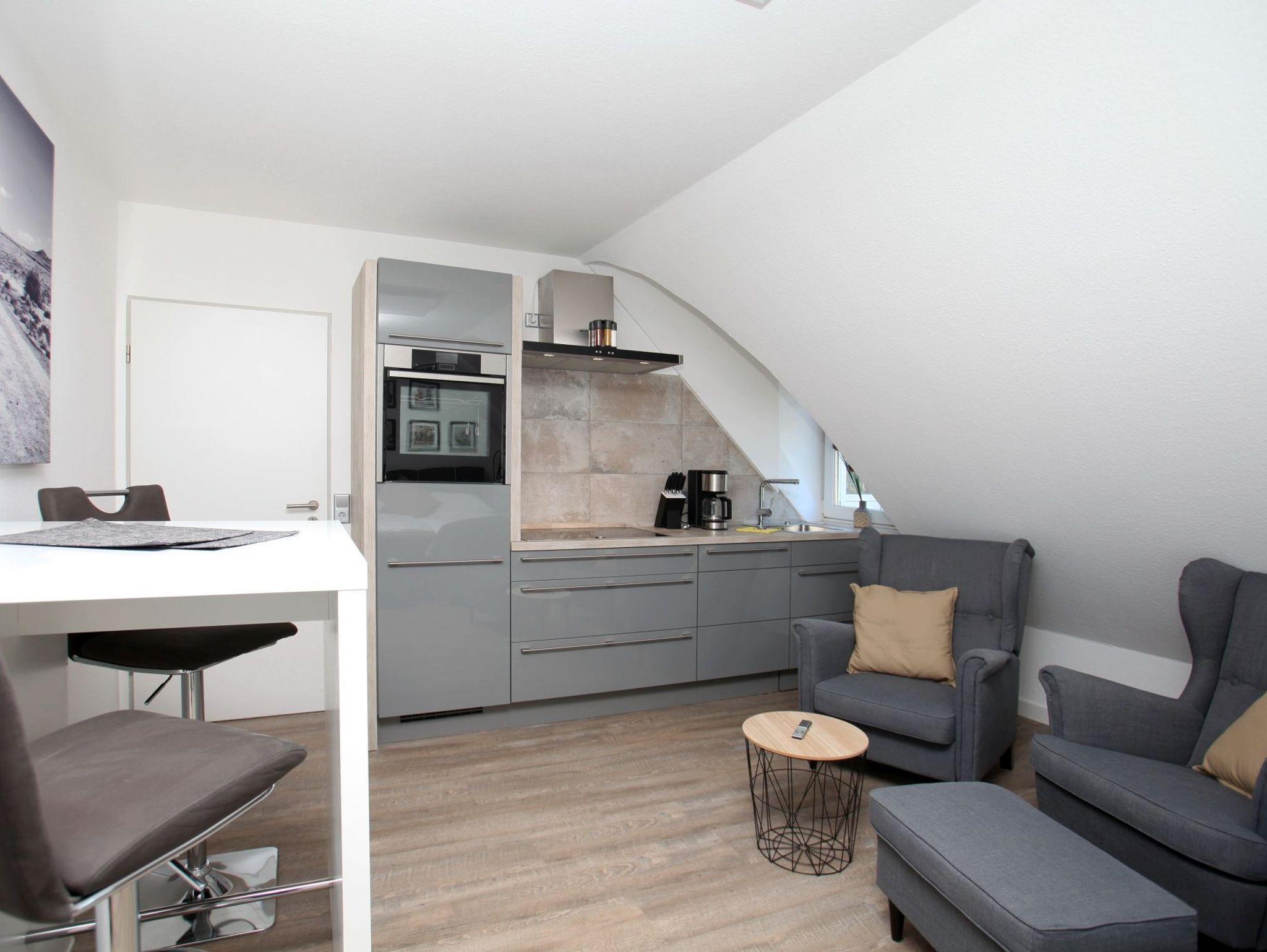 Im Wohnschlafraum ist ein bequemes Doppelboxspringbett sowie eine Essecke und eine integrierte, voll ausgestattete Einbauküche mit Geschirrspüler und Backofen vorhanden.