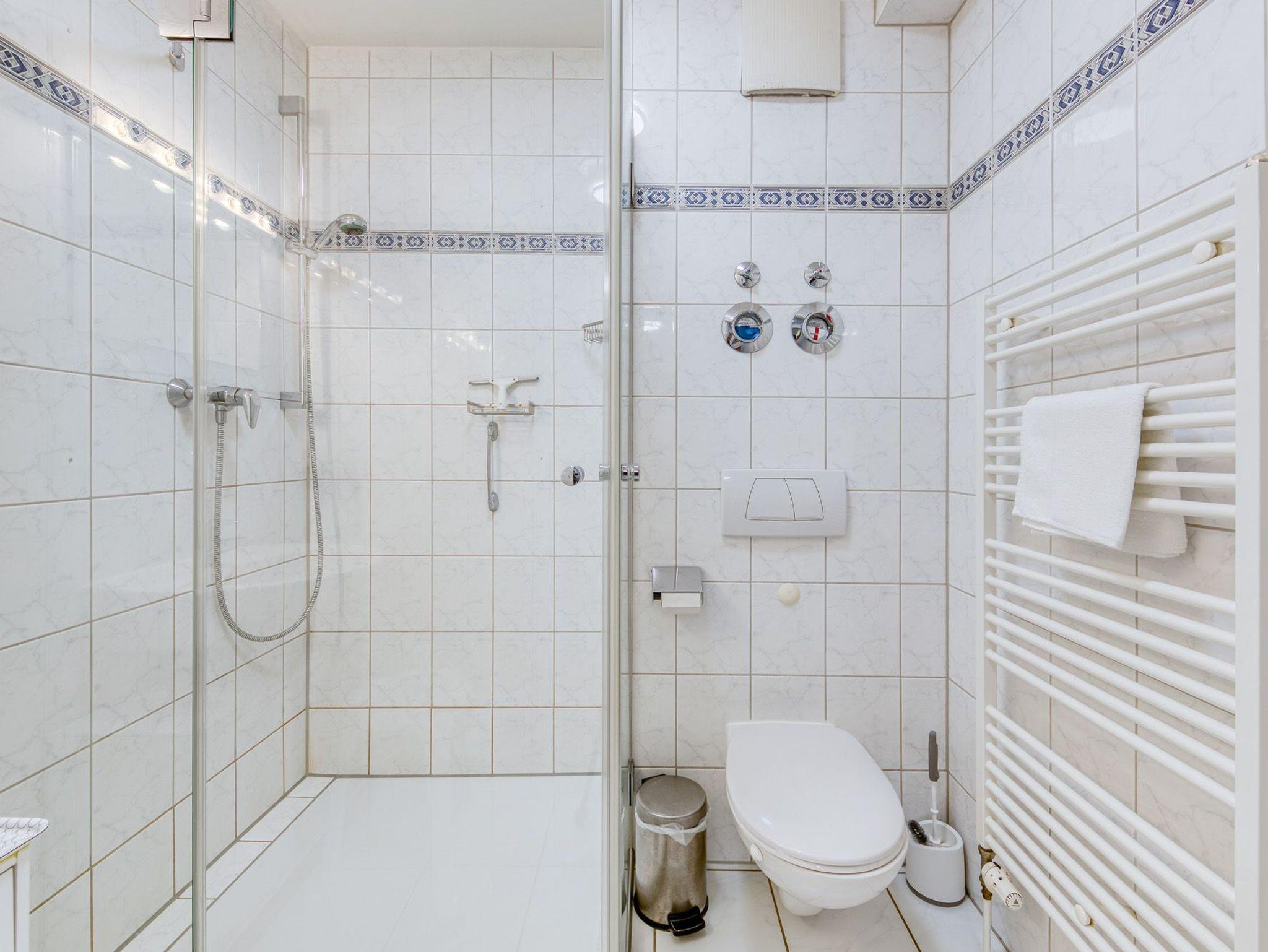 Das Badezimmer ist mit einer Dusche, einer Handtuchtrocknerheizung und einem Fön ausgestattet.