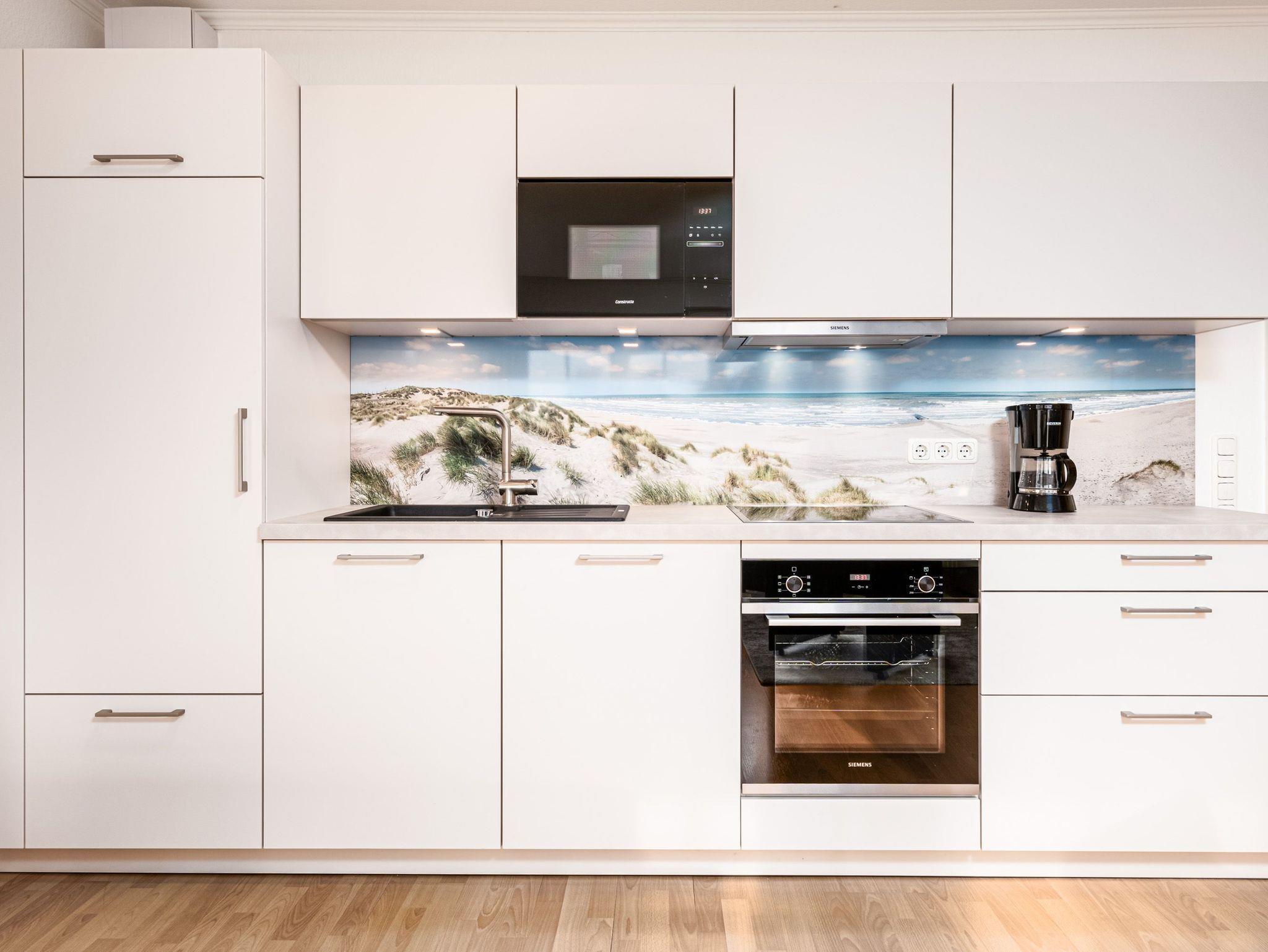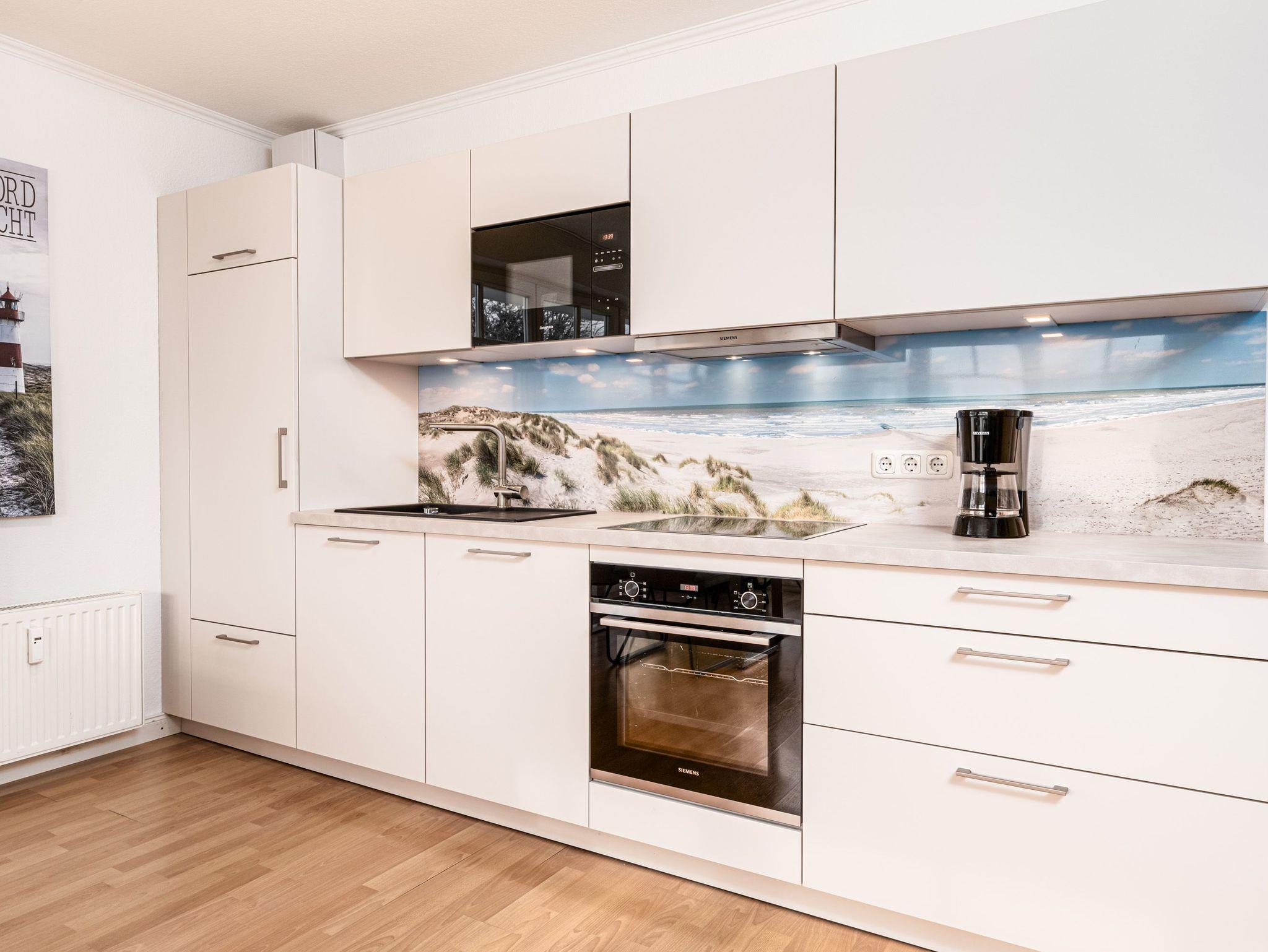 In der integrierten Einbauküche mit Ceranfeld, Backofen, Geschirrspüler und Mikrowelle bereiten Sie schmackhafte Speisen vor, die Sie gemeinsam im Essbereich zu sich nehmen können.