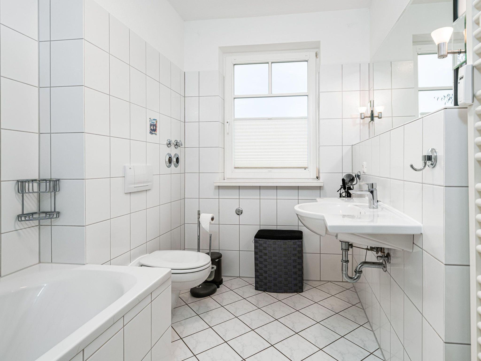 Im hellen Badezimmer können Sie sich bei einem Bad in der Badewanne entspannen. Des Weiteren verfügt der Waschraum über ein WC, Fön und einen Handtuchwärmer.