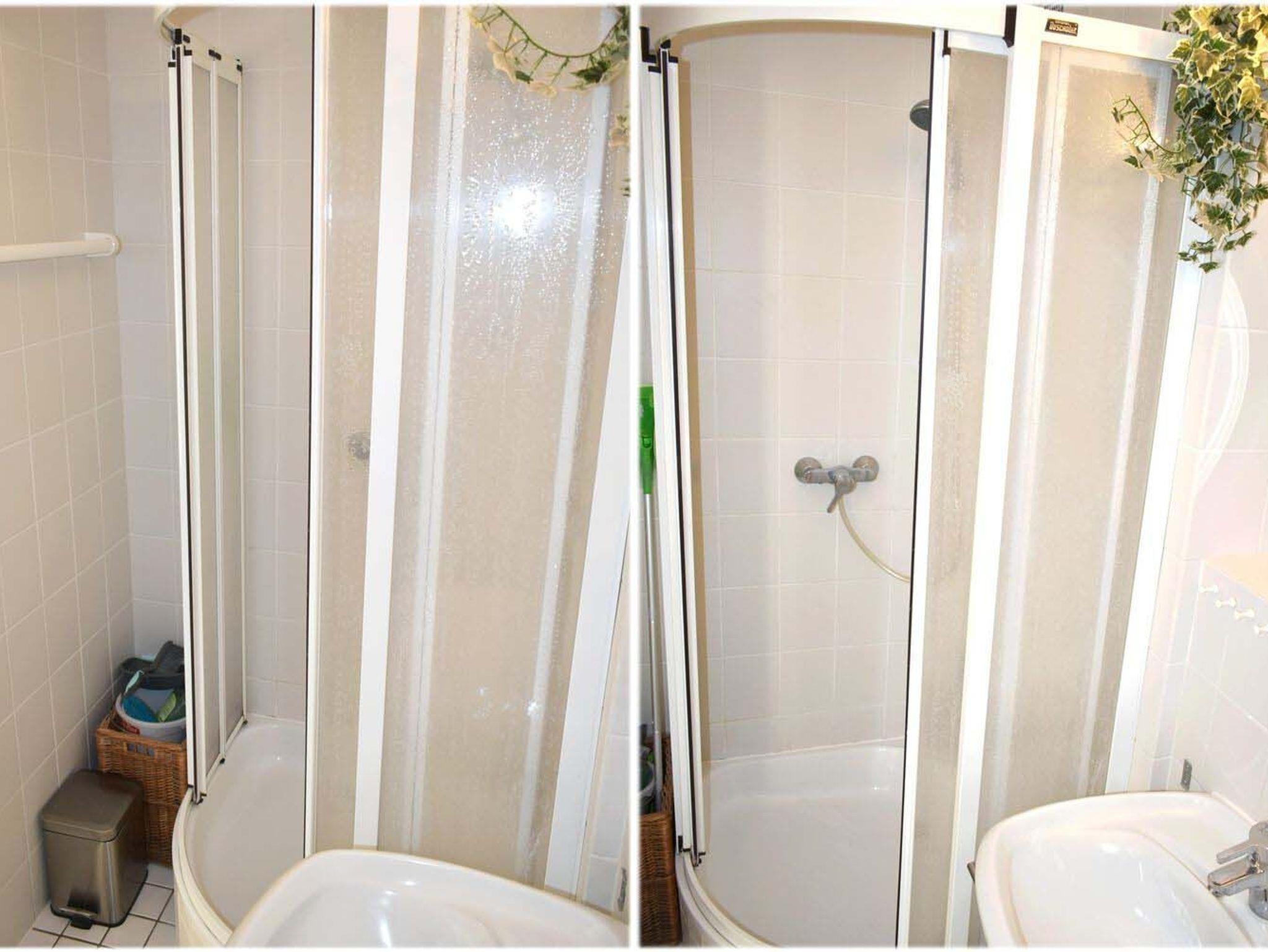 Bad 1: Dusche, Duschkabine, E-Heizung, Spiegel, Spiegelschrank, Waschbecken, WC