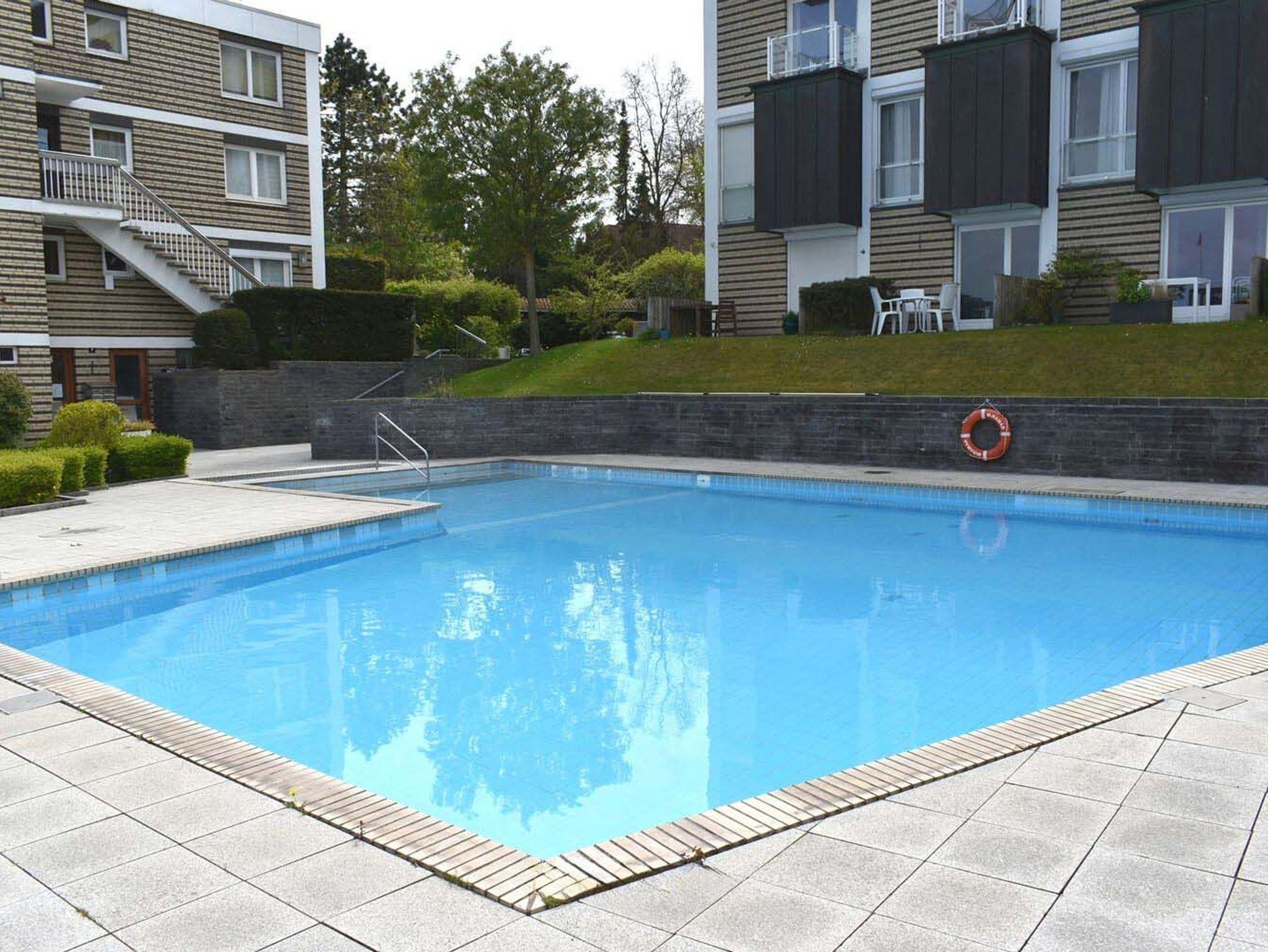Terrasse: Außenschwimmbadterrasse für die Gemeinschaft mit Bänken und Sonnenstühlen