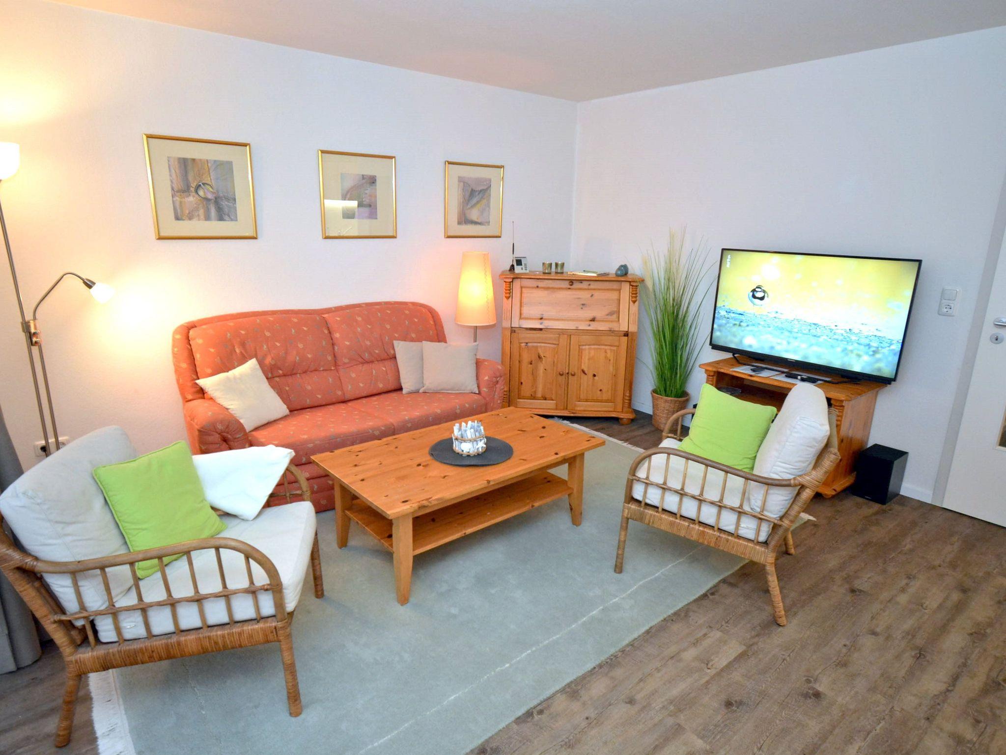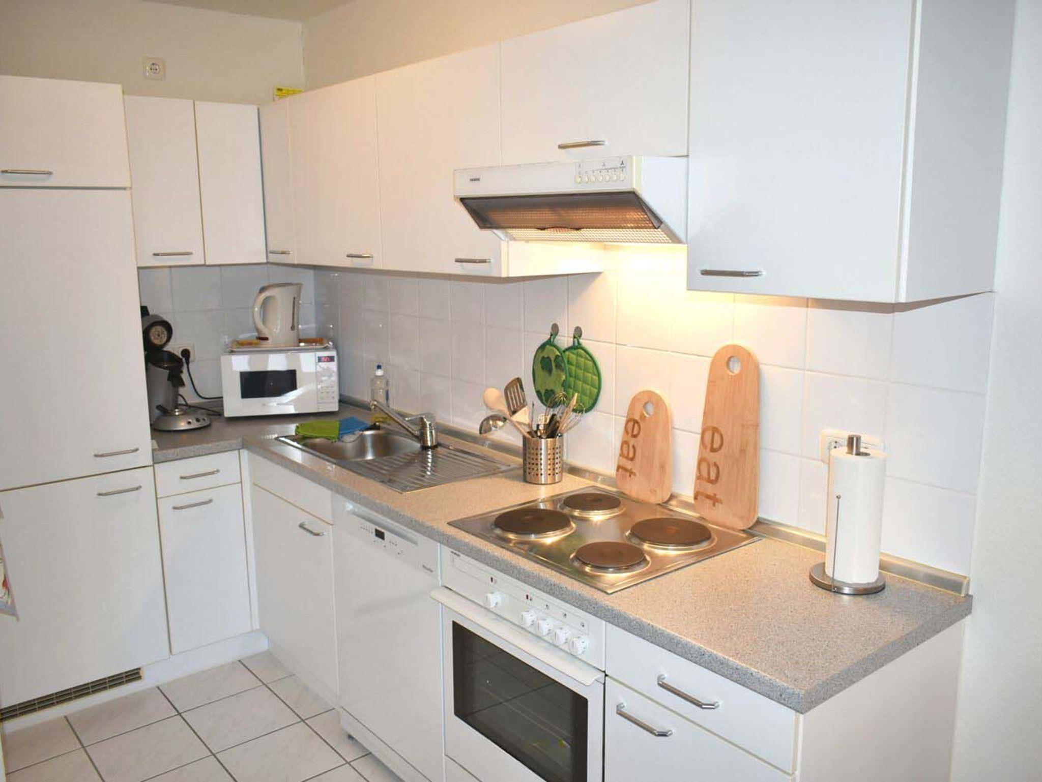 Wohnzimmer: 1 Schlafcouch 2,00 x 1,40 m, 2 Sessel, 2 Stehlampen, 4 Plattenherd mit Backofen mit Dunstabzug, 4 Stühle, Couchtisch, Eierkocher, Einbauküche, Esstisch, Flachbildschirm, Geschirr, Handmixer, Kabel-TV, Kaffeemaschine, Kochtöpfe, Kühlschrank mit 3* Gefrierfach, Mikrowelle, Sekretär, Senseo Kaffeemaschine, Spülmaschine, Stereoanlage mit CD-Player und USB-Anschluss, Toaster, TV-Tisch, Wasserkocher