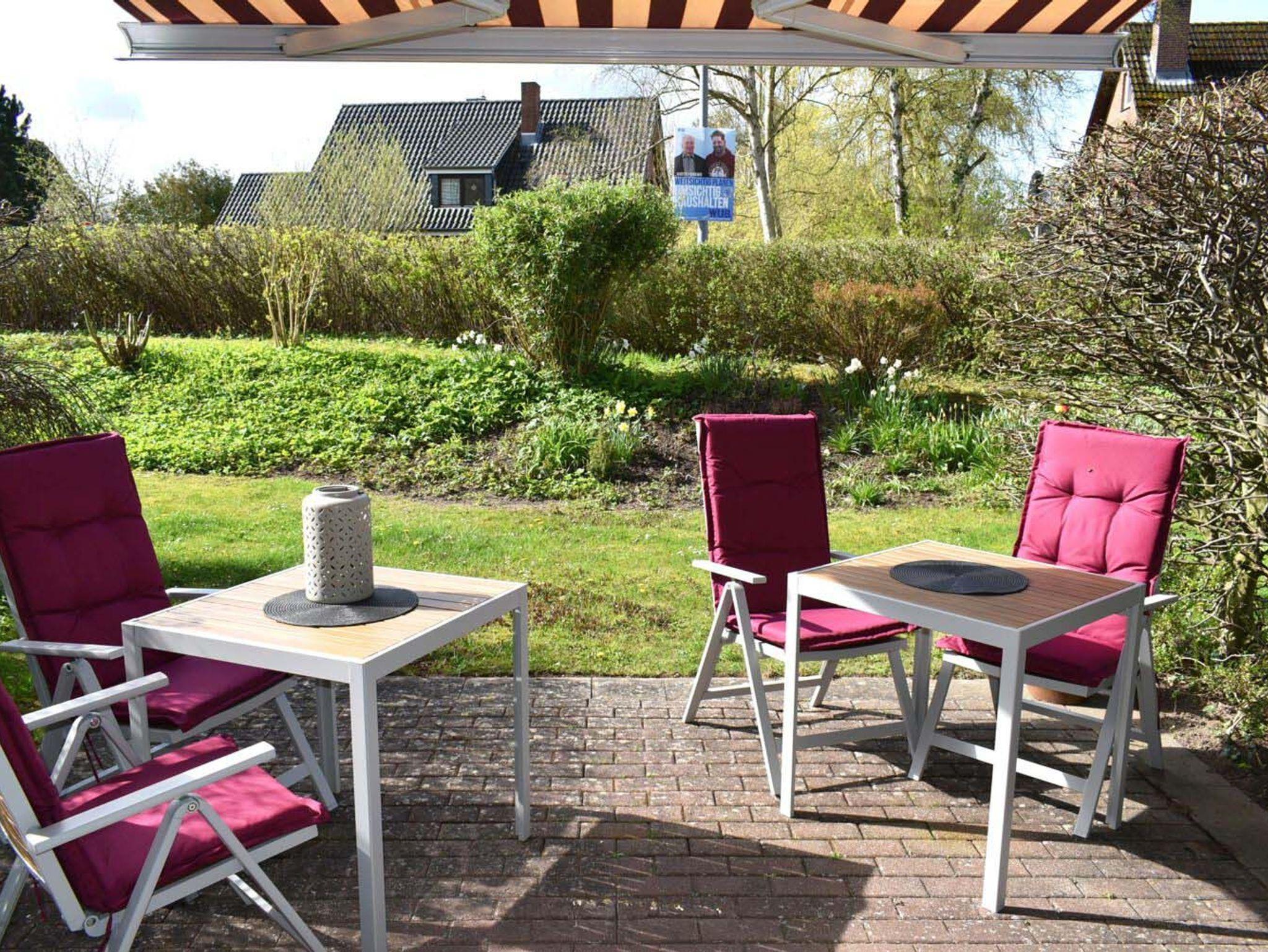 Terrasse: 2 Tische, 4 Stühle, halb überdacht, Markise, Südlage