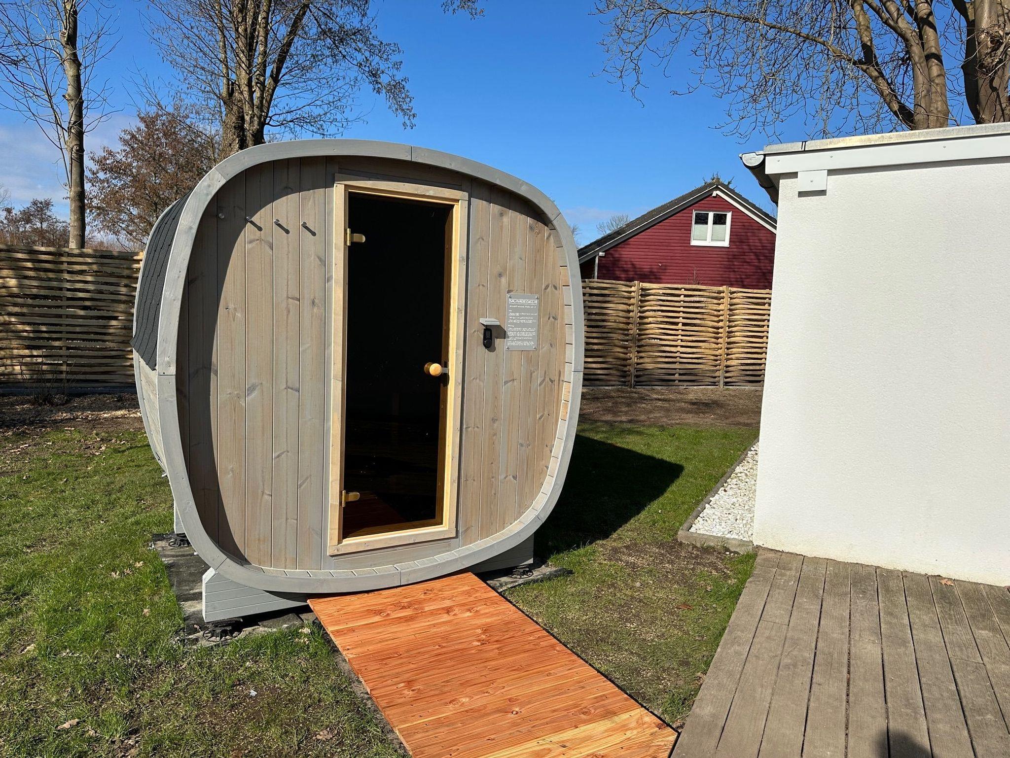 Und jetzt gibt's was Neues: Für alle, die gerne schwitzen, steht im Garten eine Fasssauna bereit.