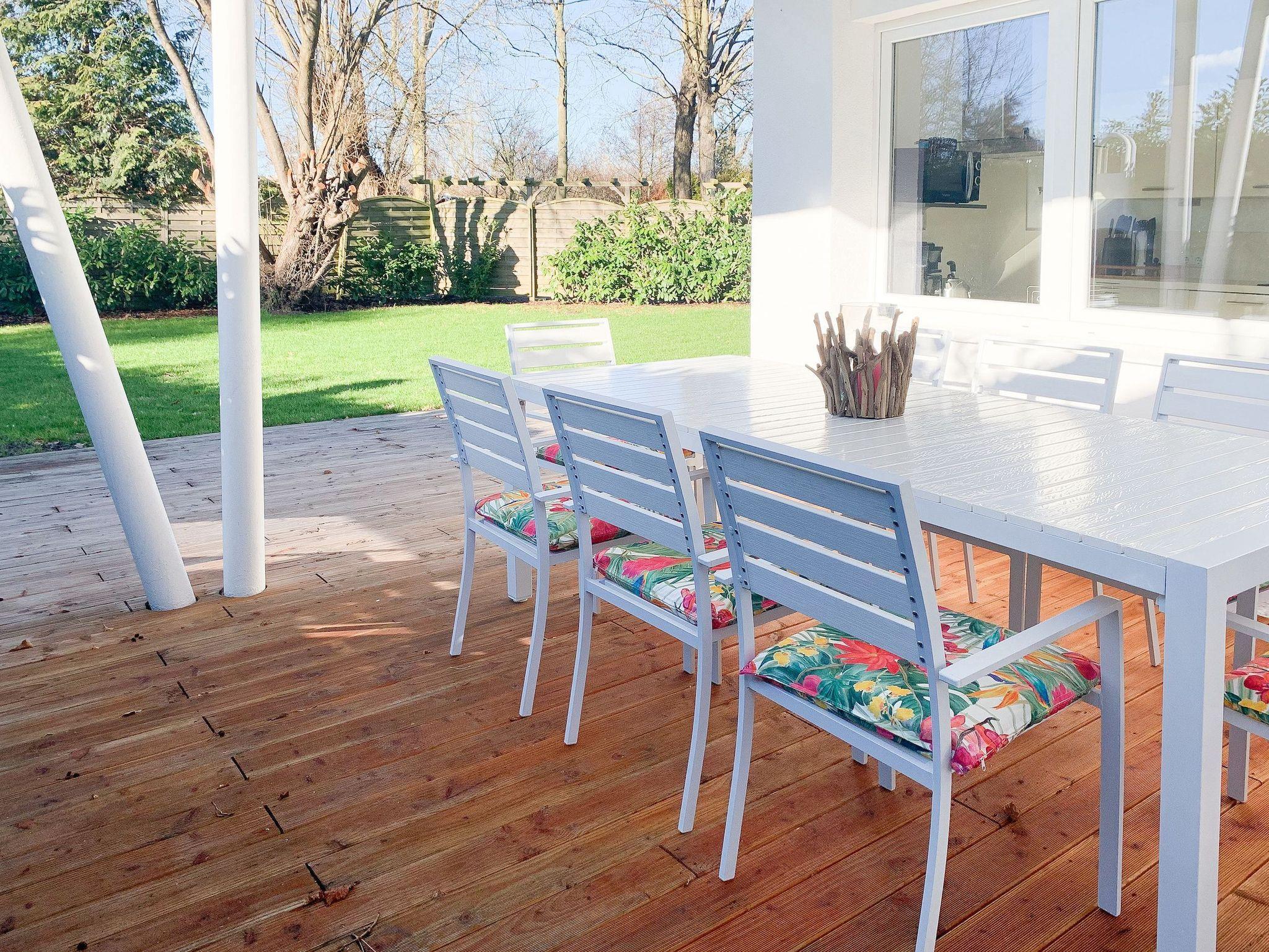 Kuscheldecken und der Infrarotheizstrahler auf der Terrasse schenken ganzjährige Freiluftmomente, auch an kühleren Tagen.