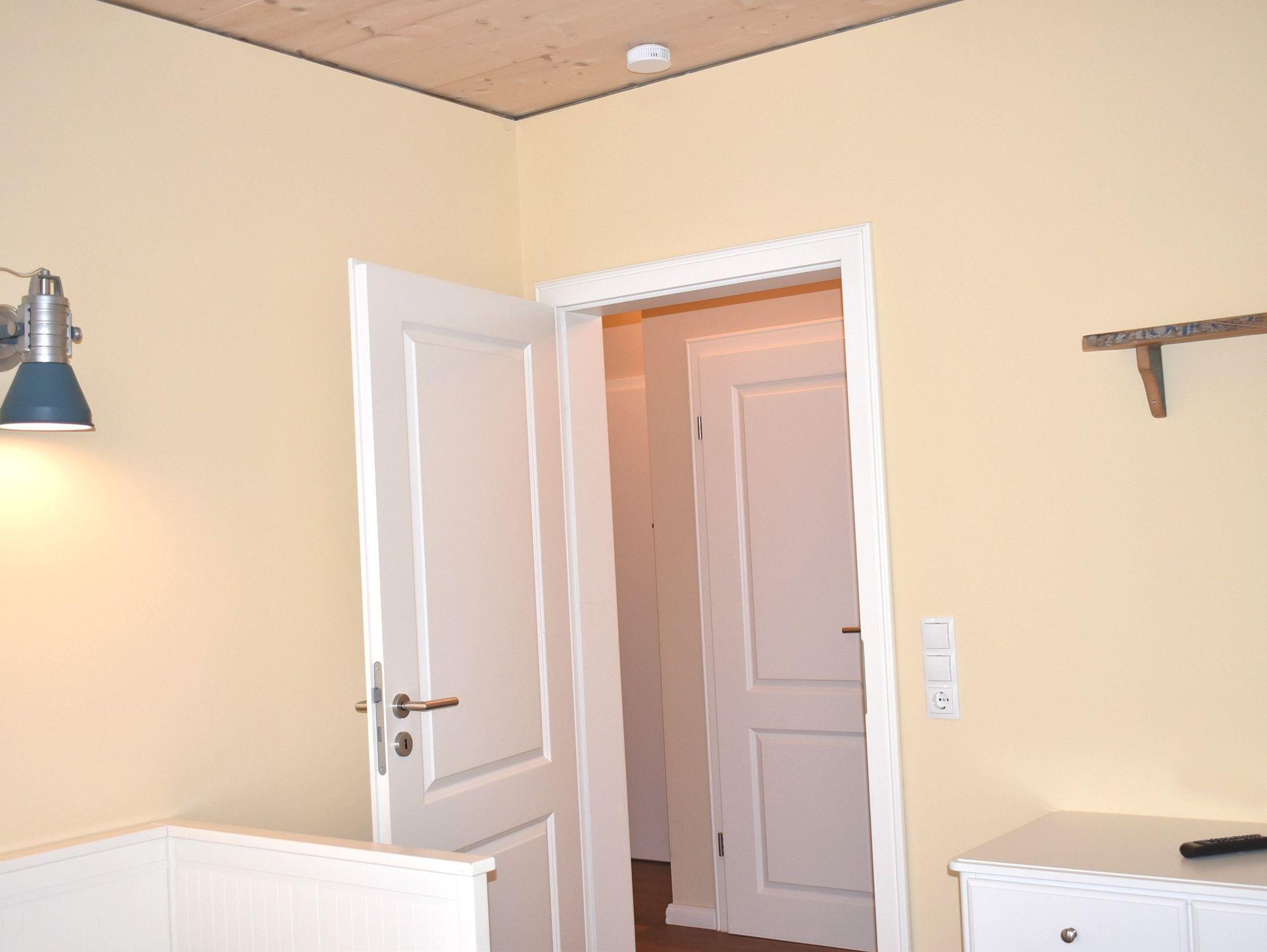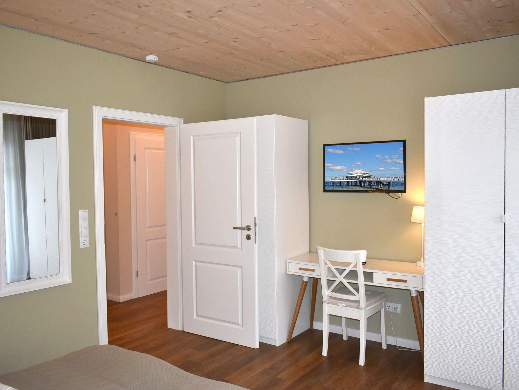 Schlafzimmer 1: 2 Kleiderschränke, 2 Matratzen, 2 Nachttische, Doppelbett 2,00 x 1,80 m, Flachbildschirm, Radiowecker, Sat-TV, Schreibtisch, Spiegel, Stuhl, Tischlampe