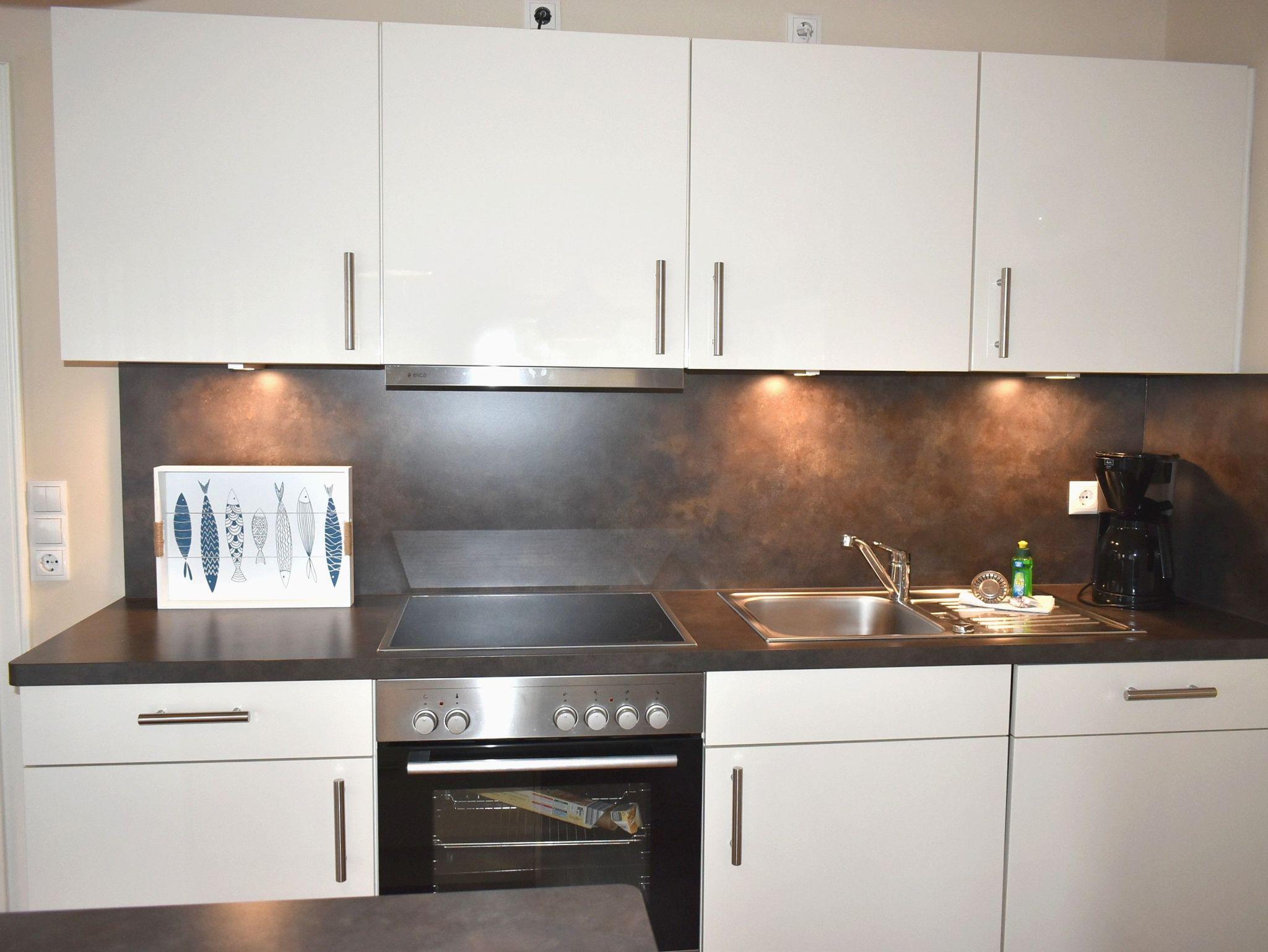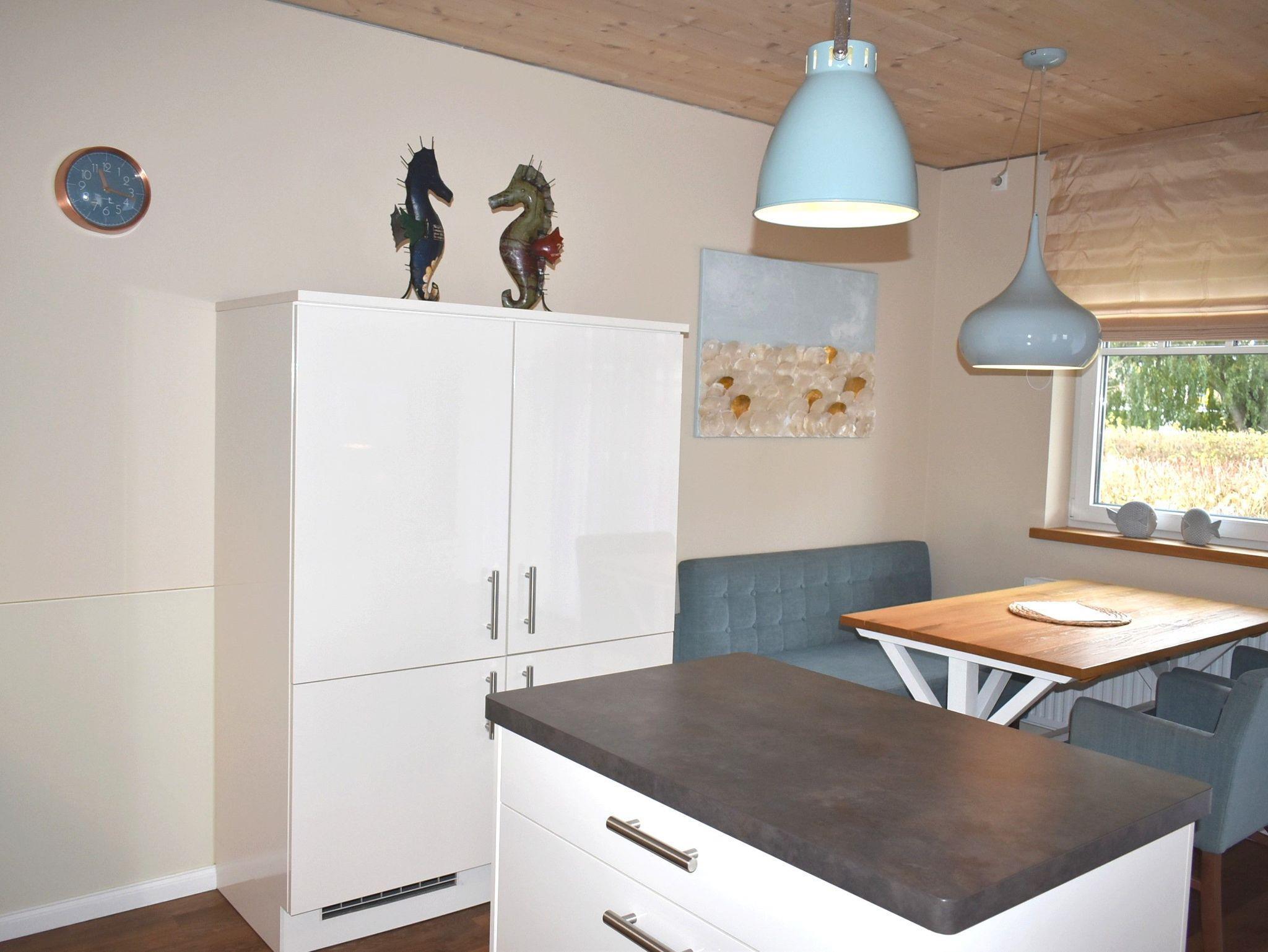 Wohnzimmer: 2 Beistelltische, 2 Sessel, 2 Stühle, 3 Tischlampen, 4 Plattenherd mit Ceranfeld und Backofen, Anrichte, Couchtisch, Dunstabzugshaube, Eierkocher, Esstisch, Flachbildschirm, Gefrierschrank mit 2 Schubladen, Geschirr, Handmixer, Kaffeemaschine, Kochtöpfe, Küchenzeile, Kühlschrank, Mikrowelle, Sat-TV, Schlafcouch, Sitzbank, Spülmaschine, Toaster, Waage, Wasserkocher