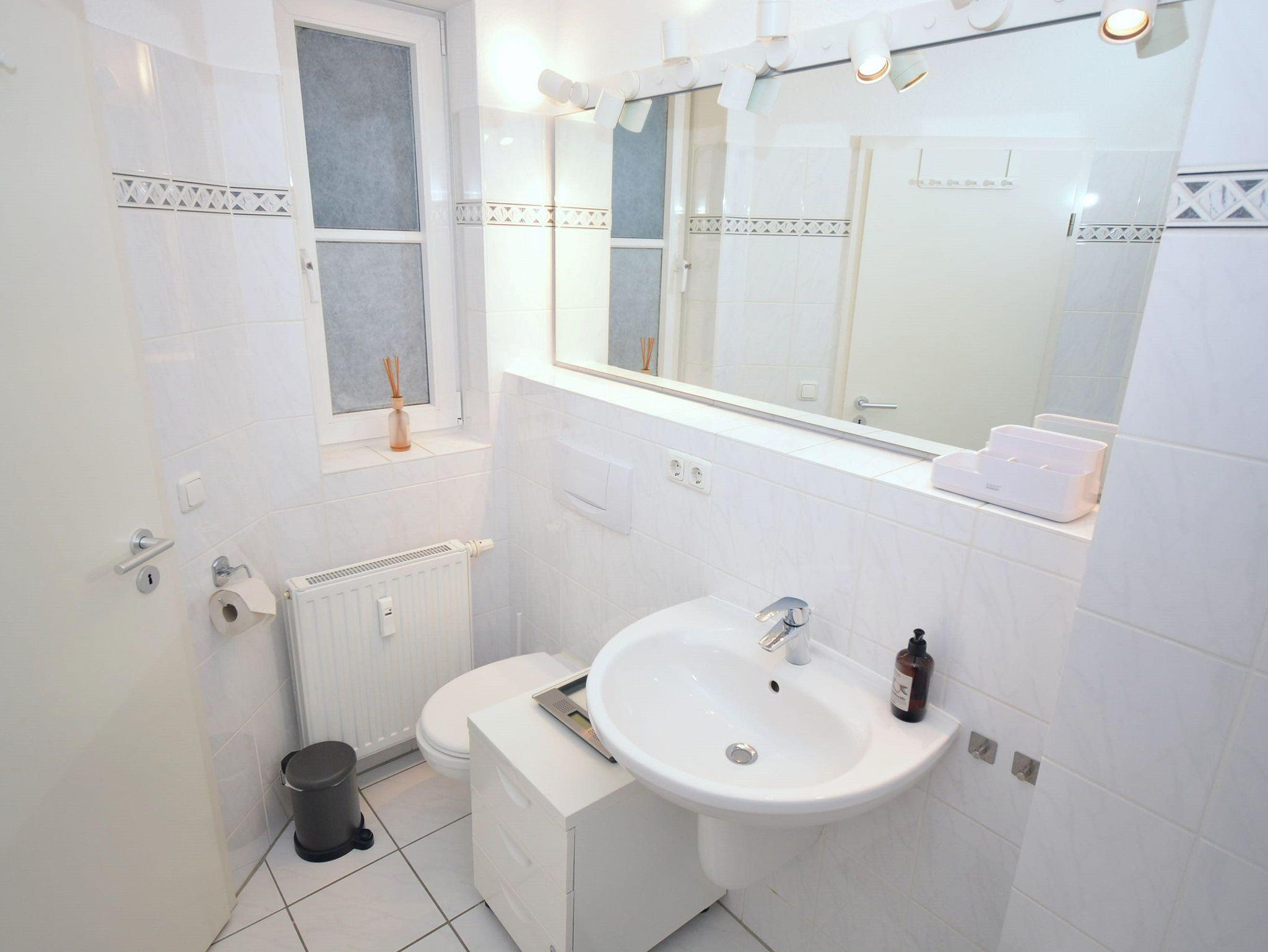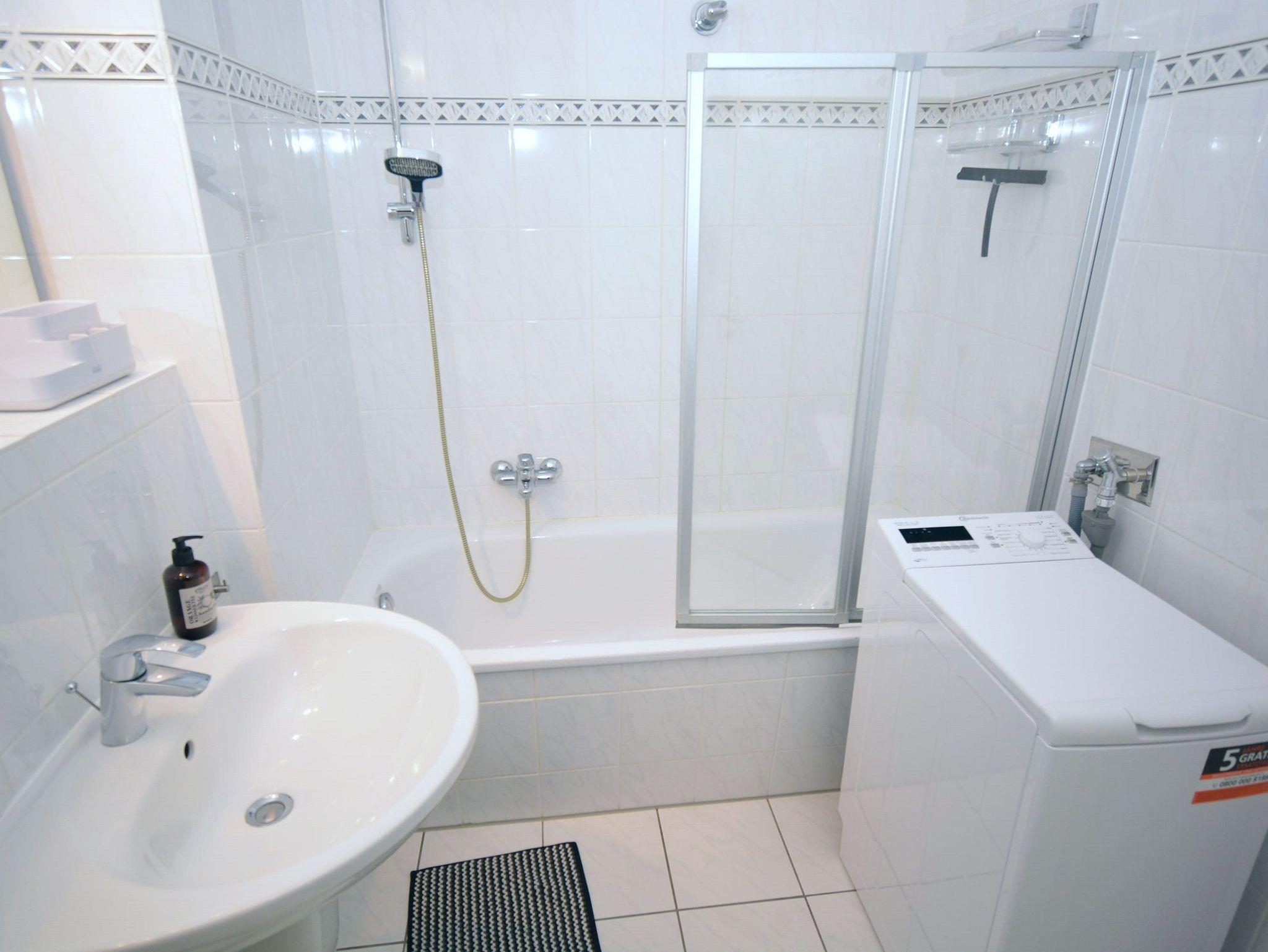 Bad 1: Badewanne, Duschwand, Spiegel, Waschbecken, WC, Schrank, Personenwaage, Waschmaschine