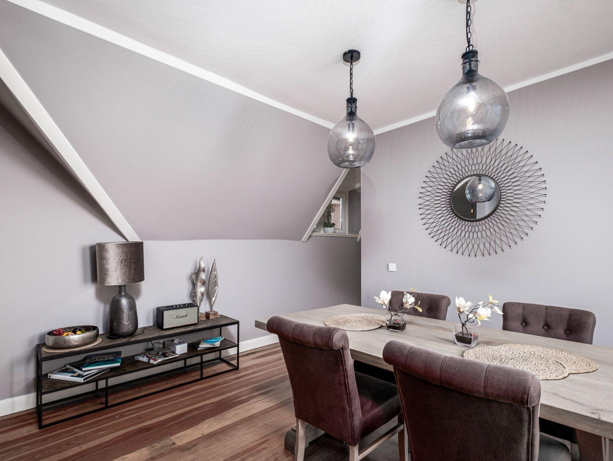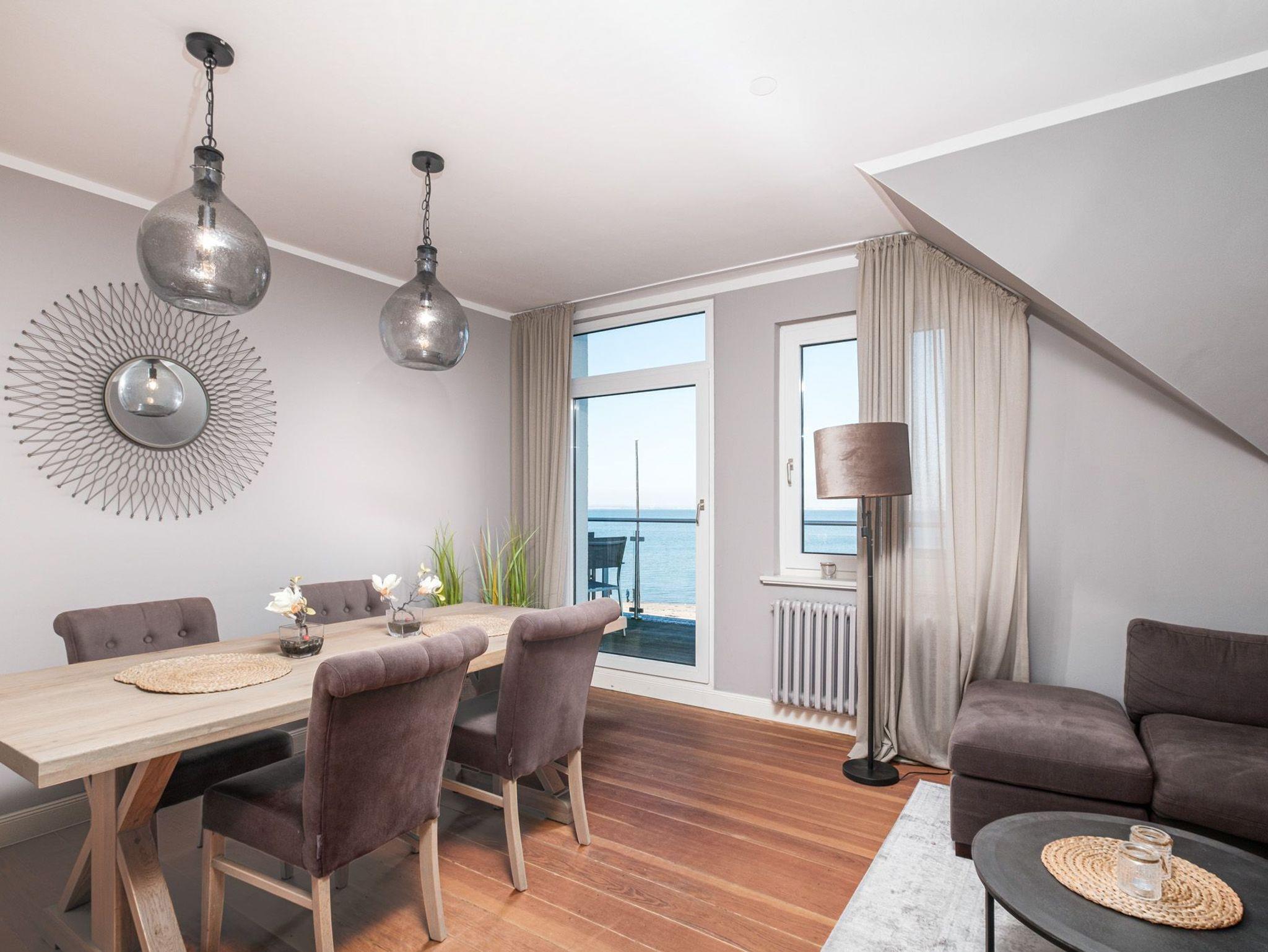 Im Wohnzimmer finden Sie eine gemütliche Couchgarnitur mit Digital-TV und Bluetooth-Lautsprecher sowie einen großen Essbereich vor. Ideal können Sie hier ausgelassene Spieleabende veranstalten und haben von hier Zugang zum großen Balkon, von dem aus Sie einen herrlichen Blick auf die schöne Lübecker Bucht der Ostsee genießen können.