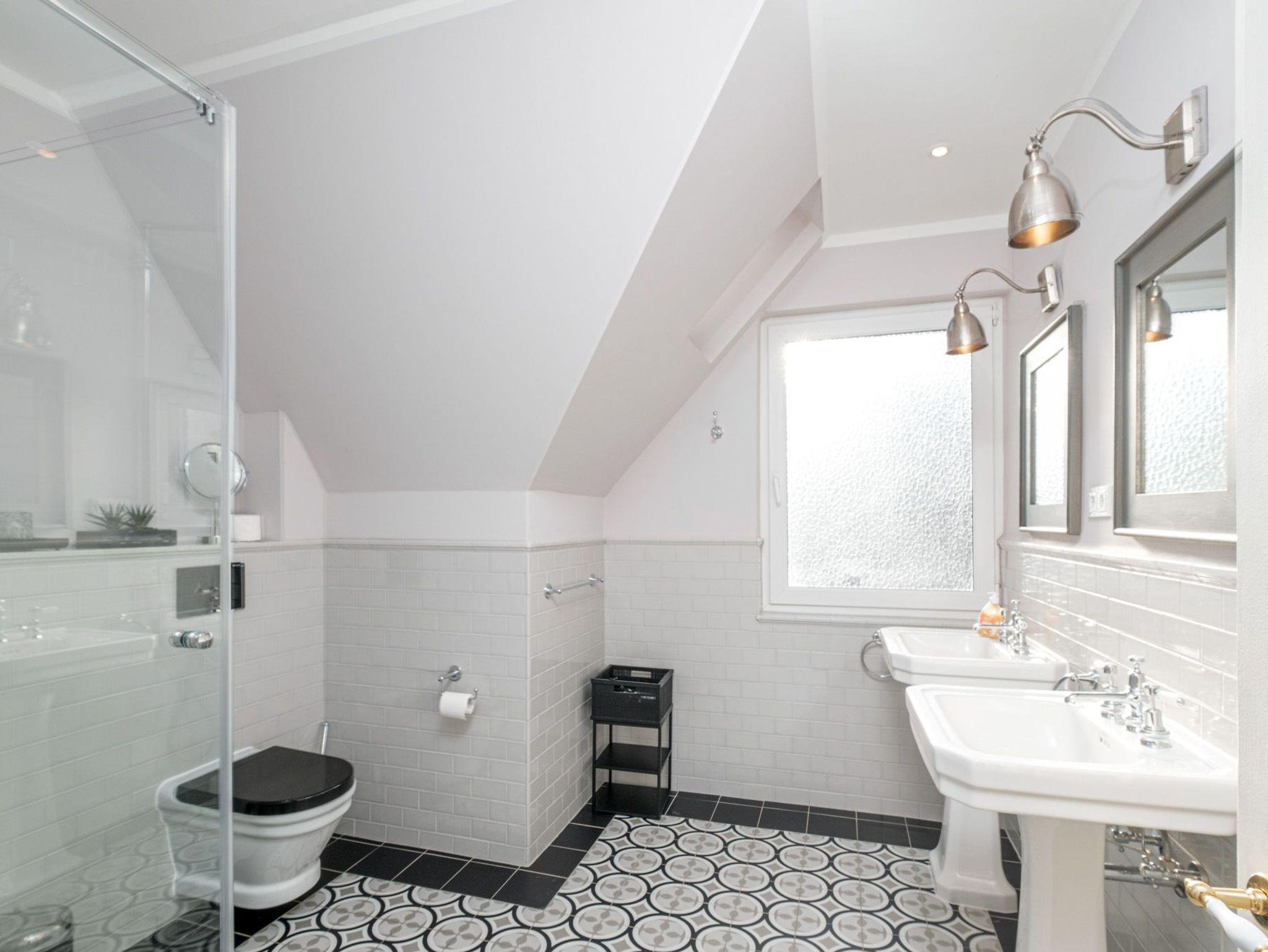 Das große Badezimmer verfügt über eine bodengleiche Dusche, 2 Waschtischen, WC sowie einem Handtuchwärmer. Hier erfrischen Sie sich nach einem erholsamen Tag an der Ostsee.