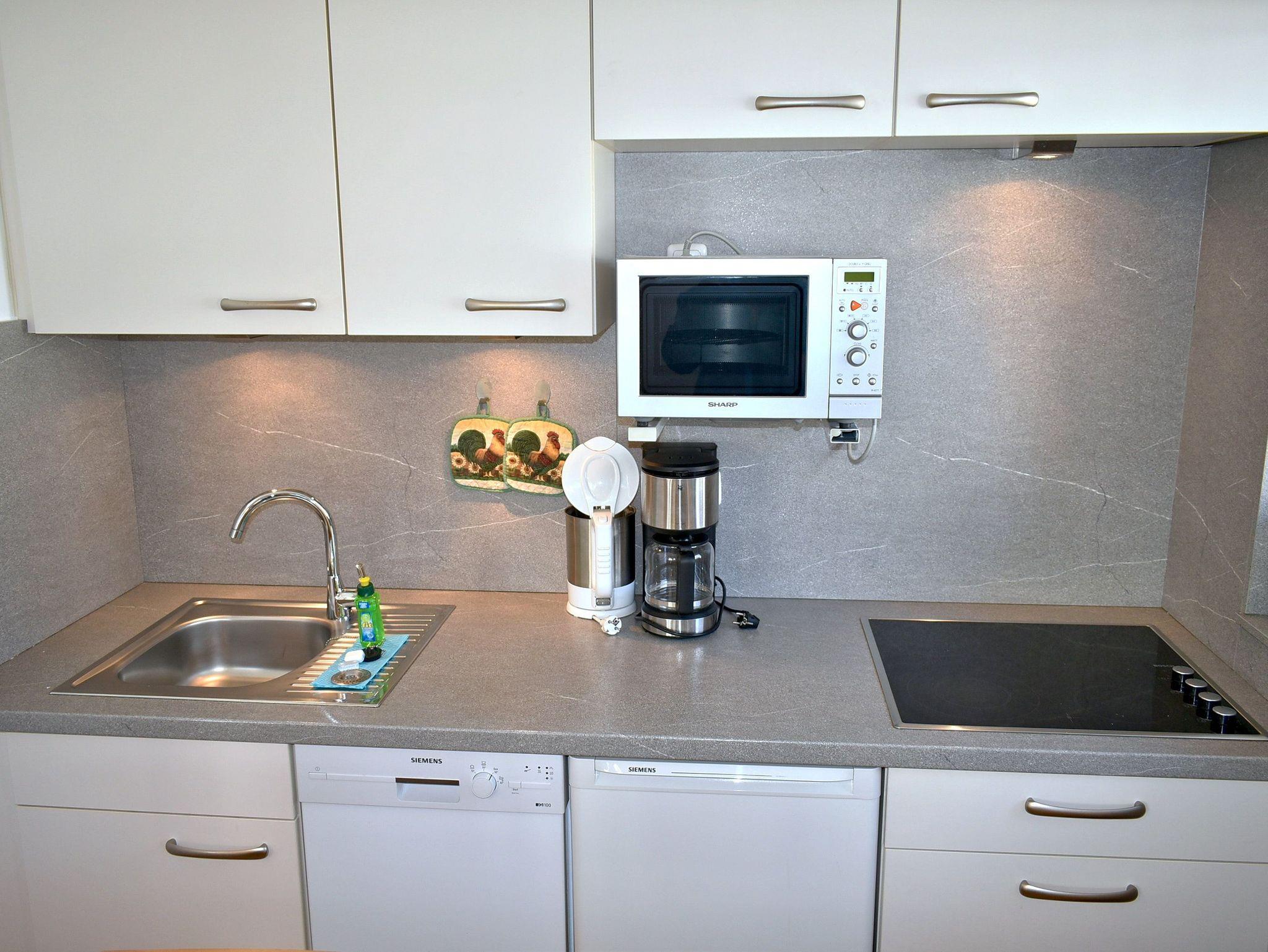 Wohnzimmer: 4 Plattenherd mit Ceranfeld, 4 Stühle, Beistelltisch, Couchtisch, Schrank, Esstisch, Flachbildschirm, Geschirr, Kaffeemaschine, Kochtöpfe, Korbsessel, Küchenzeile, Kühlschrank, Mikrowelle, Sat-TV, Schlafcouch, Spülmaschine, Tischlampe, Toaster, Wasserkocher, elektrische Aussenrollladen