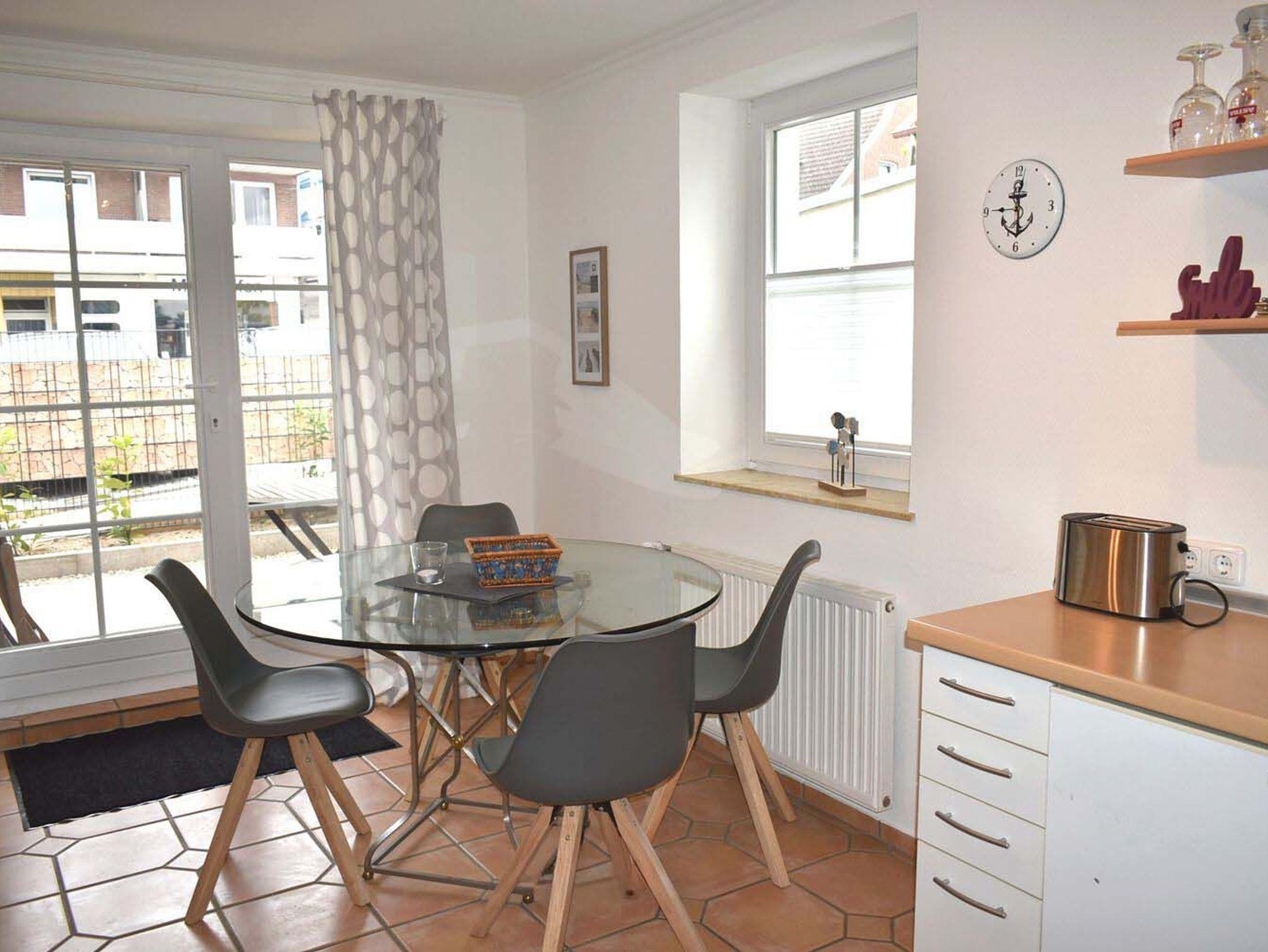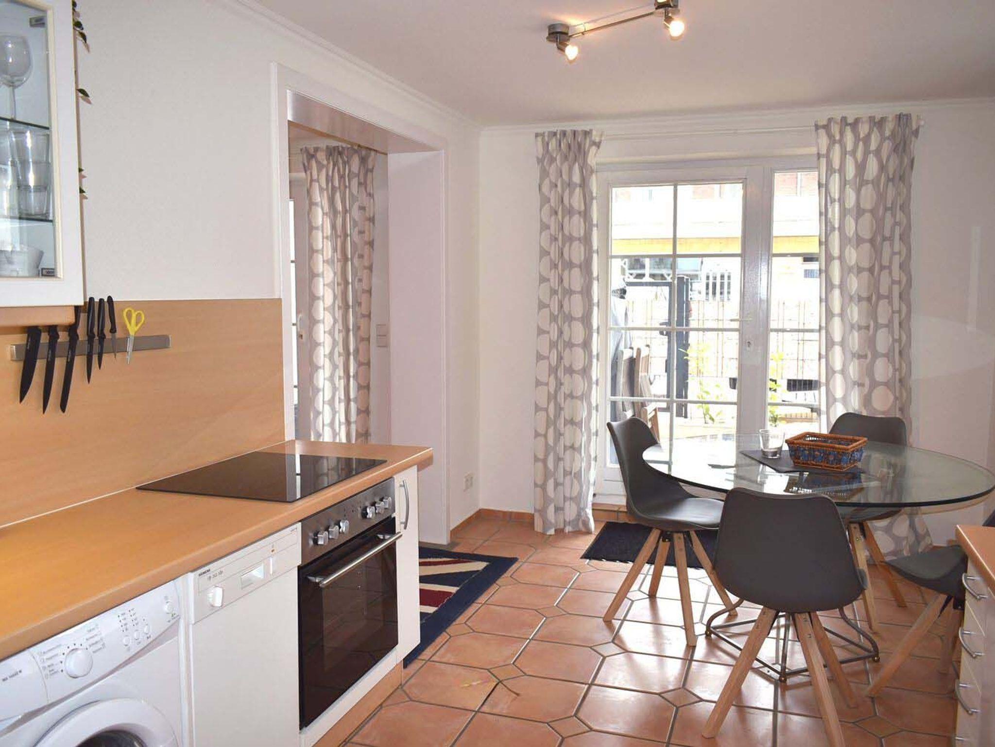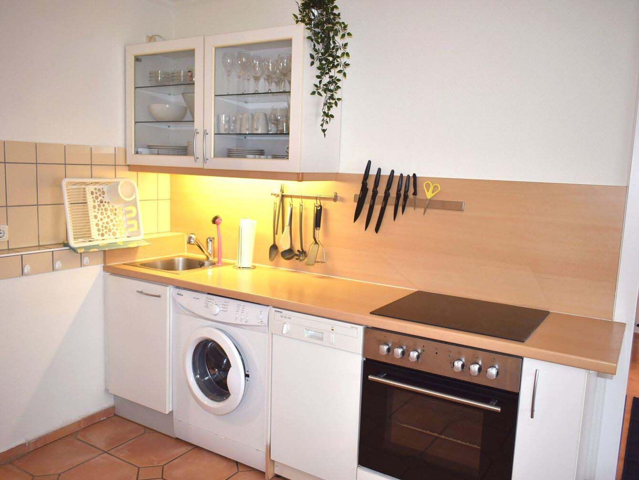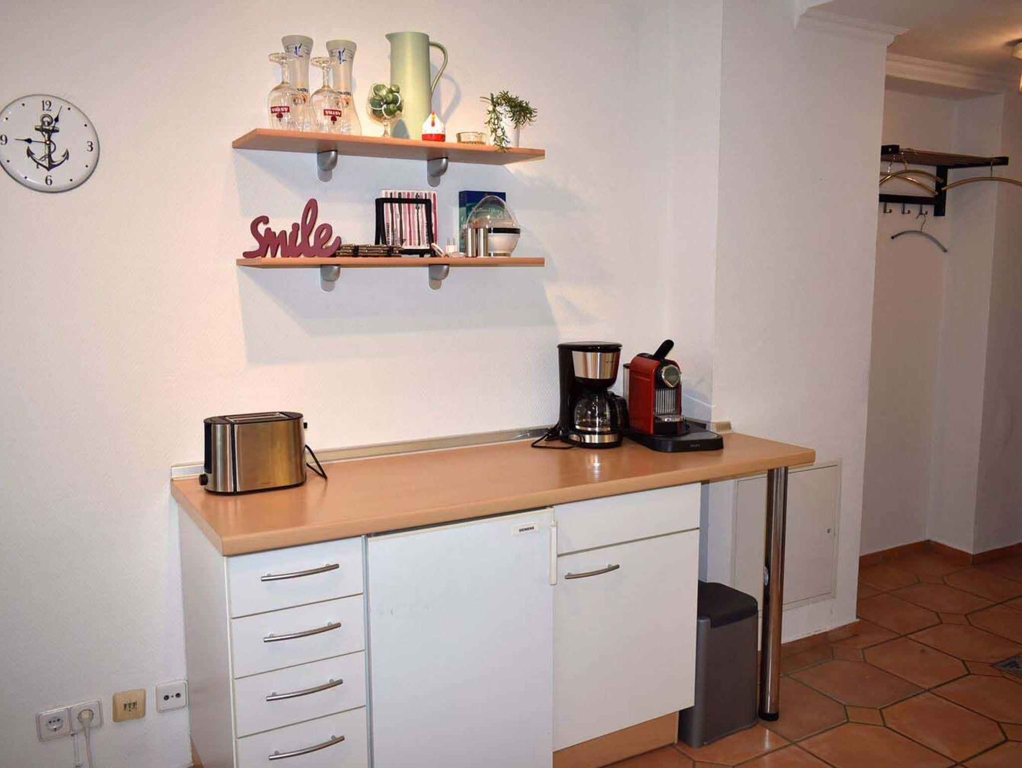 Küche: 4 Plattenherd mit Ceranfeld und Backofen, 4 Stühle, Eierkocher, Esstisch, Garderobe, Kaffeemaschine, Kochtöpfe, Krups Caps Maschine, Spülmaschine, Toaster, Waschmaschine, Wasserkocher