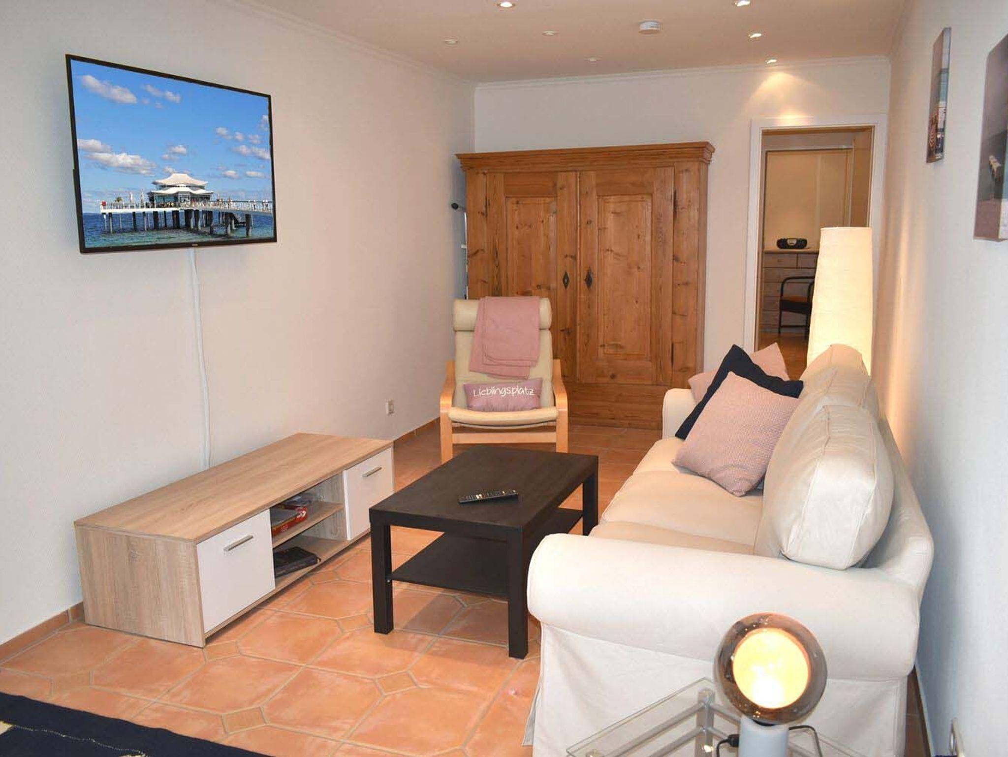 Wohnzimmer: 2 Sessel, Bauernschrank, Bügelbrett, Couch, Couchtisch, Smart TV, TV-Anrichte, wandhängender Kabel-TV Flachbildschirm, Wäscheständer