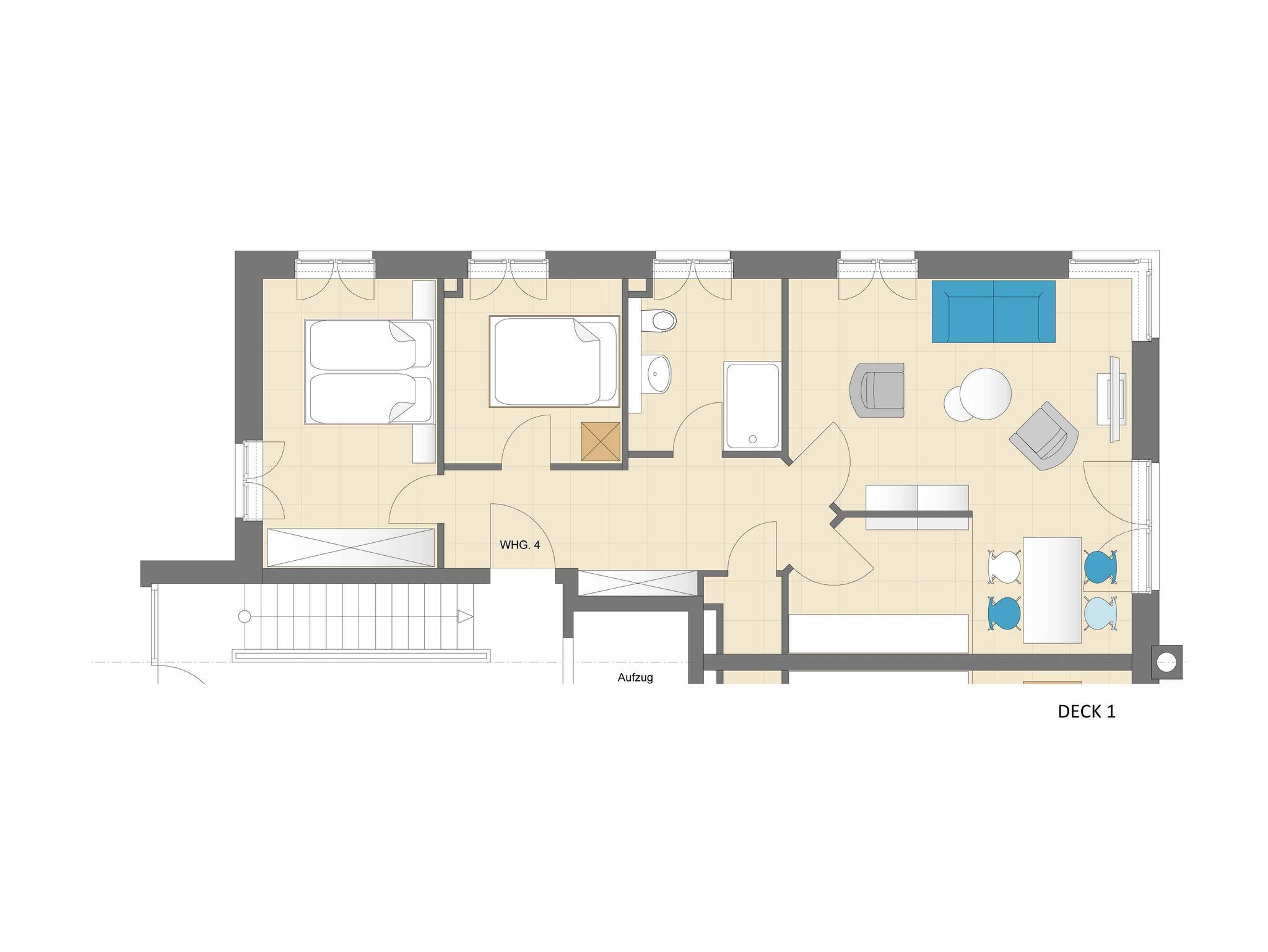 Deck 1 befindet sich im Erdgeschoss des Ferienhauses Ostsee Lodges mit Aufzug, Sauna und Fitnessbereich. Genießen Sie Ihren Urlaub in der 75 qm großen, hellen Wohnung mit bodentiefen Fenstern, Südost Terrasse und elektrischer Sonnenmarkise. Sie gelangen von der komfortablen halboffenen Küche in den großzügigen Wohn-Essbereich, einfach zum Wohlfühlen. Bei der Einrichtung der Wohnung und Errichtung des Hauses wurde auf hochwertige Materialien Wert gelegt. In den 2 separaten Schlafzimmern mit Doppelbetten (180x200 und 140x200) und TV erwartet Sie hoher Schlafkomfort. Die Wohnung ist ausgestattet mit Loewe-TV´s, Musikanlage und kostenlosem Internetzugang über WLAN. Das hochwertige Bad mit viel Tageslicht ist mit einer Glaskomfortdusche, Fußbodenheizung und Handtuchwärmer ausgestattet. In der Wohnung befindet sich ein kleiner Hauswirtschaftsraum mit einem Waschtrockner.