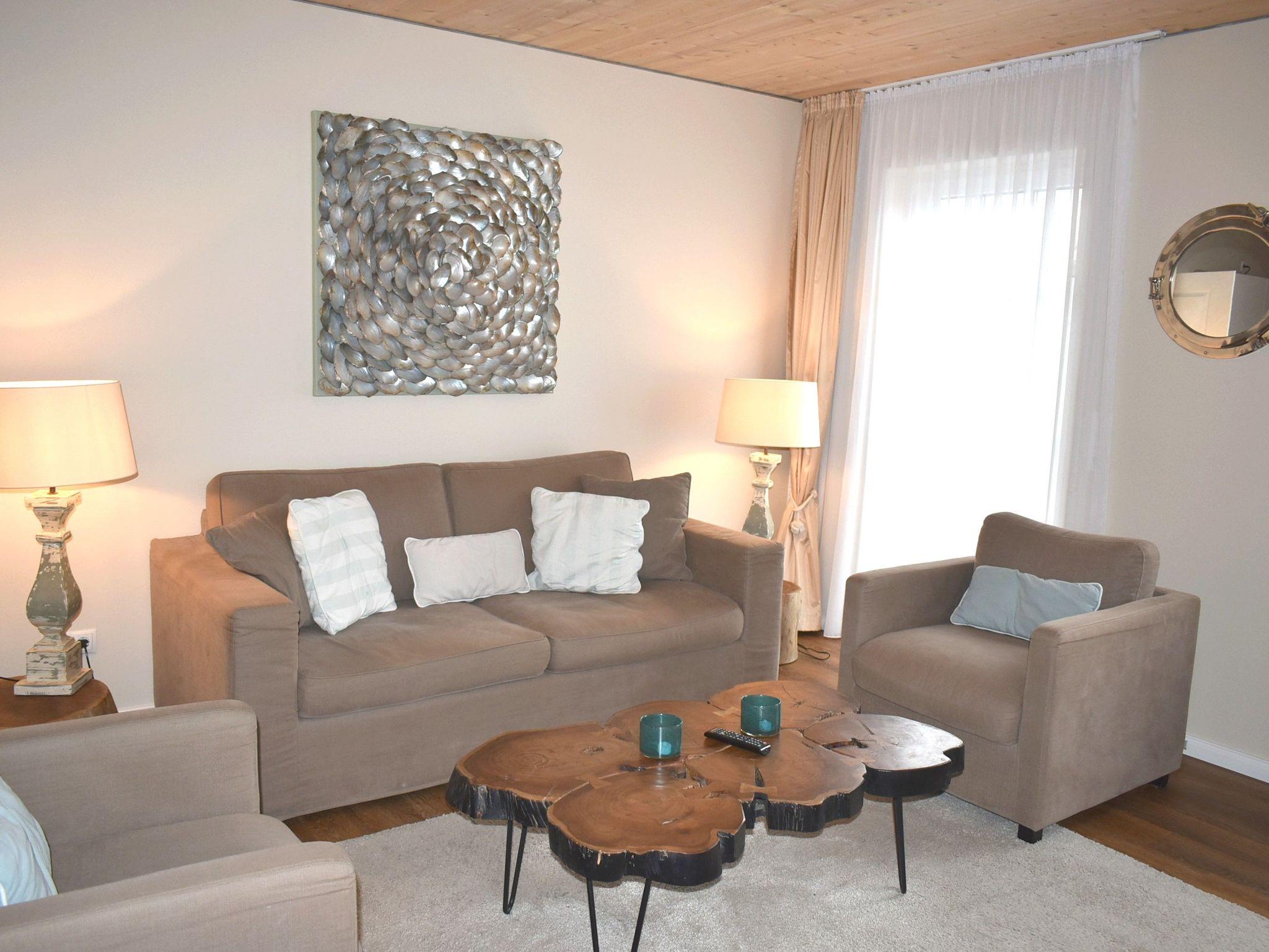 Wohnzimmer: 2 Beistelltische, 2 Sessel, 2 Stühle, 3 Tischlampen, 4 Plattenherd mit Ceranfeld und Backofen, Anrichte, Couchtisch, Dunstabzugshaube, Eierkocher, Esstisch, Flachbildschirm, Gefrierschrank mit 2 Schubladen, Geschirr, Handmixer, Kaffeemaschine, Kochtöpfe, Küchenzeile, Kühlschrank, Mikrowelle, Sat-TV, Schlafcouch, Sitzbank, Spülmaschine, Toaster, Waage, Wasserkocher