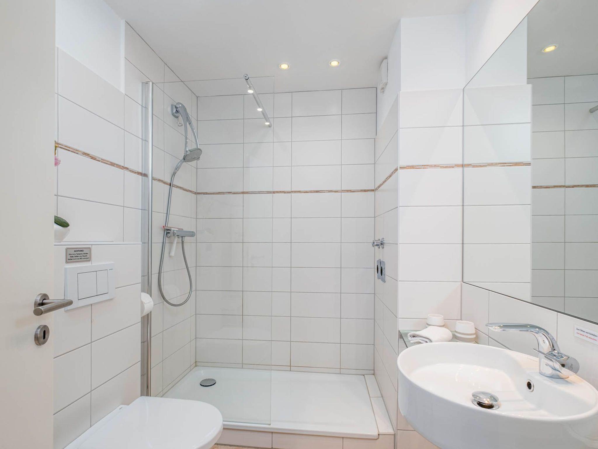 Das helle und moderne Badezimmer ist mit einer Dusche, WC und Fön ausgestattet.
