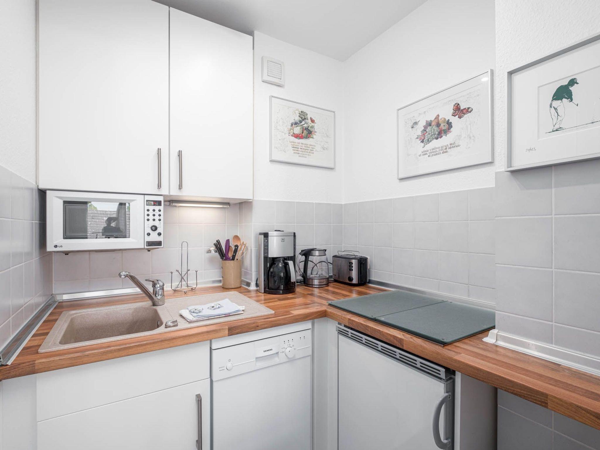 Im separaten Schlafzimmer finden bis zu 2 Personen im großzügigen Doppelbett einen Schlafplatz. In der voll ausgestatteten Einbauküche finden Sie mit einem Geschirrspüler, Mikrowelle und Kaffeemaschine alles Nötige zum Zubereiten leckerer Gerichte.