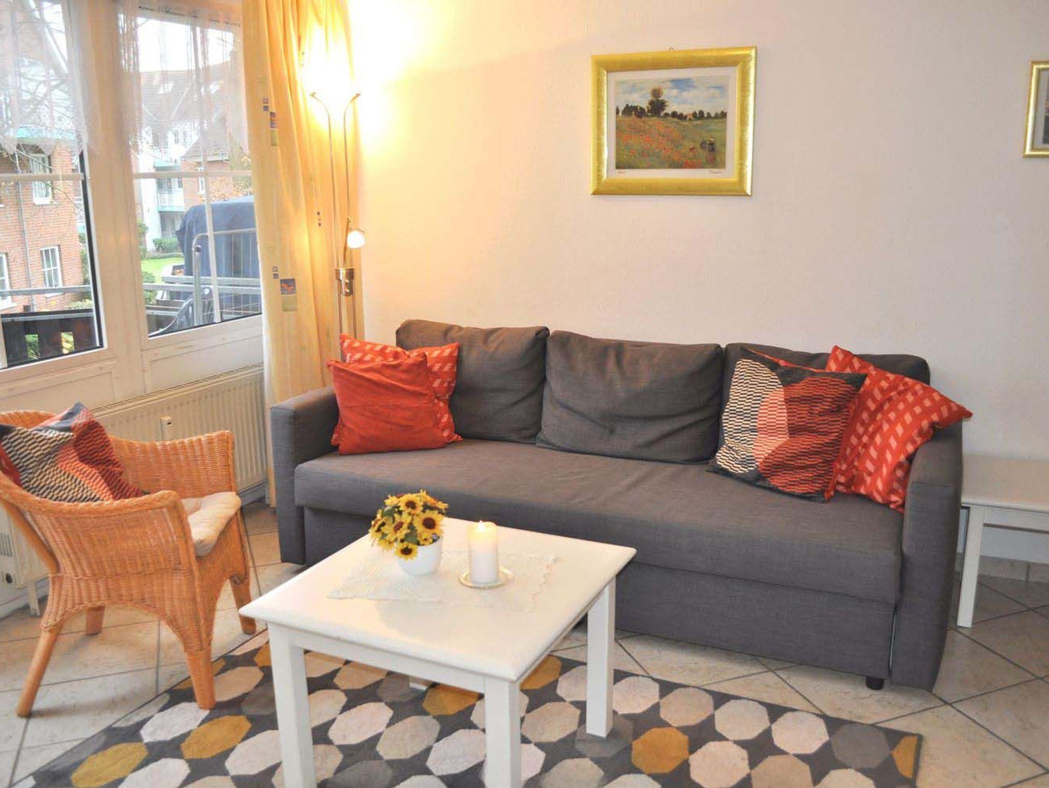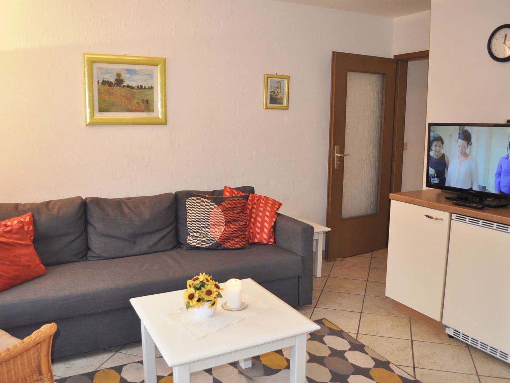 Wohnzimmer: Anrichte, DVD-Player, Essecke, Kabel-TV, Kofferradio mit CD-Player, Schlafcouch, Schrank, Sessel, Tisch