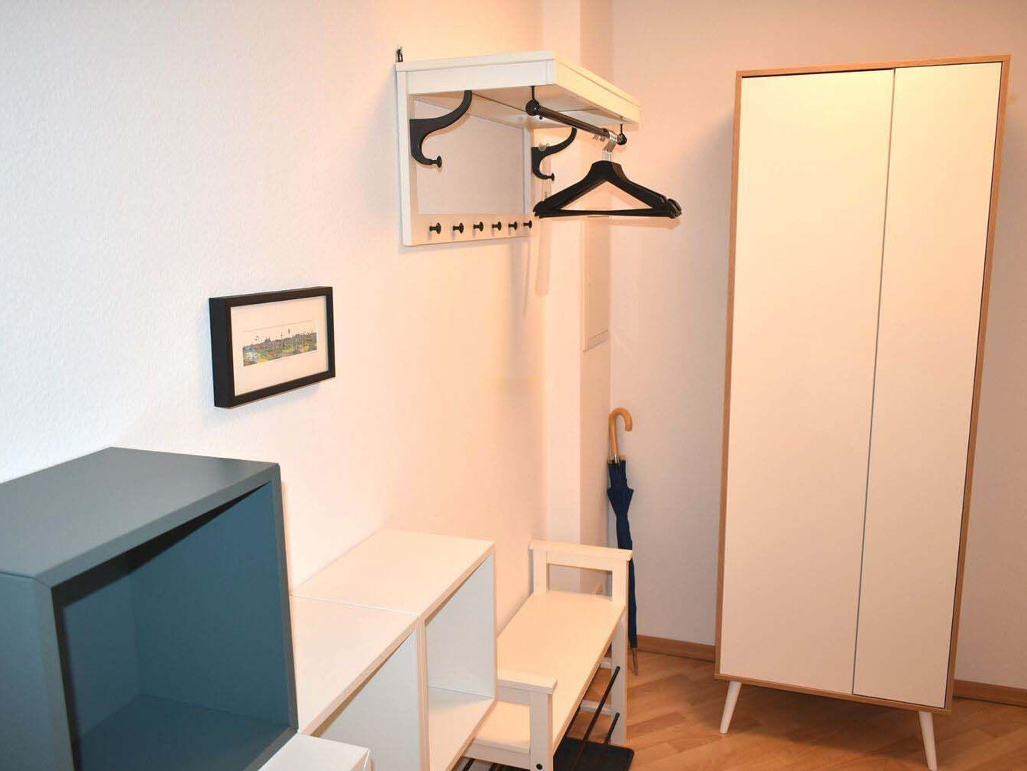 Flur: Garderobe, Regale, Schrank, Schuhständer, Spiegel, Staubsauger, Wäscheständer