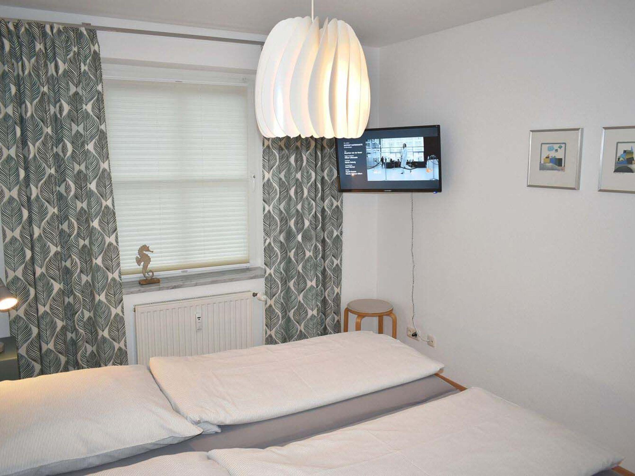 Schlafzimmer 1: 2 Matratzen, 2 Nachttische, 2 Nachttischlampen, Doppelbett 2,00 x 1,80 m, Flachbildschirm, Hakenleiste, Hocker, Kabel-TV, Kleiderschrank, Radiowecker, Tritt