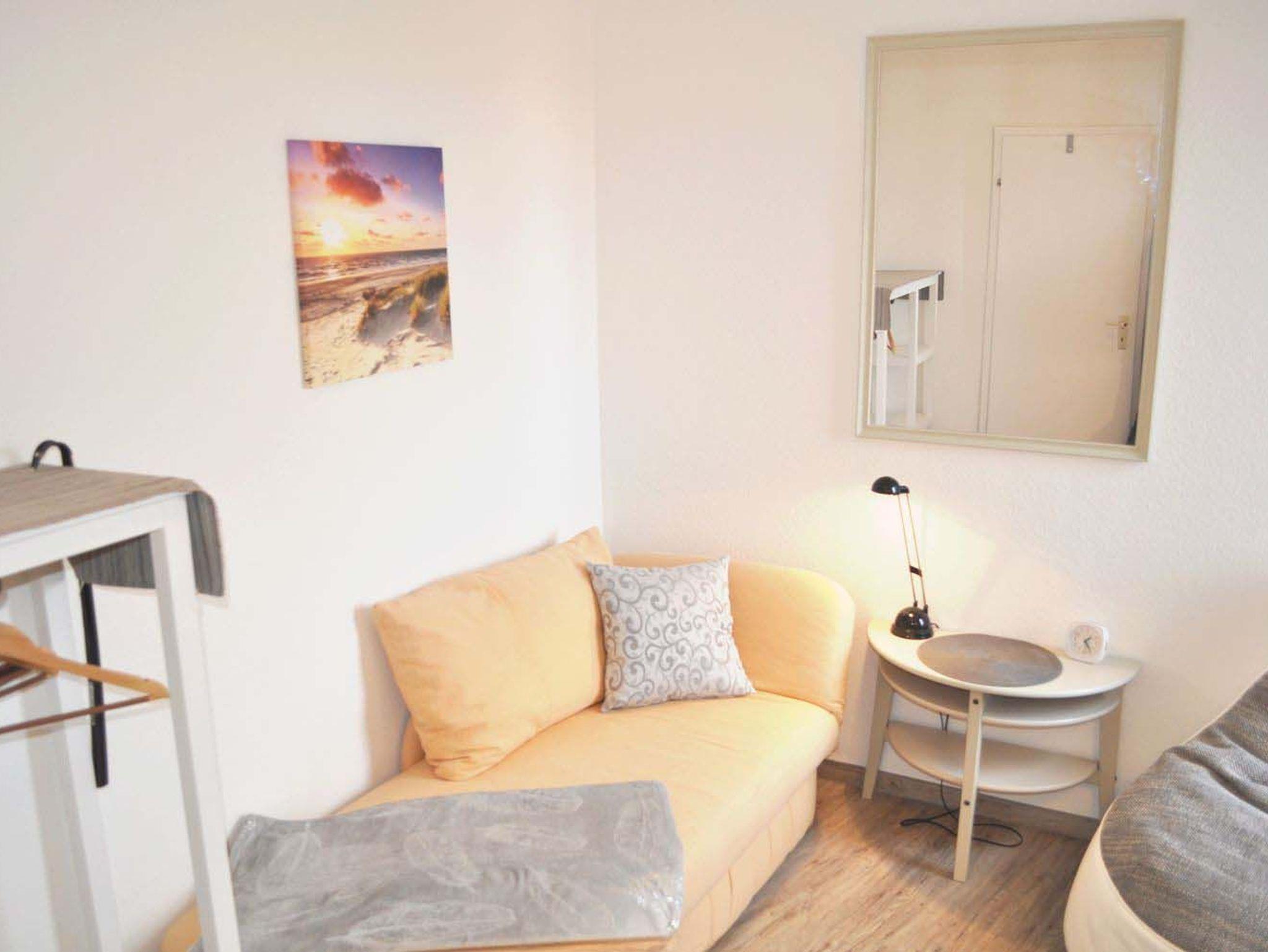 Schlafzimmer 2: Hocker, Kleiderregal, Kofferradio mit CD-Player, Kommode, Nachttisch, Schlafcouch 2,00 x 0,80 m, Sitzsack, Stehlampe, Wecker
