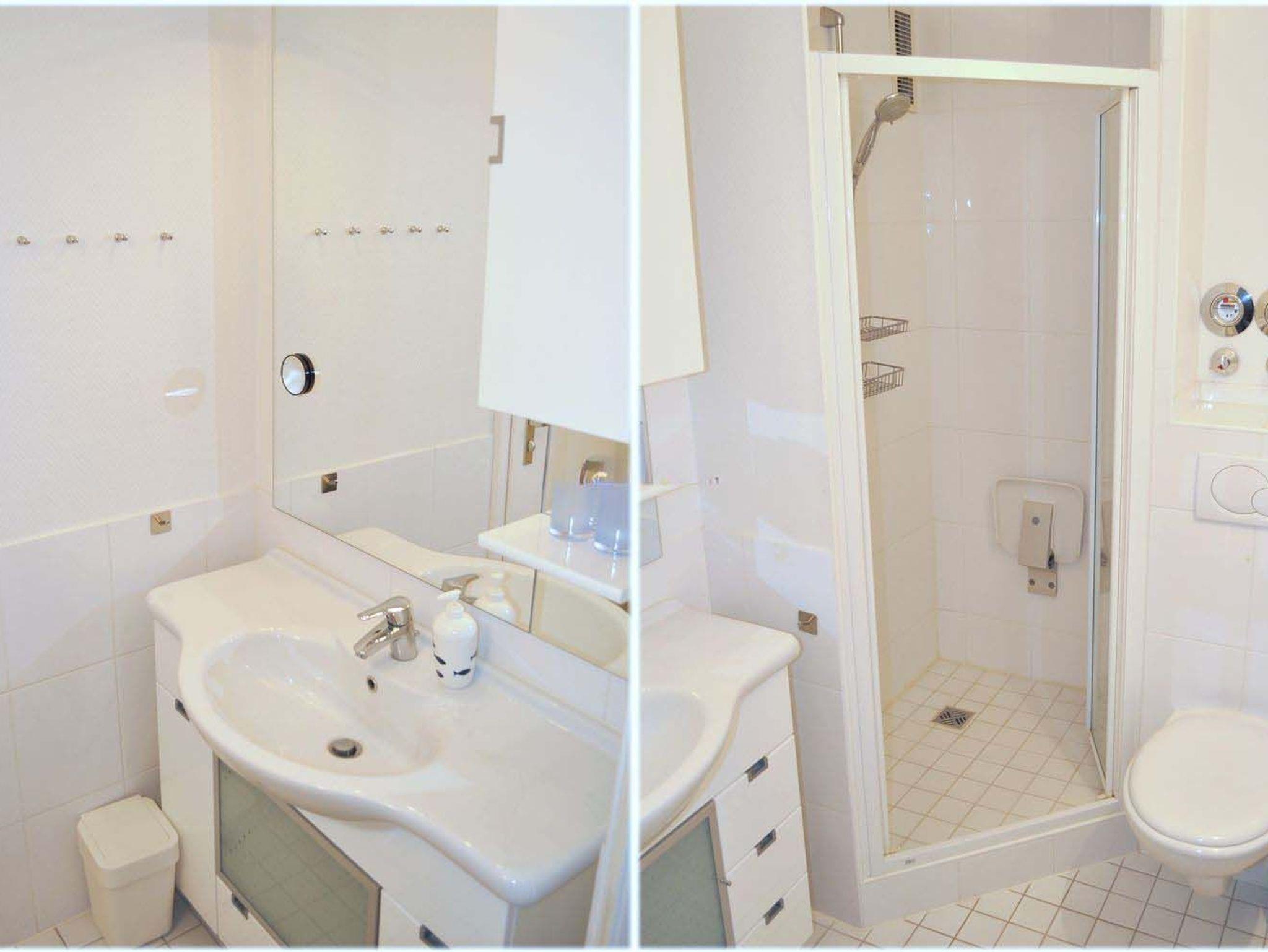 Bad 1: Dusche, Duschkabine, Duschsitz, Fön, Spiegel, Waschtisch mit Unterschrank, WC