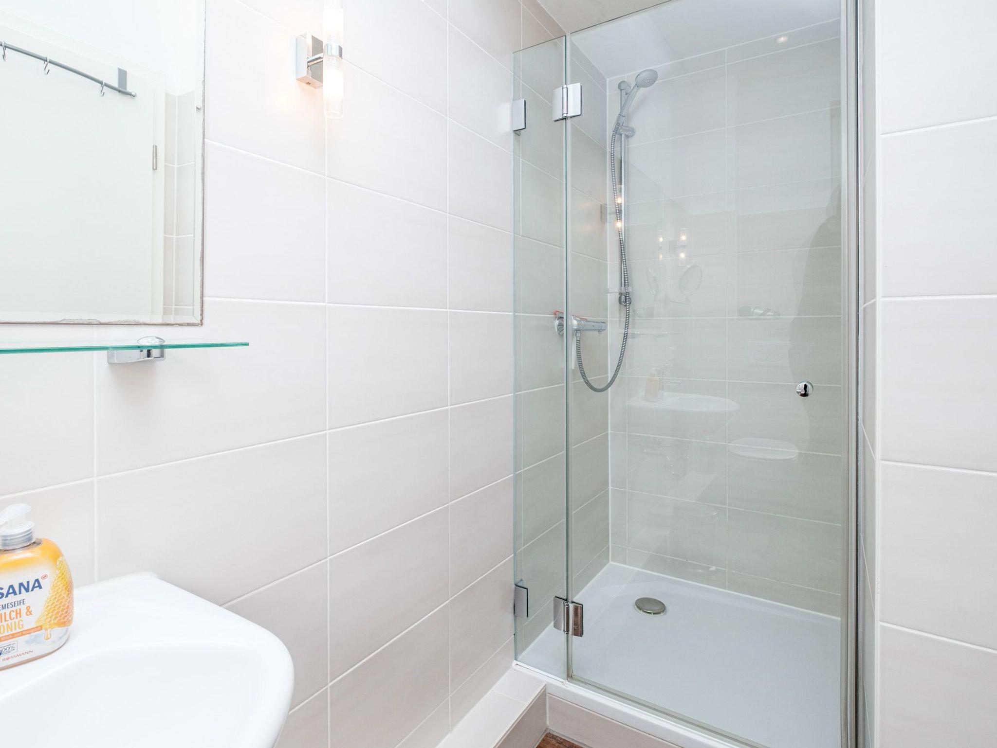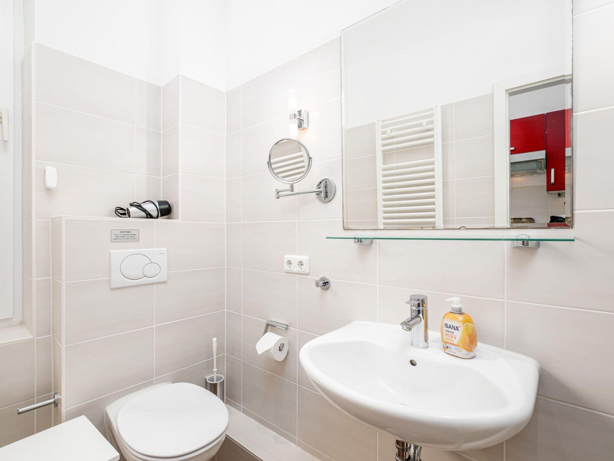 Im Badezimmer mit Dusche, WC, Fön und Kosmetikspiegel sowie einem Handtuchwärmer können Sie nach einem entspannten Tag an der Ostsee erfrischen.