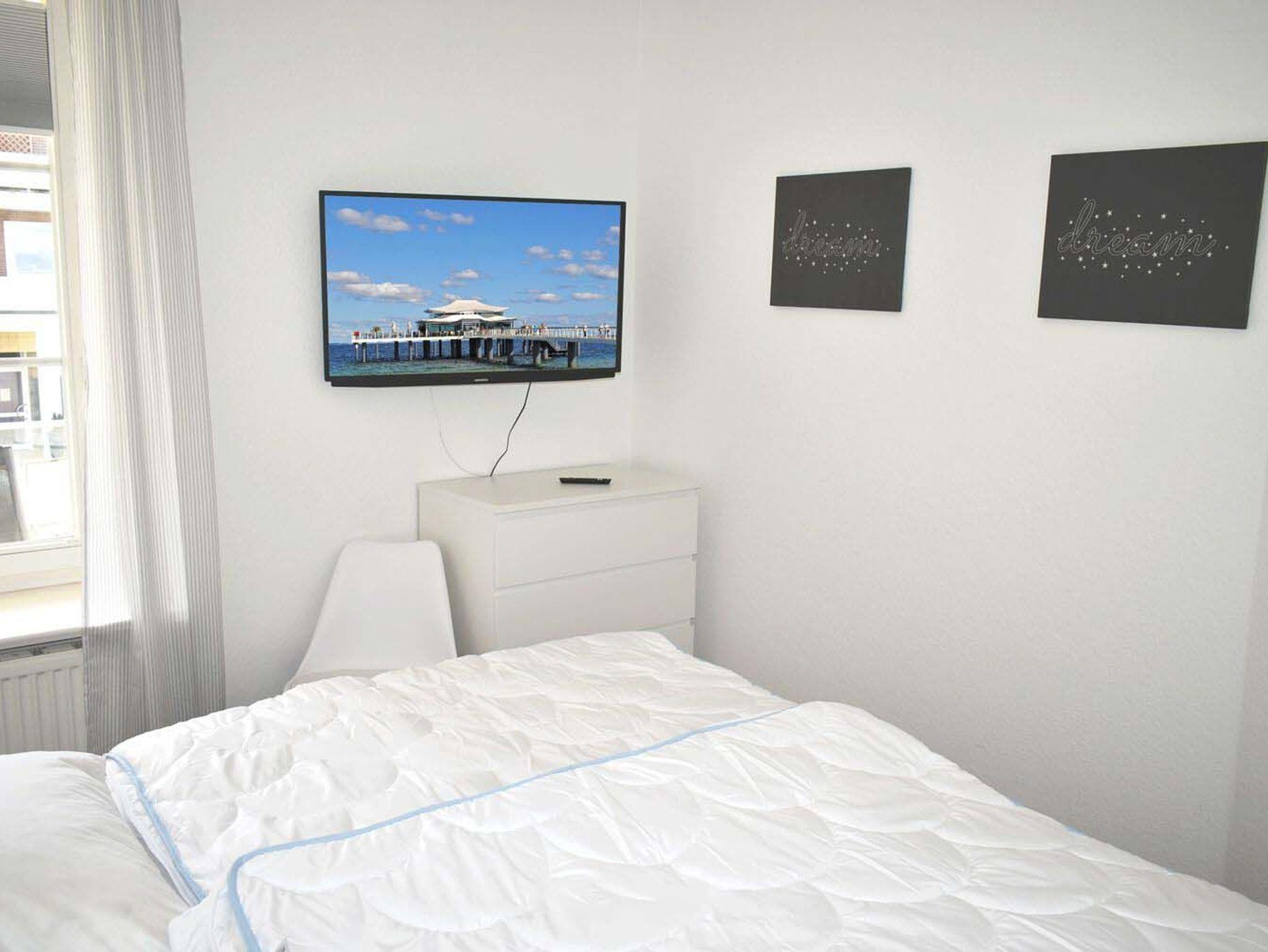 Schlafzimmer 1: 2 Matratzen, 2 Nachttische, 2 Nachttischlampen, Boxspringbett 2,00 x 1,80 m, Kommode, Stuhl, Verdunklungsplissee, wandhängender Kabel-TV Flachbildschirm