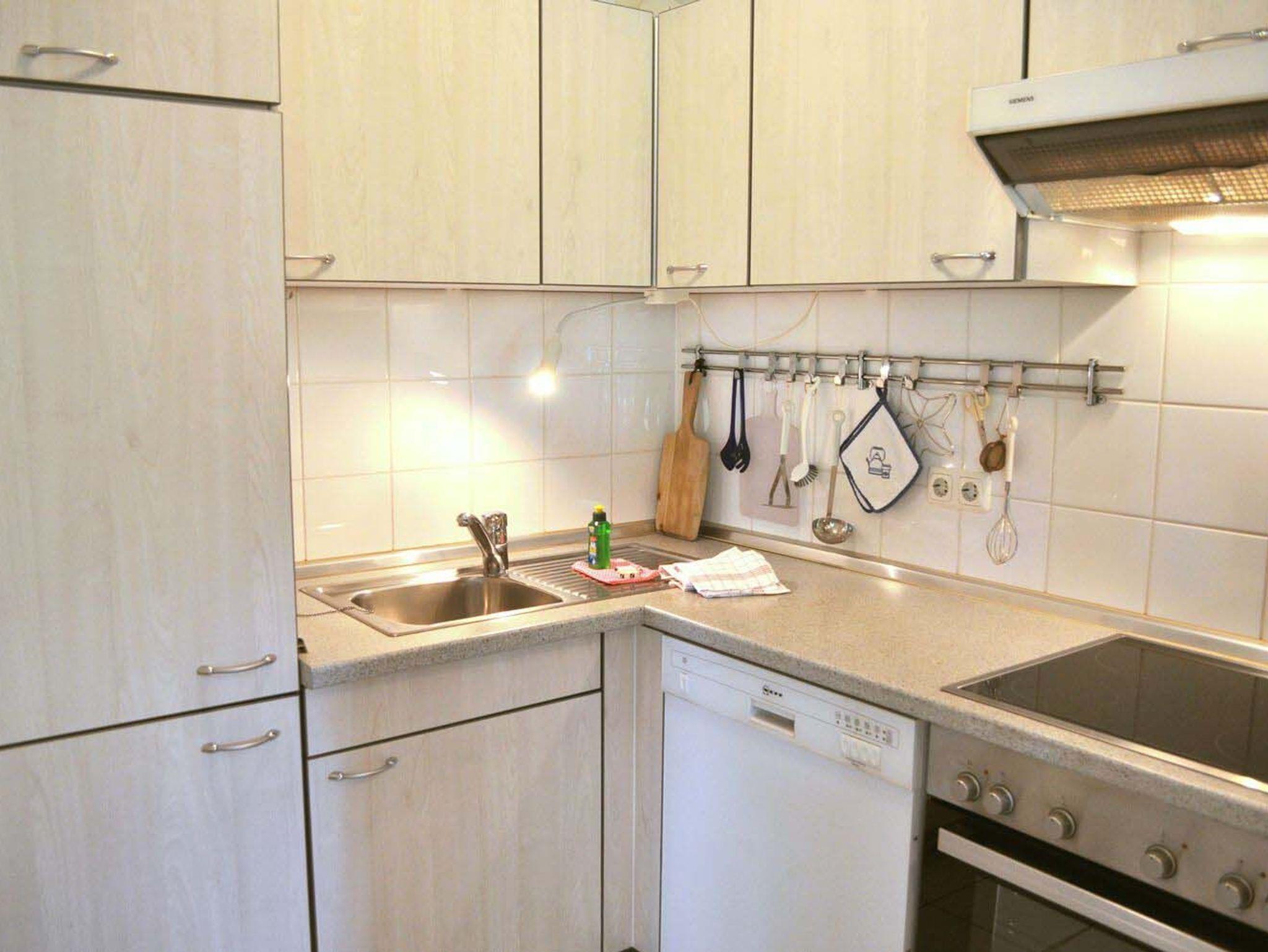 Wohnzimmer: 2 Sessel, 4 Stühle, Anrichte, Couchtisch, Einbauküche, Esstisch, Flachbildschirm, Geschirr, Kaffeemaschine, Kochtöpfe, Mikrowelle, Sat-TV, Schlafcouch, Spülmaschine, Stehlampe, Tischlampe, Toaster, Wasserkocher