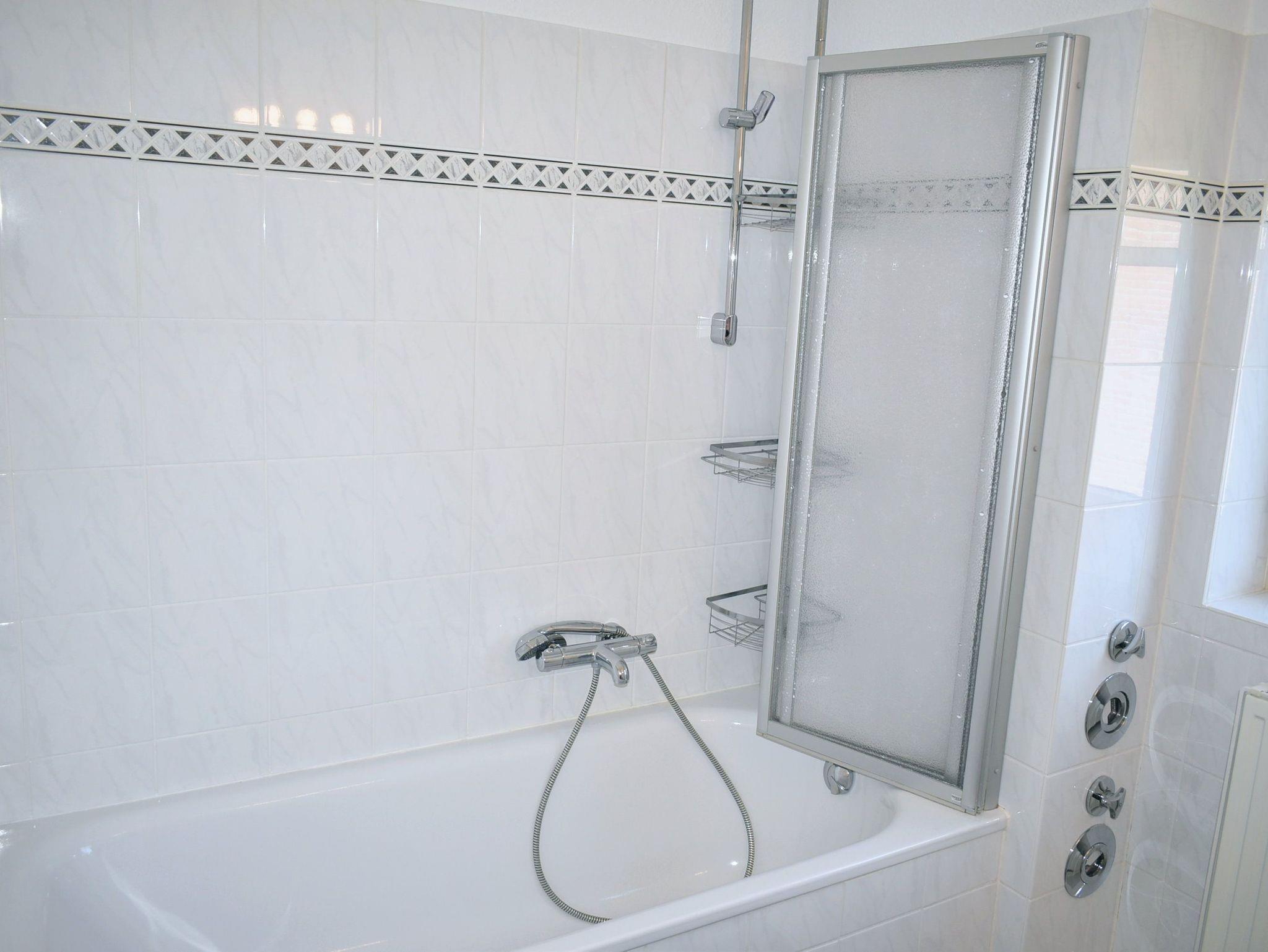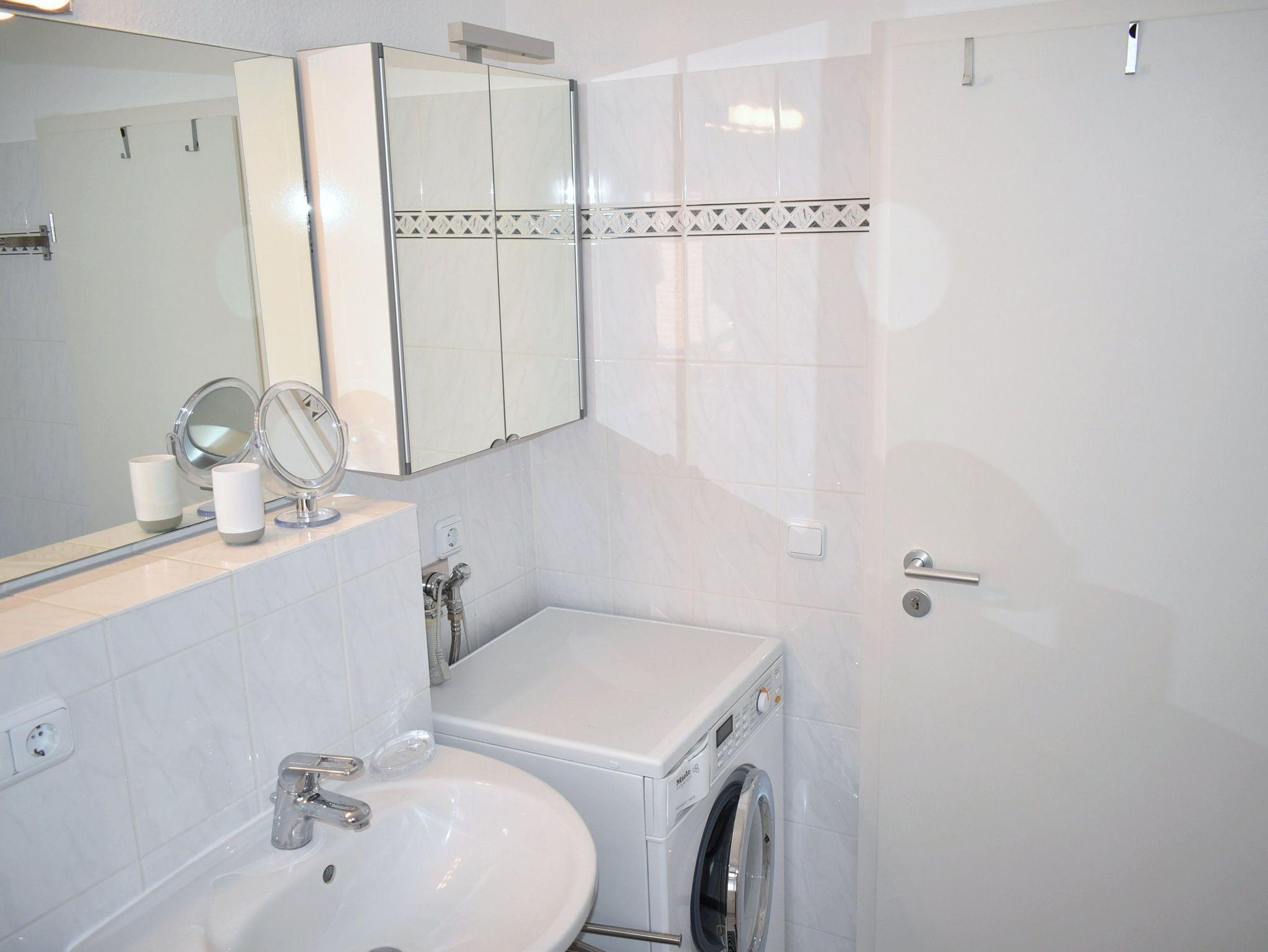 Bad 1: Badewanne, Duschwand, Hängeschrank, Spiegel, Waschbecken, Waschtrockner, WC