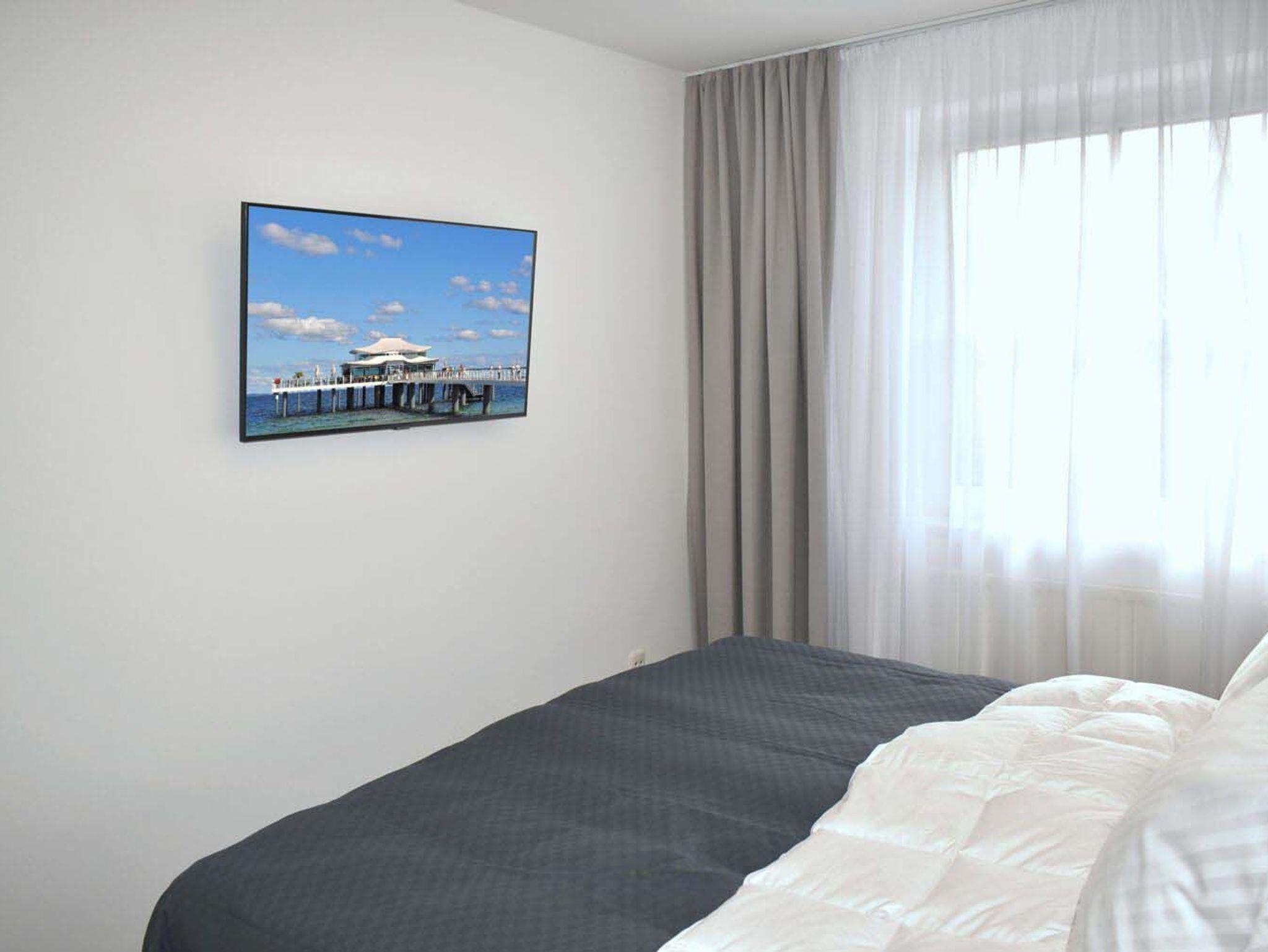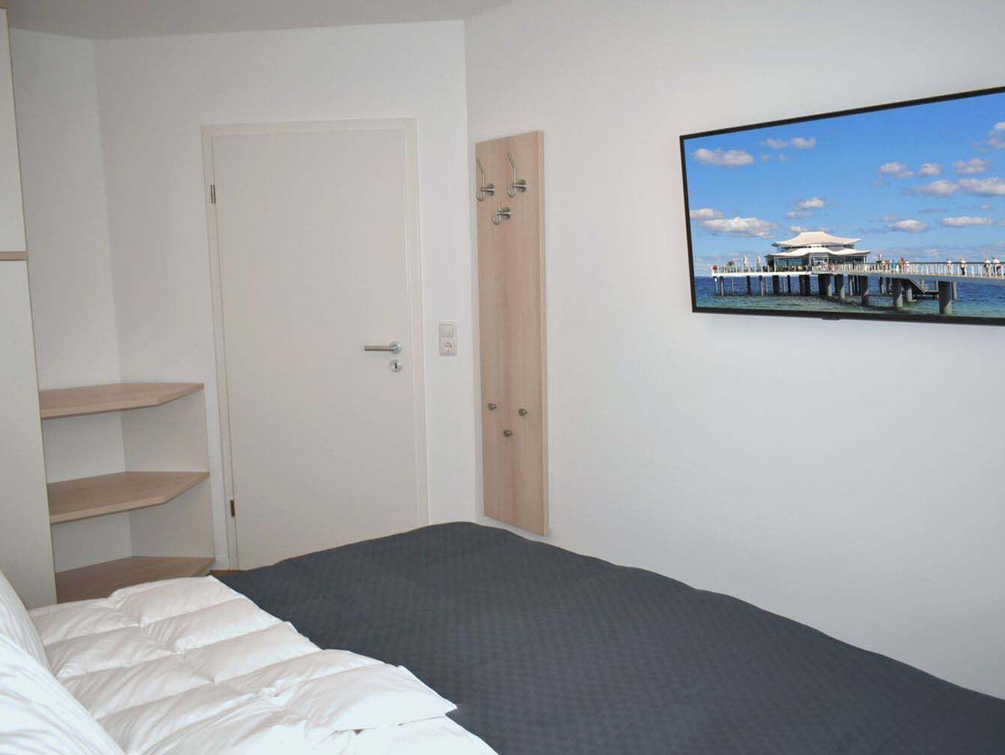 Schlafzimmer 1: 2 Nachttische, 2 Nachttischlampen, Boxspringbett 2,00 x 1,80 m, Flachbildschirm, Hakenleiste, Kleiderschrank, Regal, Sat-TV, Smart TV