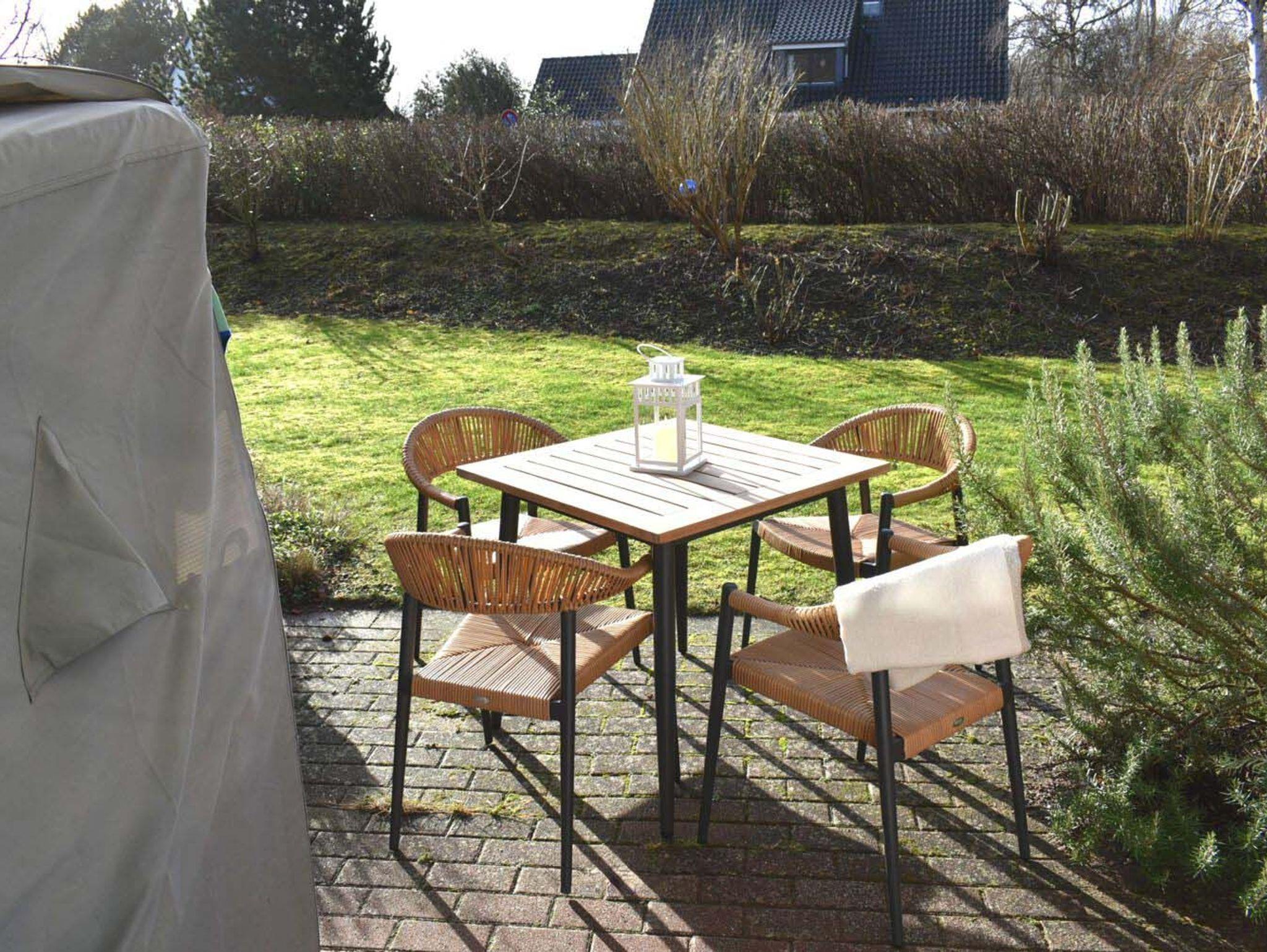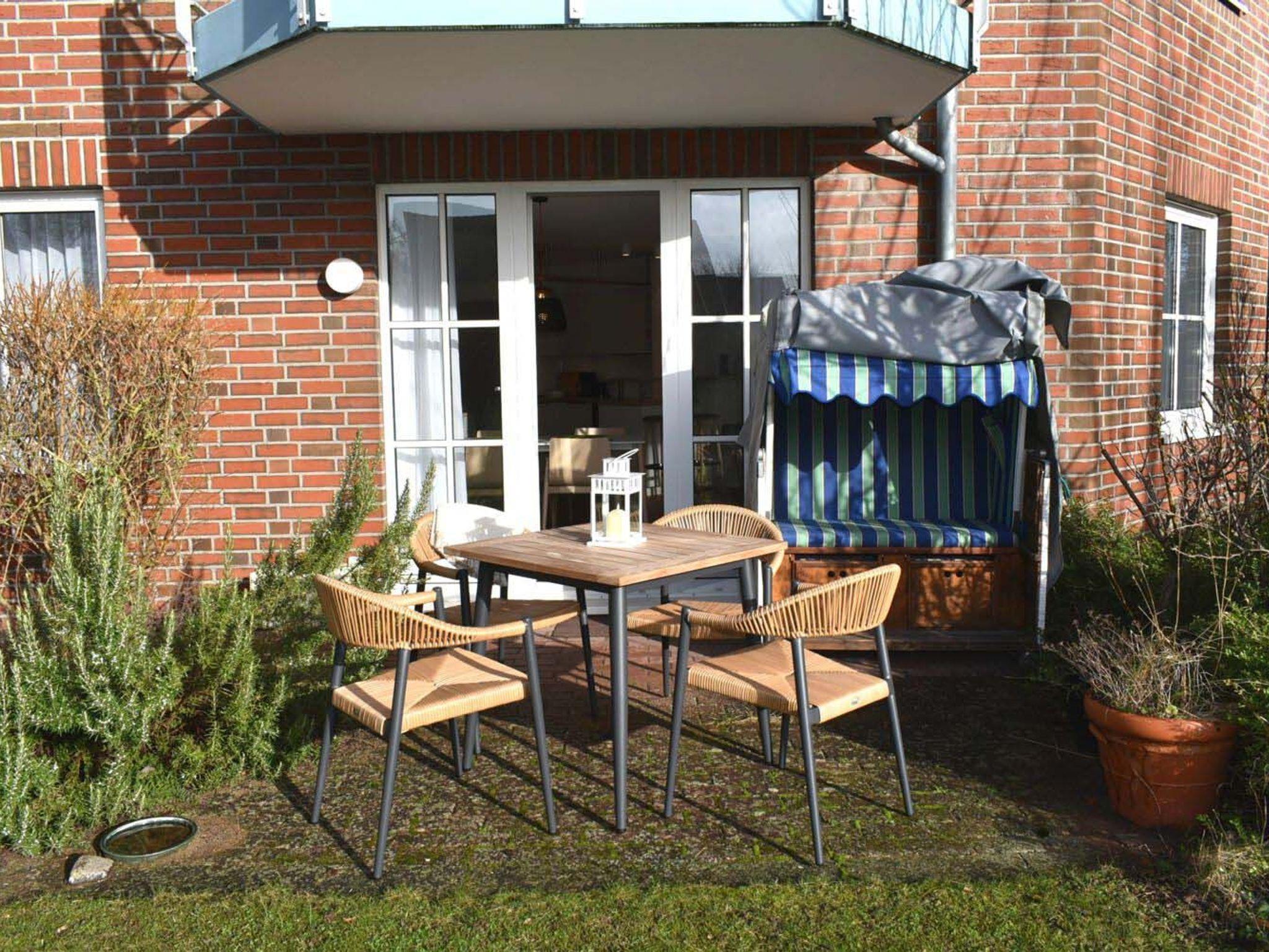 Terrasse: 4 Stühle, Strandkorb, Tisch