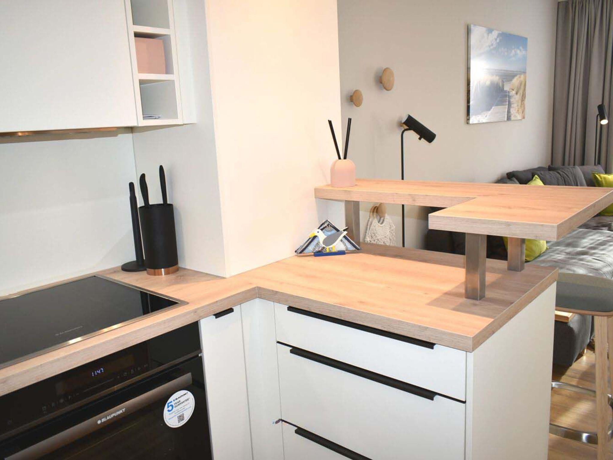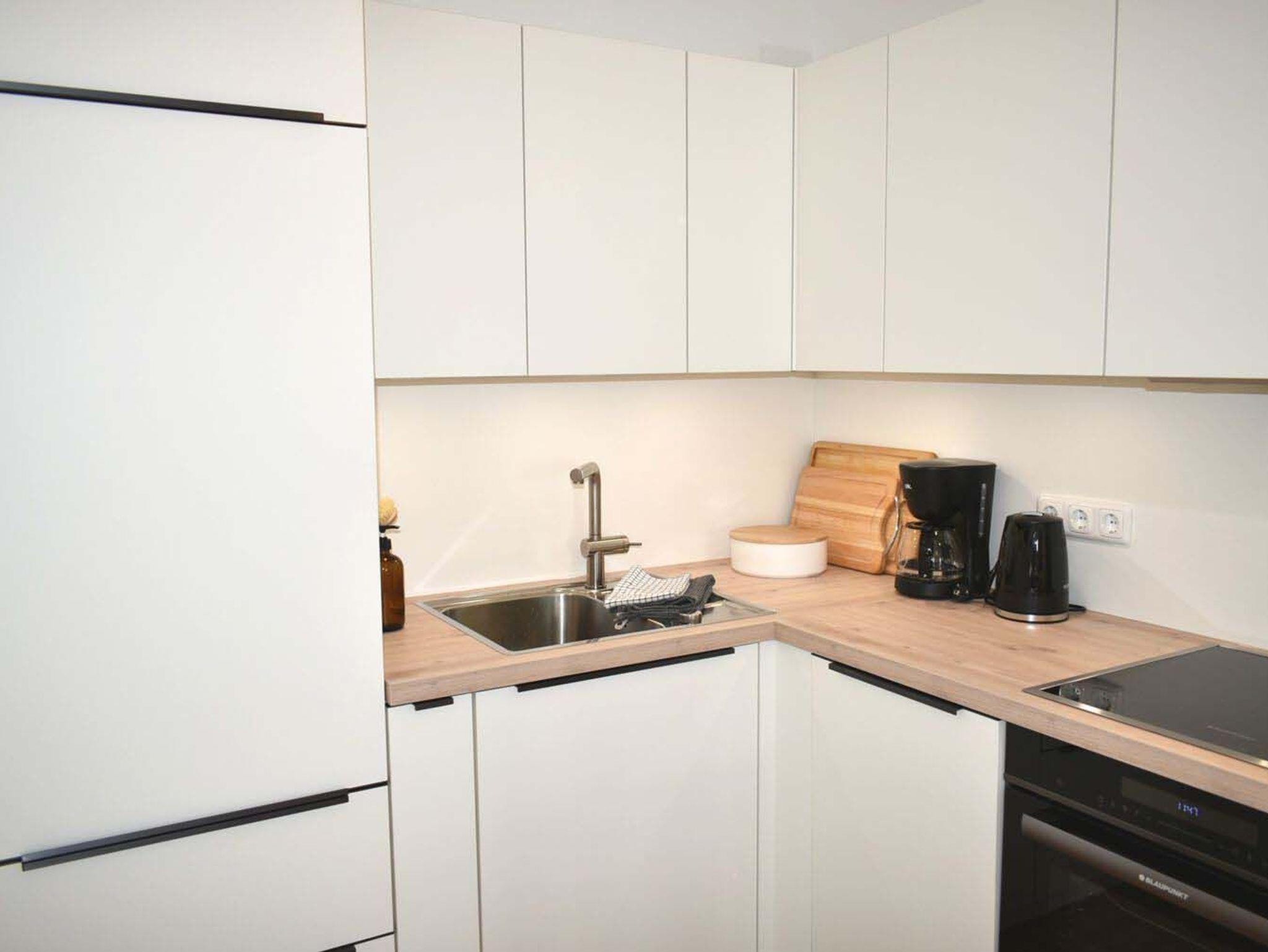 Wohnzimmer: 2 Stehlampen, 4 Plattenherd mit Backofen und Ceranfeld, 4 Stühle, Beistelltisch, Couchtisch, Dunstabzugshaube, Eckschlafcouch 2,00 x 1,40 m, Einbauküche, Esstisch, Esstresen, Flachbildschirm, Geschirr, Handmixer, Kaffeemaschine, Kochtöpfe, Kommode, Kühlschrank mit Gefrierfach, Regal, Saftpresse, Sat-TV, Smart TV, Spülmaschine, Teekanne, Tischlampe, Toaster, TV-Board, Wasserkocher