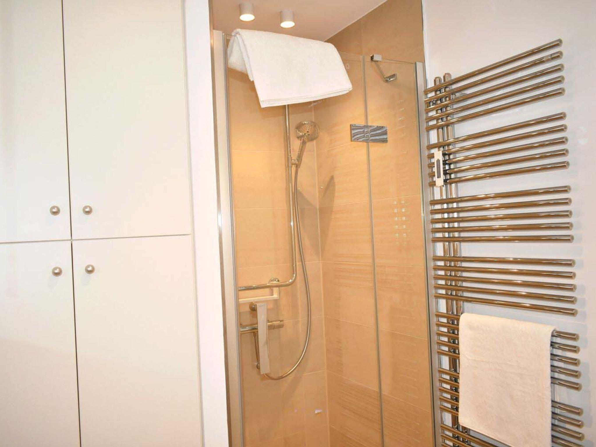 Bad 1: Duschkabine, Fön, Handtuchheizung, Regalschrank, Spiegel, Waschbecken, Waschmaschine, WC