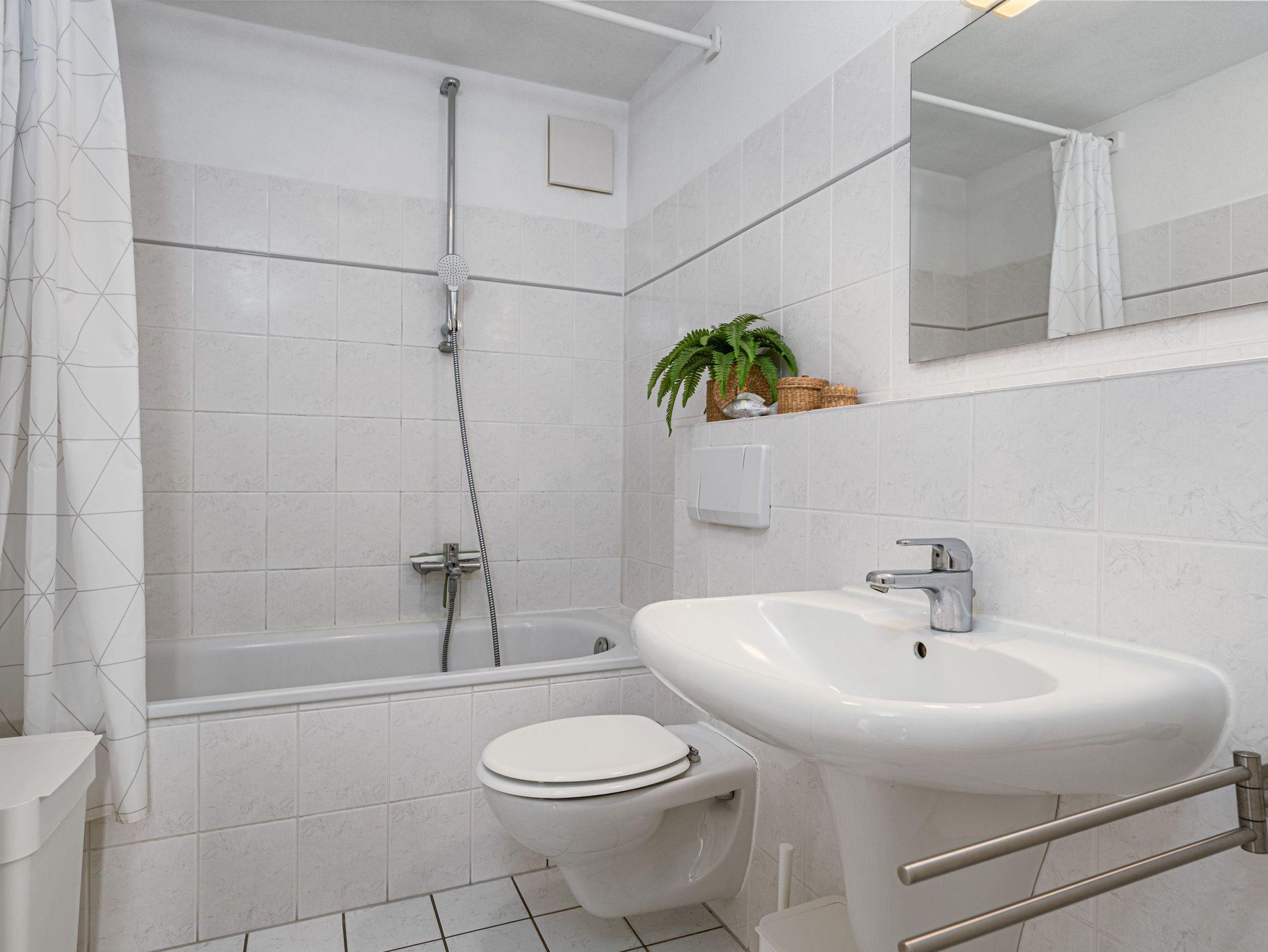 Das Badezimmer verfügt über eine Badewanne, WC und einem Föhn. Hier erfrischen Sie sich von einem schönen Tag am Strand.