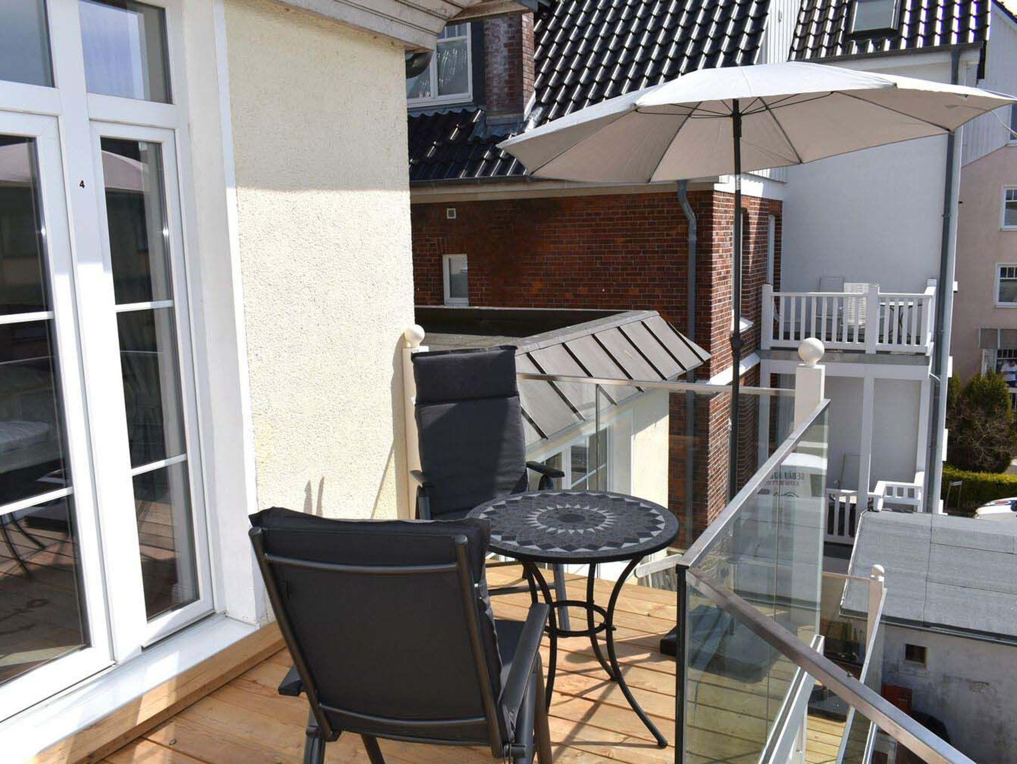 Balkon: 2 Stühle, seitlicher Meerblick, Sonnenschirm, Süd- Westlage, Tisch