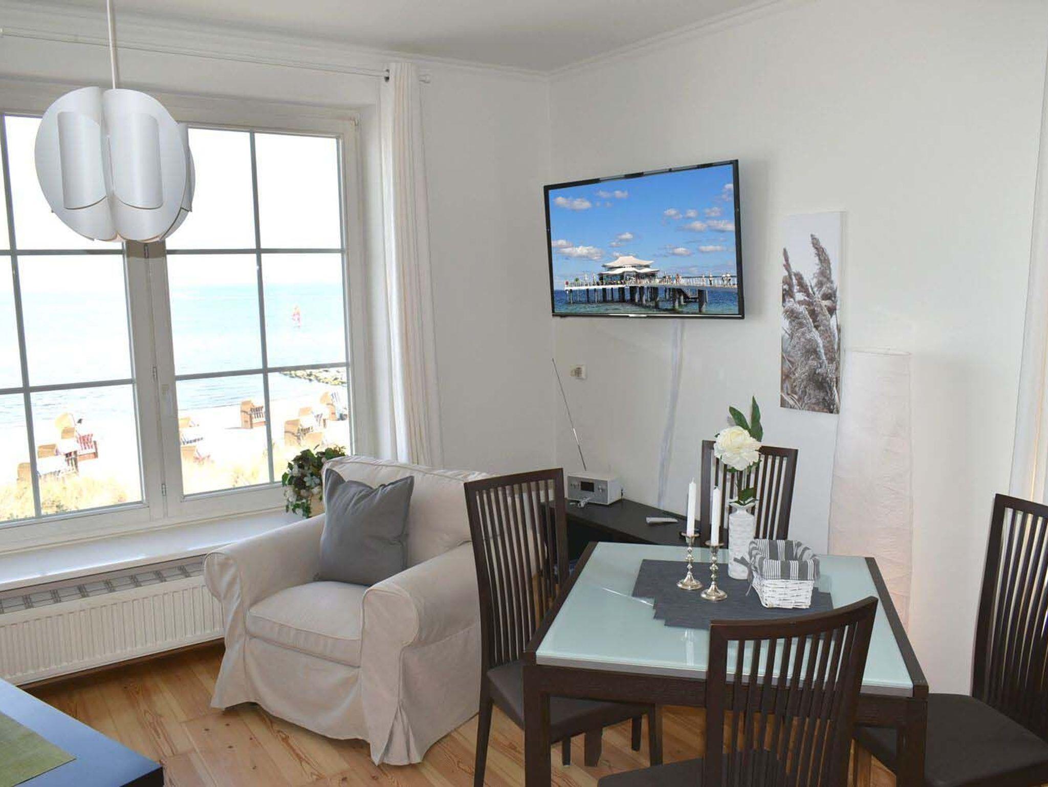 Wohnzimmer: 2 Stehlampen, 4 Stühle, Bügeleisen, Couch, Couchtisch, direkter Meerblick von der Couch und Essecke, Dunstabzugshaube, Eierkocher, Einbauküche, Esstisch, Induktionskochfeld, Kaffeemaschine, Kaffeemaschine Delonghi, Kochtöpfe, Küchentresen, Kühlschrank mit Gefrierfach, Sessel, Smart TV, Spülmaschine, Stereoanlage mit USB-Port, Toaster, TV-Unterschrank, wandhängender Kabel-TV Flachbildschirm, Wasserkocher