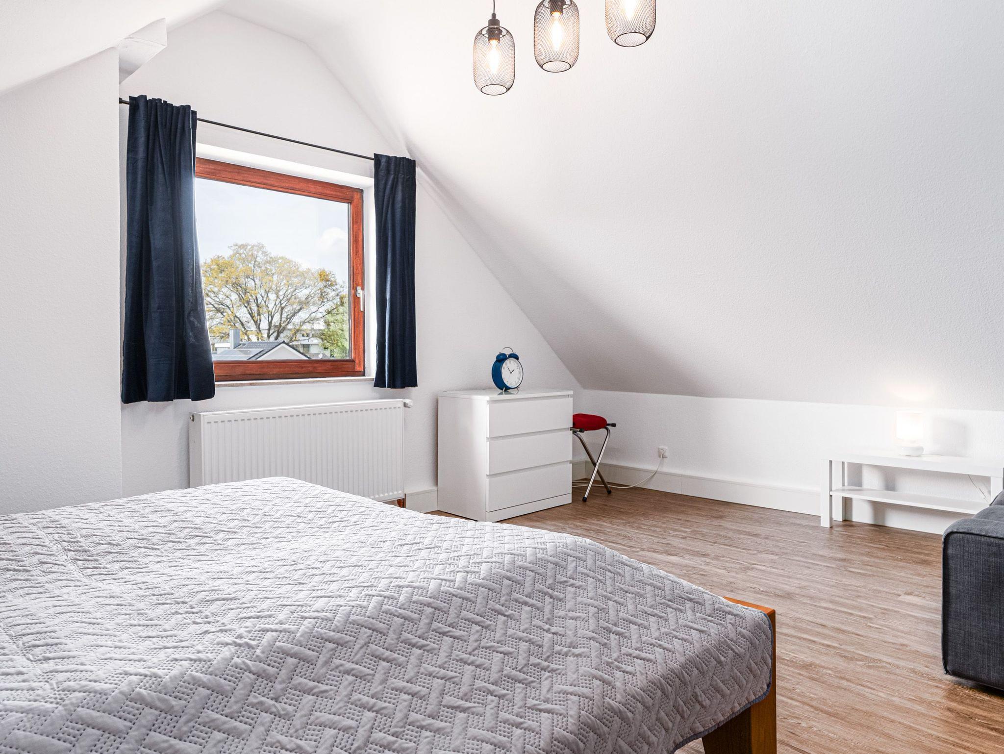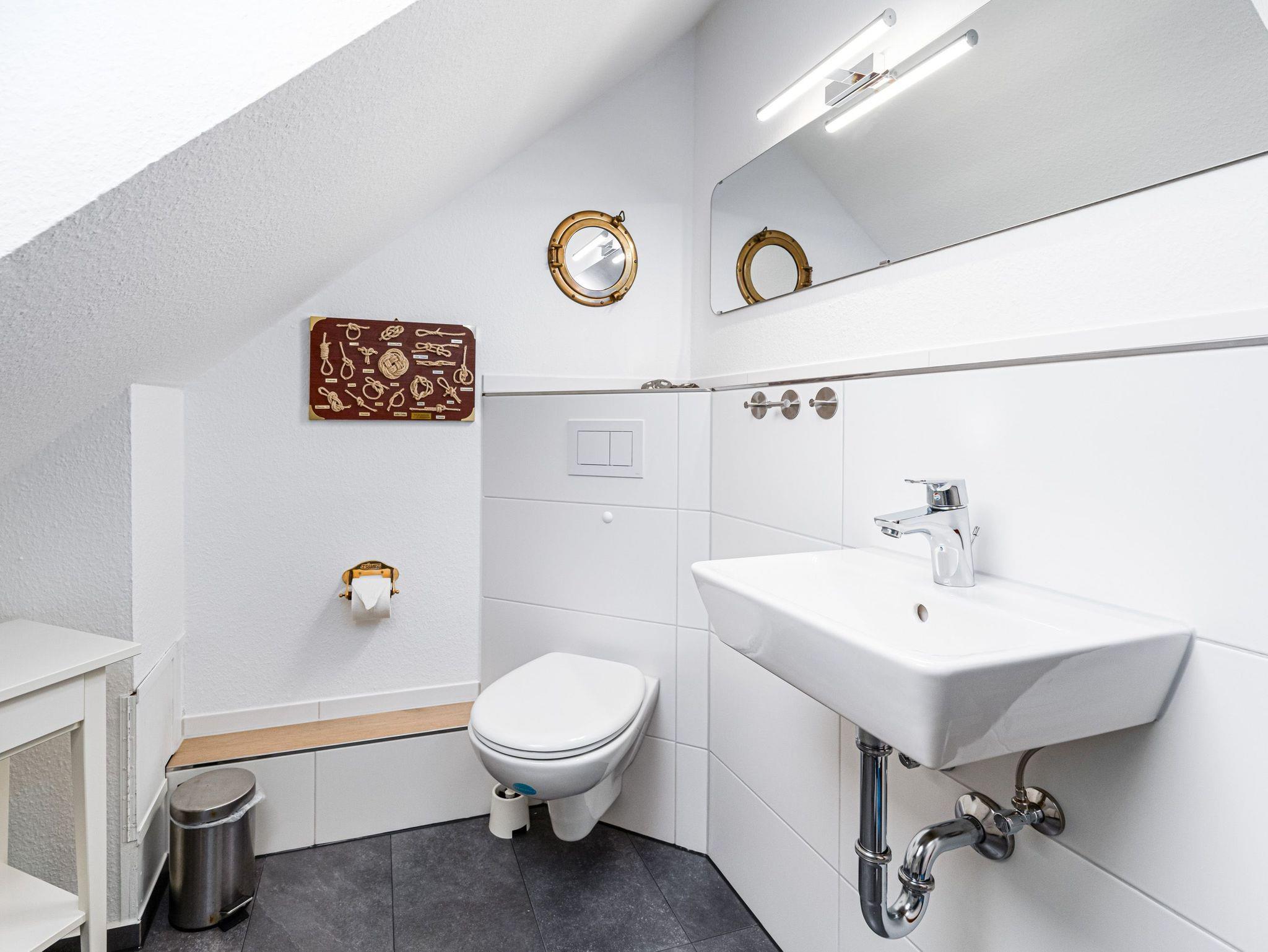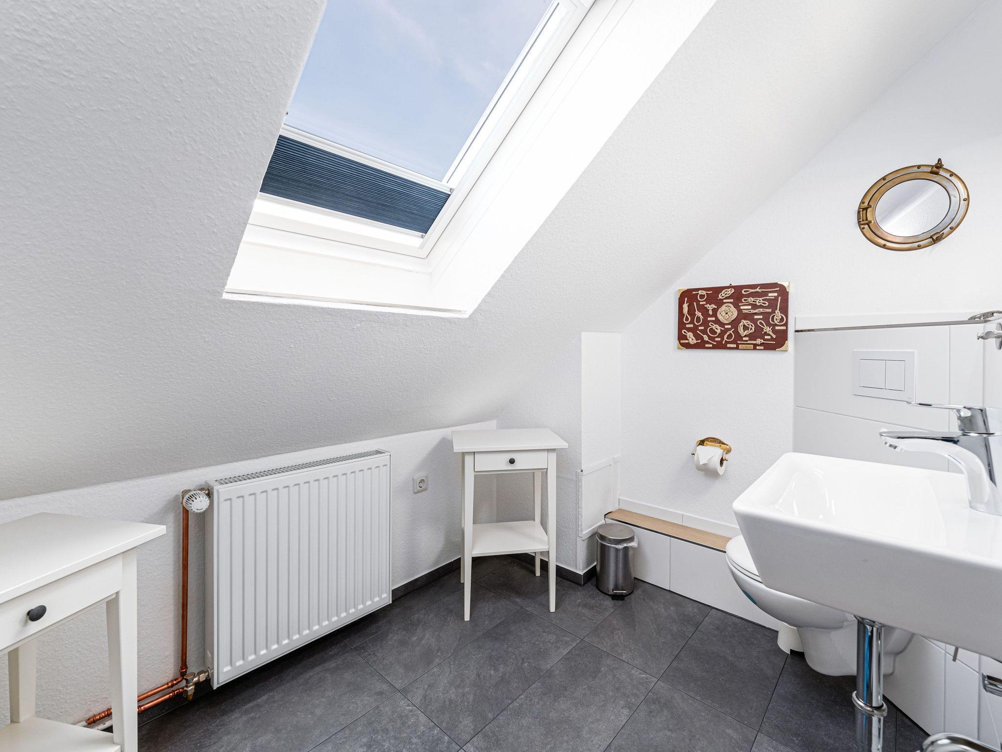 Zusätzlich befindet sich auf der unteren Ebene ein Badezimmer mit Badewanne und Waschmaschine sowie ein Schlafzimmer mit zwei Einzelbetten. Auf der oberen Etage steht Ihnen ein weiteres Schlafzimmer mit großem Doppelbett sowie einem Einzelbett und ein Gäste-WC zur Verfügung.
