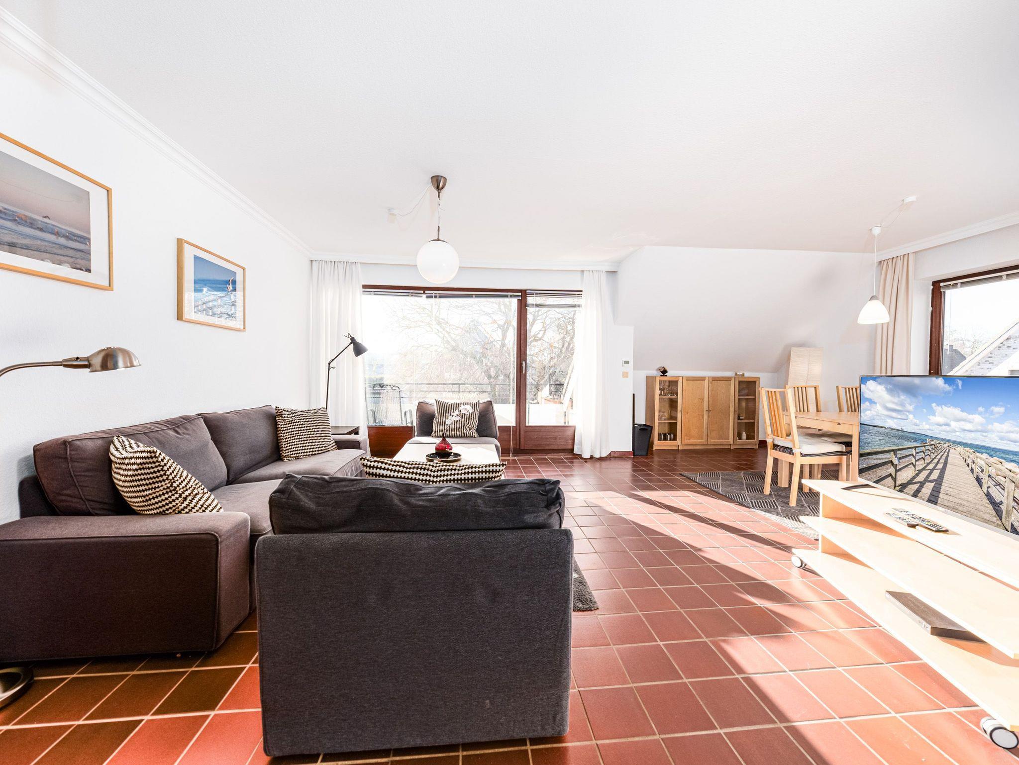 Der große Wohnraum verfügt über eine bequeme Sofagarnitur mit TV und einen großzügigen Essbereich. Hier können Sie auch ausgelassene Spielesessions mit der ganzen Familie genießen. Von hier aus betreten Sie auch den schön ruhig gelegenen Balkon, auf dem Sie die Sonne und die frische Ostseeluft in vollen Zügen genießen können. Die separate Küche ist mit einem Backofen, Mikrowelle und einem Geschirrspüler gut ausgestattet und lädt zum gemeinsamen Kochen ein.