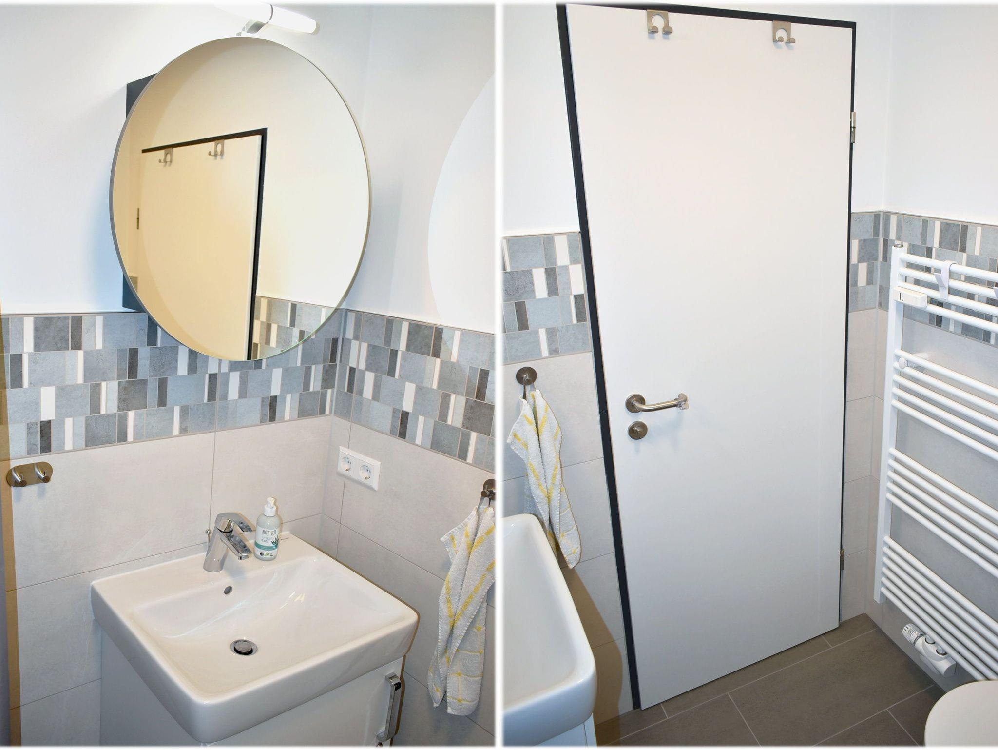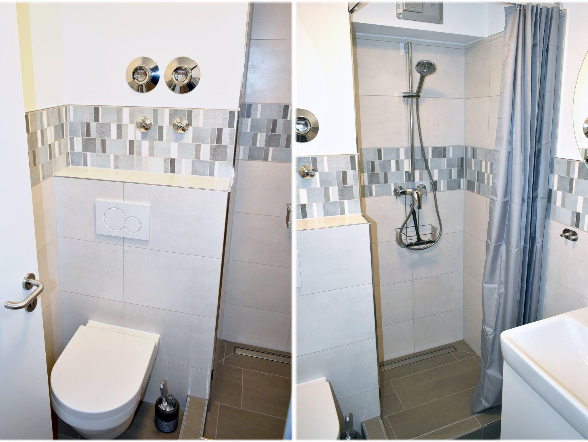 Bad 1: Dusche, Spiegel, Unterschrank, Waschbecken, WC
