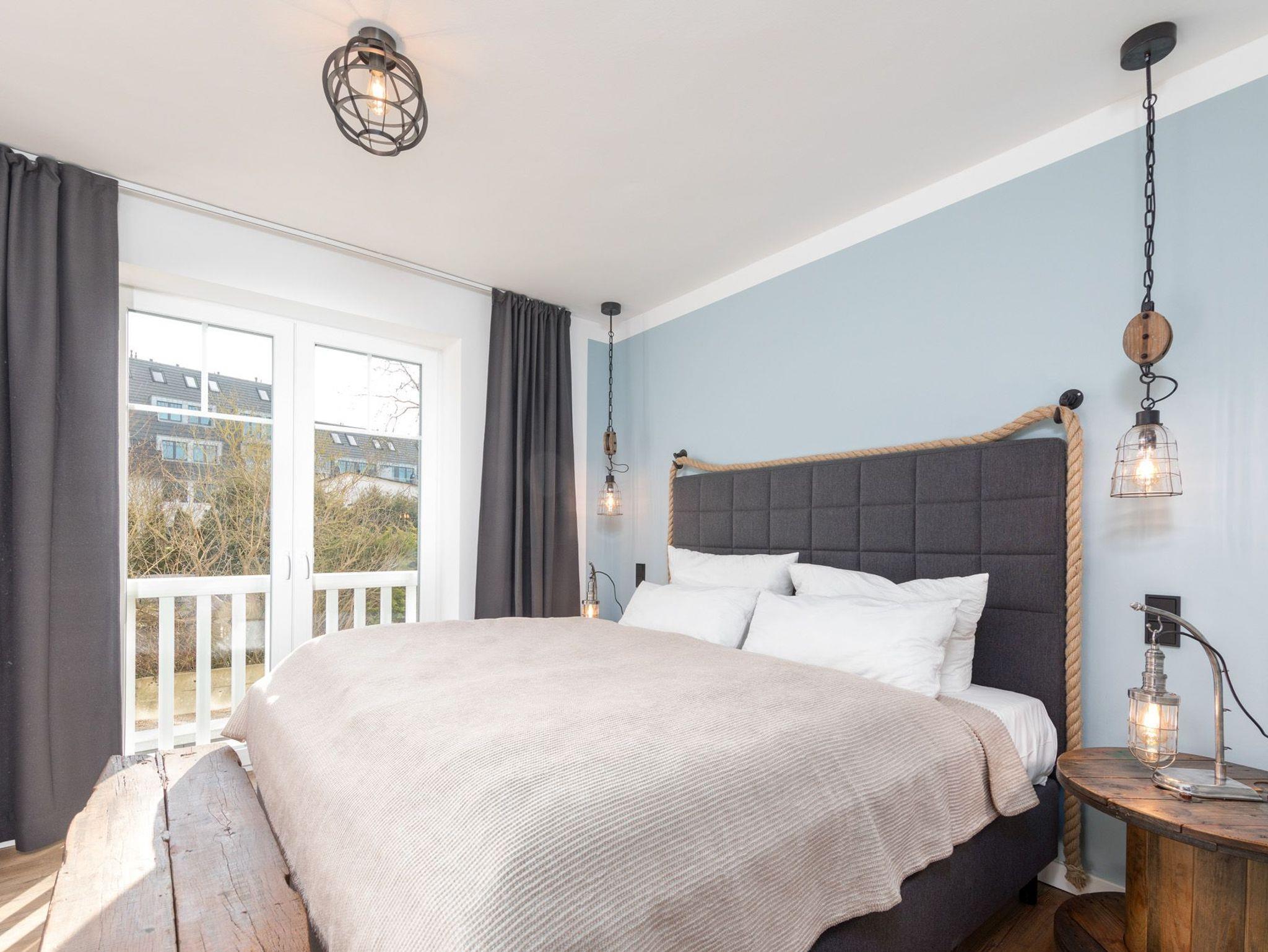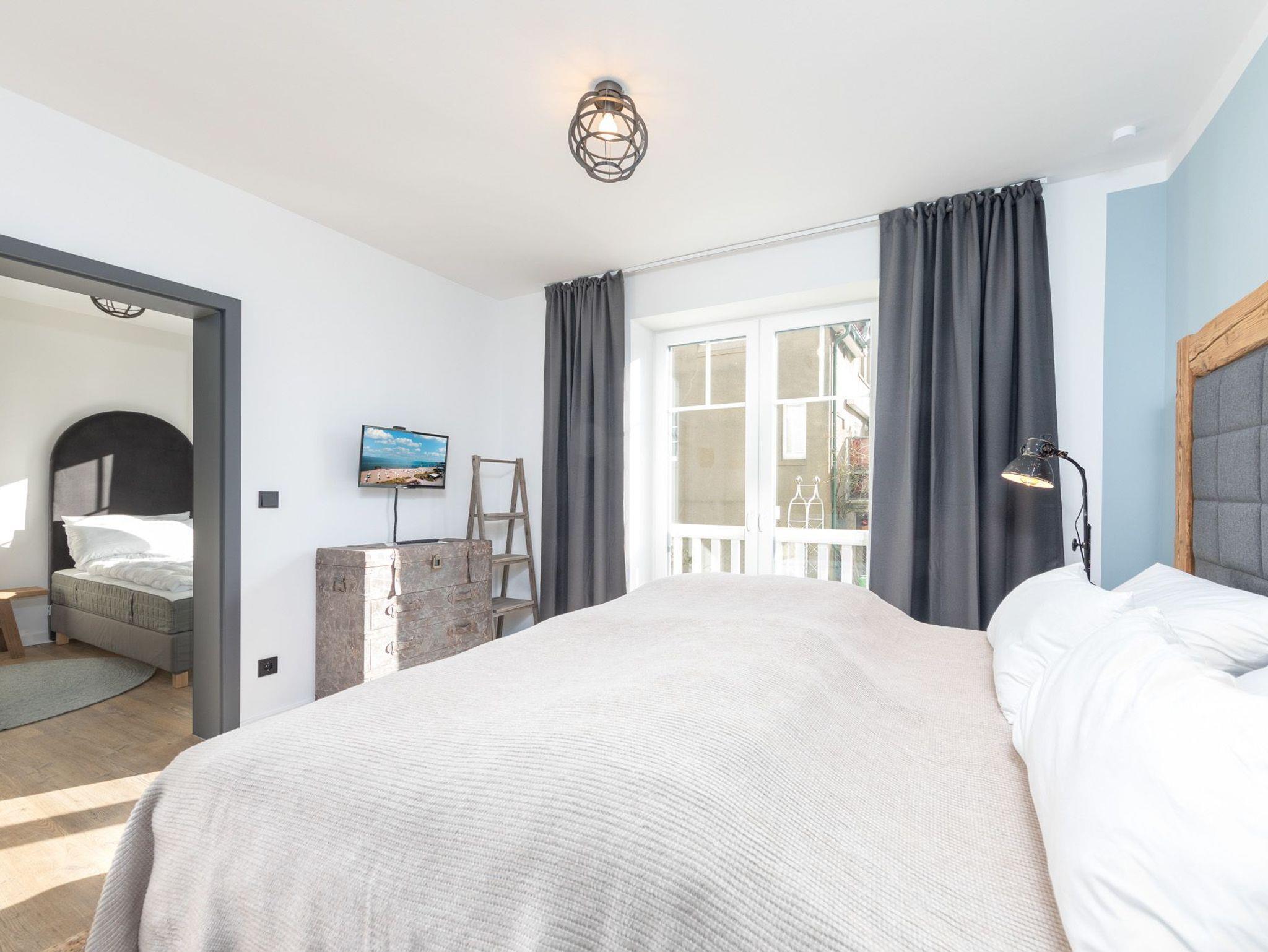 Das Appartement Käptn Muuss bietet auf 112m² viel Platz für bis zu 6 Personen. Im lichtdurchfluteten und modern eingerichteten Wohn- und Essbereich mit integrierter Küchenzeile lassen sich wunderschöne Urlaubstage verbringen. Neben einer Sofalandschaft mit Flachbild-TV und einer Musikanlage steht Ihnen ein schöner Essbereich mit Zugang zum nach Süden ausgerichteten und sehr geräumigen Balkon zur Verfügung. Die hochwertig eingerichtete Einbauküche lässt keine Wünsche offen. Ein Geschirrspüler, ein Backofen und eine Nespresso-Kaffeemaschine gehören zur Ausstattung. Zwei der drei Schlafzimmer sind mit hochwertigen Boxspring- / Doppelbetten (1 x 180 cm x 200 cm) und das dritte Schlafzimmer mit zwei Boxspring- / Einzelbetten (90 cm x 200 cm) eingerichtet. Das dritte Schlafzimmer erreichen Sie durch ein weiteres Schlafzimmer mit Doppelbett.